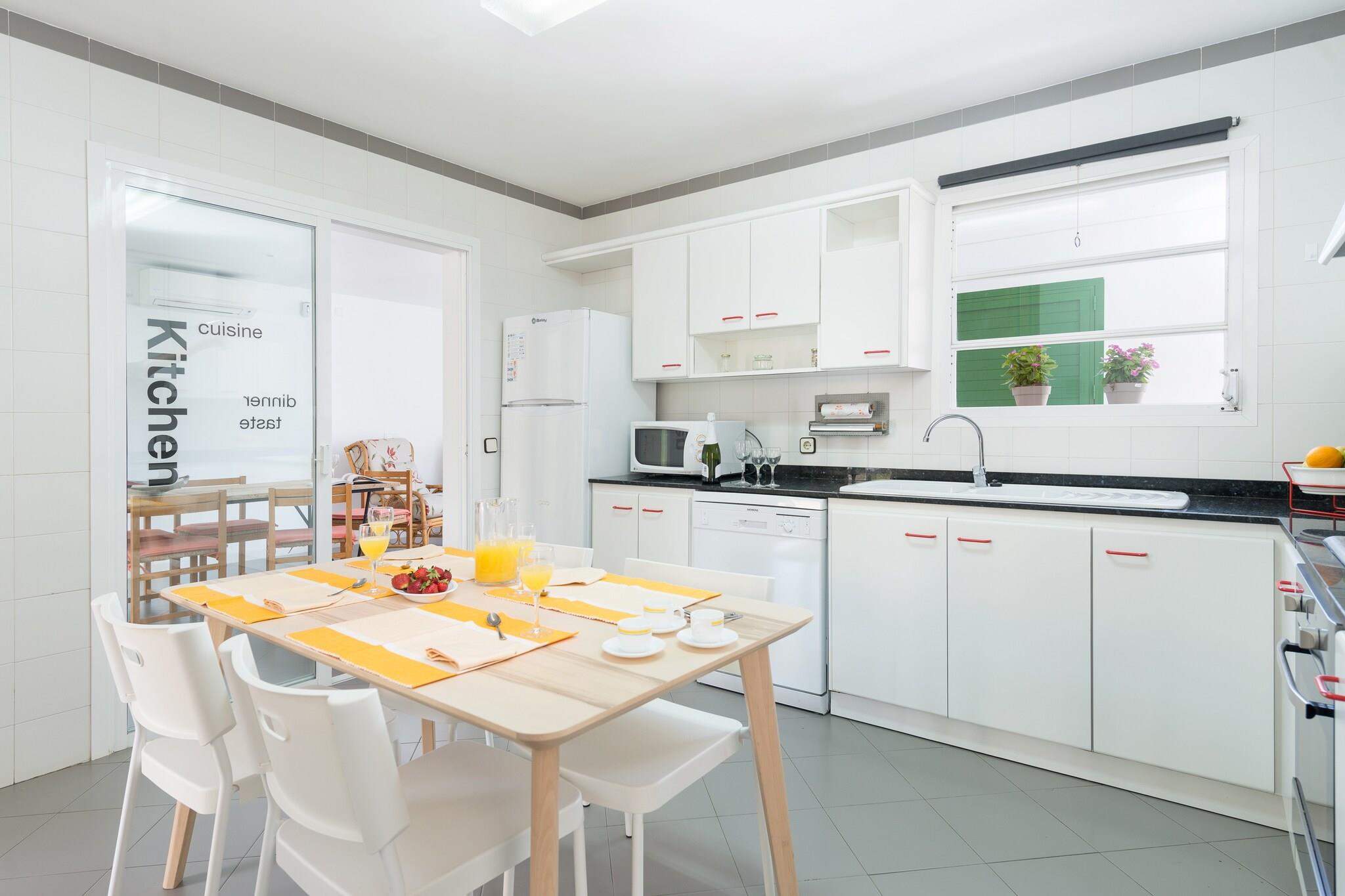 Stue, spisestue, Køkken(komfur, kaffemaskine, ovn), soveværelse(enkeltseng, enkeltseng), soveværelse(enkeltseng, enkeltseng), soveværelse(dobbeltseng), soveværelse(dobbeltseng), badeværelse, badeværelse, mikrobølgeovn, opvaskemaskine , køle-fryseskab, badekar, bruser, håndvask, håndvask, toilet, toilet, klimaanlæg, klimaanlæg, klimaanlæg, klimaanlæg, have, havemøbler, 4x solstole, grill, barneseng, barnestol