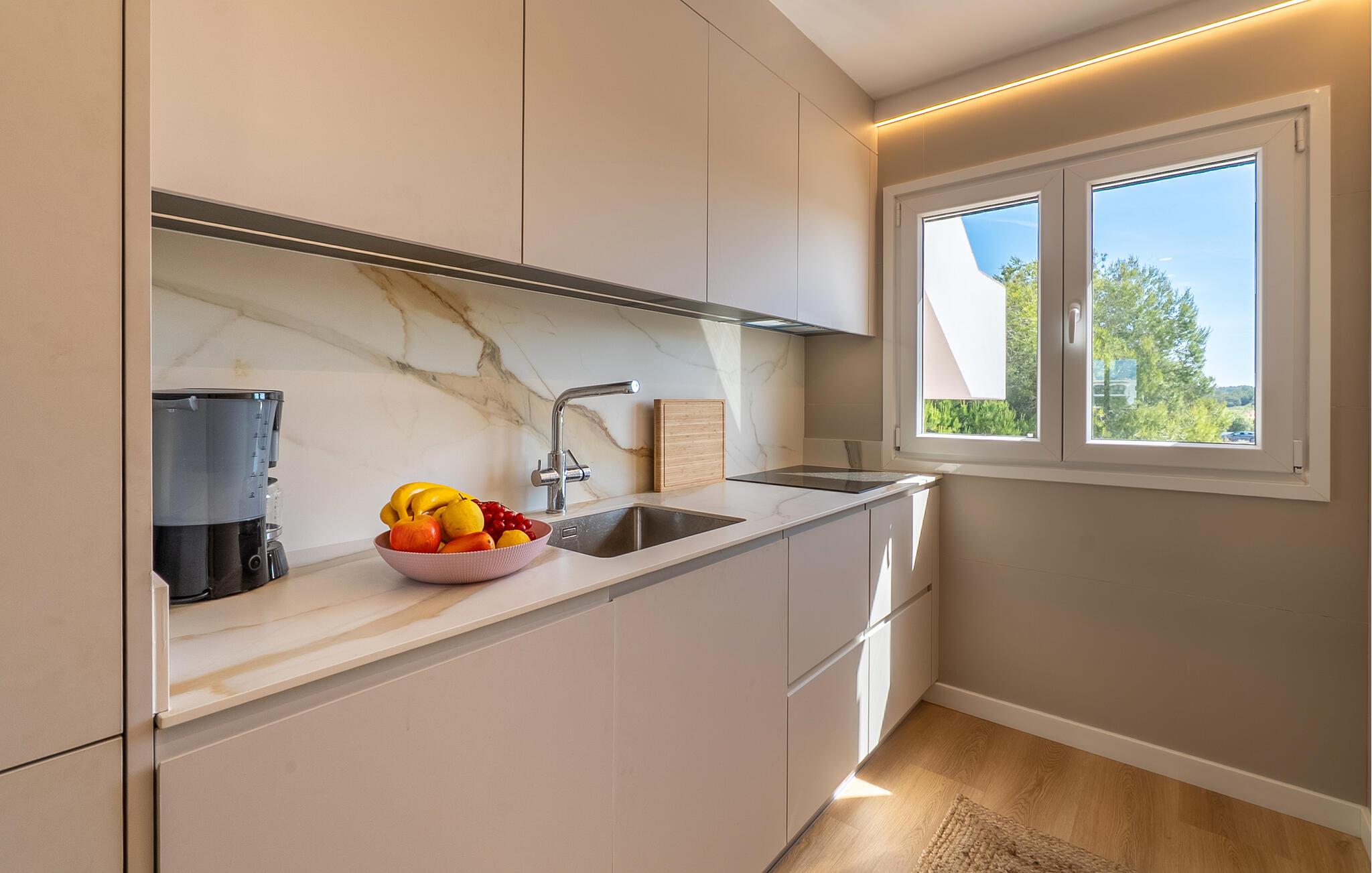 Denne ferielejlighed har et afslappende ophold på Mallorca. Det smagfulde interiør er noget særligt med sit klare og klassiske design i lyse, venlige farver. Slap af på de komfortable sofaer i opholdsstuen og nyd rolige aftener med at se tv eller spille spil sammen. Tilbered lækre retter i det moderne køkken og nyd dem ved det stilfulde spisebord.