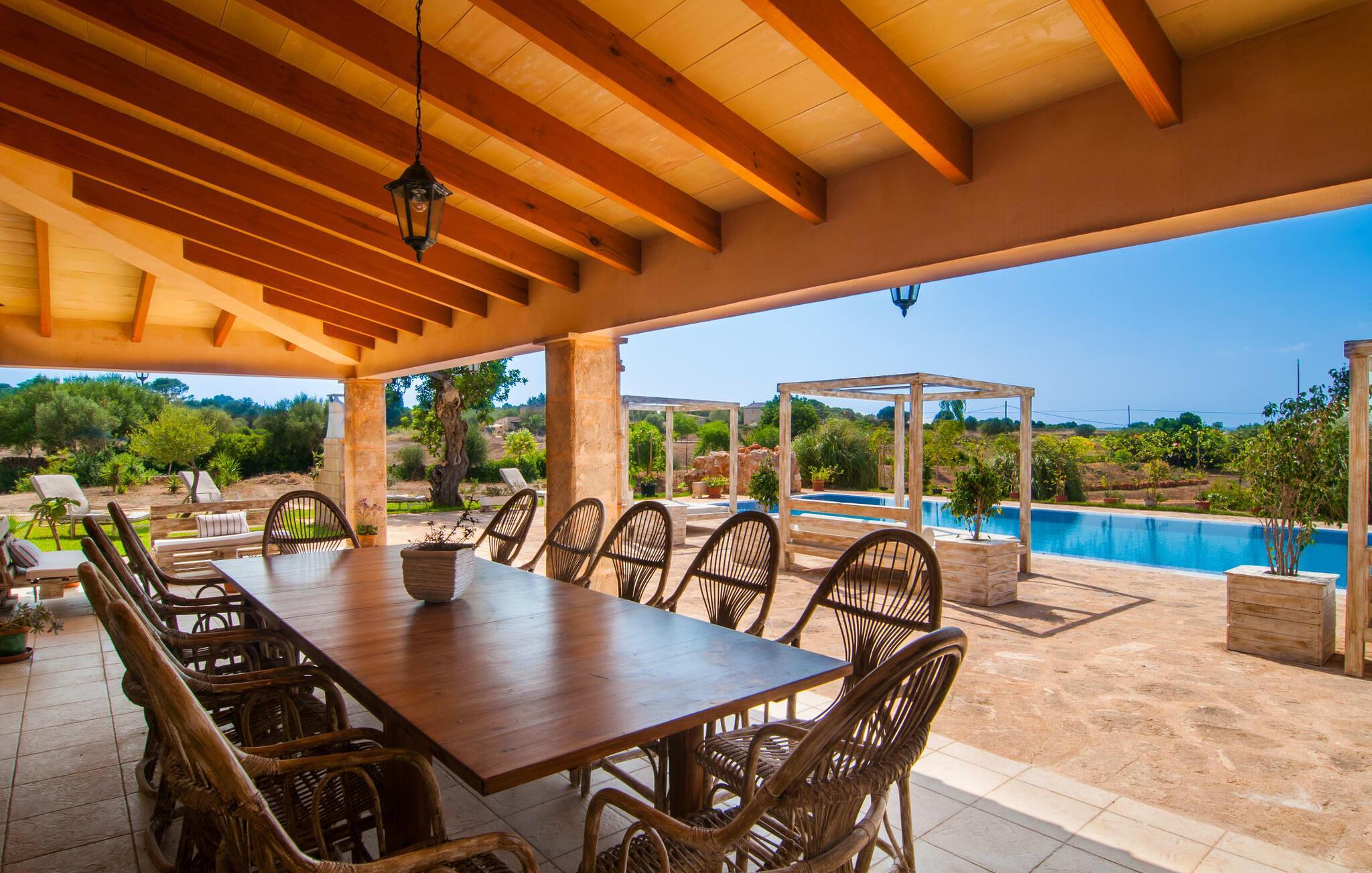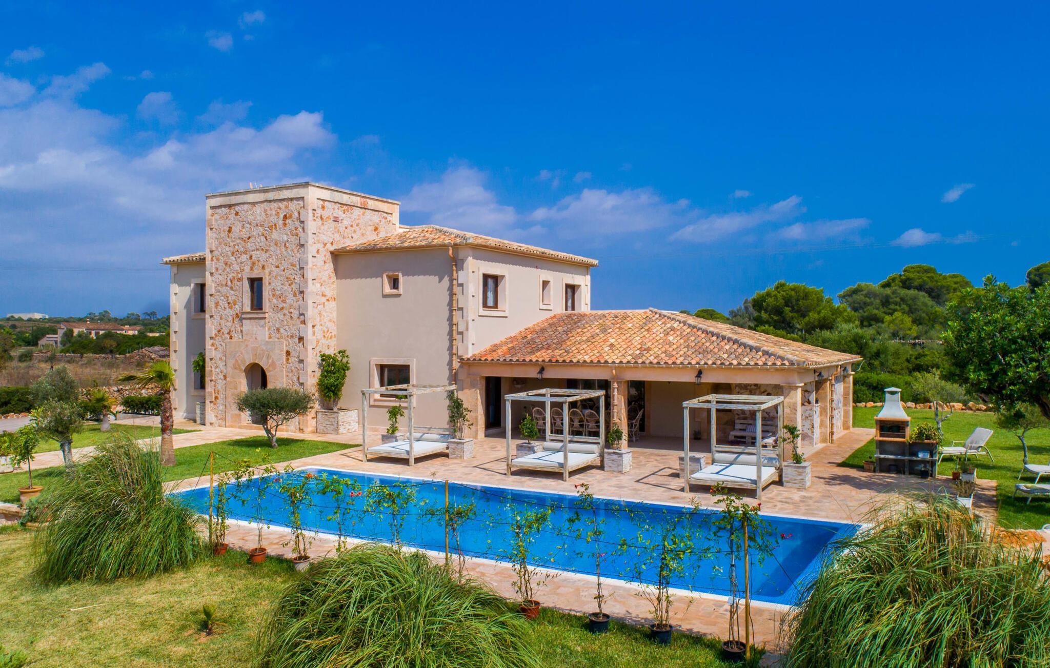 Denne unikke, store villa på parklignende grund er nem at nå. Enhver, der tilbringer deres ferie her, vil bestemt ikke gå glip af faciliteter. Den førsteklasses forbindelse via motorvejen kombineret med de ellers vidunderlige landlige omgivelser forsøder ferieoplevelsen med den ukomplicerede ankomst. Haven kan beskrives som en park og byder på det perfekte sted at slappe af midt i den grønne oase under dit ophold. En lille sti omkranset af en smuk græsplæne fører til det statelige indgangsparti med den vidunderligt byggede buegang. Til højre er den glitrende pool, omgivet af palmer og den storslåede solterrasse, komplet med rigtig hyggelige himmelsengslignende daybeds lavet af rustikt, hvidkalket træ. Her kan vi lade det nøje udvalgte havedesign og det veludstyrede wellnessområde tale for sig selv. Moderne design møder den moderne version af middelhavsregionens typiske rustikke stil. Lige ved siden af solterrassen er der et overdækket og derfor skyggefuldt spise- og afslapningsområde. Langbordet er perfekt til morgenmad sammen; Du kan nyde dagens første kaffe på en af de skønne bambusstole. Et andet solrigt sted er højt oppe på den lille tagterrasse, som er tilgængelig fra soveværelset. Det er nok det bedste sted at tilbringe aftentimerne sammen under stjernerne. Inde i villaen fortsætter harmonien af bløde farver, klare former og klassiske elementer. Efter at have krydset en lille gang skinner det åbne opholds- og spiseområde i enkel elegance og har et topmoderne køkken som et højdepunkt. Madlavning er garanteret en himmelsk fornøjelse. Når køkkenet er erobret, kan du feste og nyde som du vil i de to vidunderligt møblerede spisepladser. Stuen, indrettet i varme farver, er klar til lange hyggelige aftener. Om du nyder livlige samtaler over en god flaske vin eller bare en fælles filmoplevelse er op til dig! Soveværelserne, som er placeret i stueetagen og første sal, lader heller intet tilbage at ønske. De gode senge inviterer dig til at sove og slappe af, indtil du bliver vækket af solens stråler næste morgen. De individuelt designede en-suite badeværelser er ægte templer af skønhed og imponerer med deres udsøgte møbler og originale smag. Fra farverige mosaikker til lige, mørke fliser – variation er mottoet her. Nu skal du bare beslutte dig, og wellness-programmet kan begynde. Hvad mere har du brug for for at være glad? Den landlige beliggenhed parret med de fremragende forbindelser og nærhed til havet gør villaen "Colonia Es Trenc" til den perfekte feriedestination. Ejendommen er beliggende direkte på den let hørbare Ma-6040 motorvej, som hurtigt bringer dig til den smukke kystby Colònia Sant Jordi (en tidligere fiskerby med typisk mallorcinsk charme). Der er mange restauranter, barer og caféer på havnepromenaden og i byen er der alt hvad du behøver, lige fra supermarkeder til banker og apoteker. At besøge det ugentlige marked er et must for alle, der ønsker at fordybe sig i det typiske mallorcanske liv, og en gåtur gennem byen er bestemt det værd. Der er bogstaveligt talt lige så mange bademuligheder, som der er sand på stranden. I bil kan du nå de fineste sandstrande i de smukkeste omgivelser på få minutter. Den absolut højkvalitets og smukt indrettede villa "Colonia Es Trenc" ligger i den smukke sydlige del af De Baleariske Øer, nær Campos kommune. Beliggenheden scorer point med sine fremragende forbindelser og det landlige miljø, der omgiver den parklignende ejendom. Køreturen til den næste by, Colònia Sant Jordi, er kun omkring 4 km, og det nærmeste supermarked ligger 3 km væk. De nærmeste strande såsom "Platja es Trenc" eller "Can Curt" ligger kun omkring 3 km væk. Bemærk venligst, at denne ejendom ikke accepterer ungdomsgrupper eller polterabender. En ungdomsgruppe på denne ejendom består af personer på 25 år eller derunder. Book ikke denne ejendom, hvis du er en ungdomsgruppe eller en polterabendgruppe, da din reservation vil blive afvist, når den er booket, hvilket også kan være tilfældet ved ankomst til ejendommen eller under dit ophold, og du vil ikke modtage en refusion. Dette er et Fincallorca feriehus.