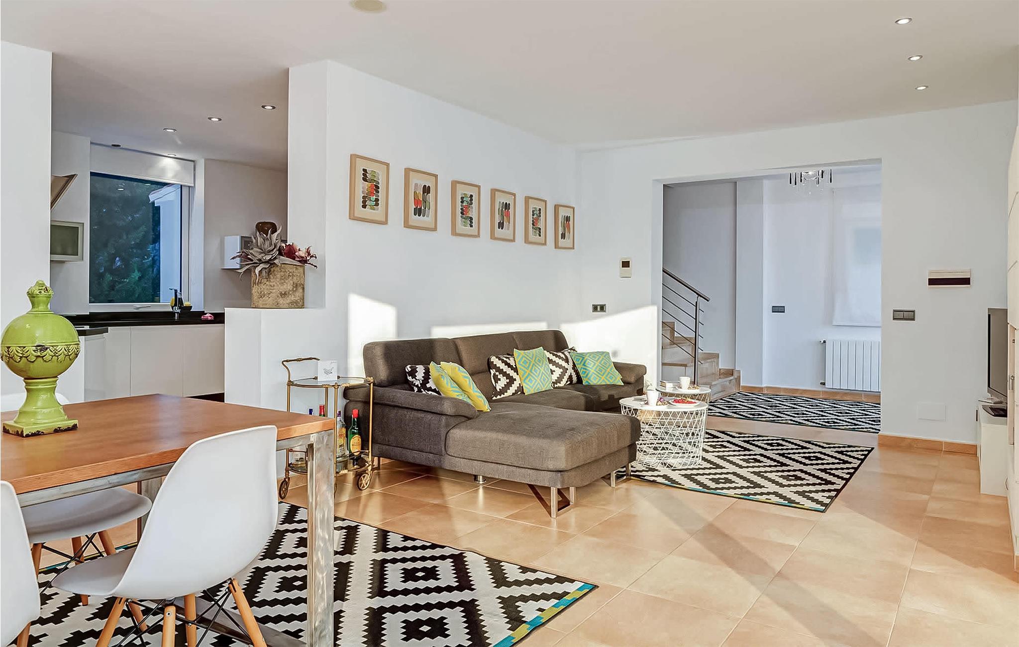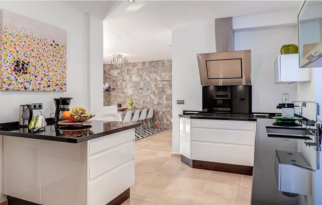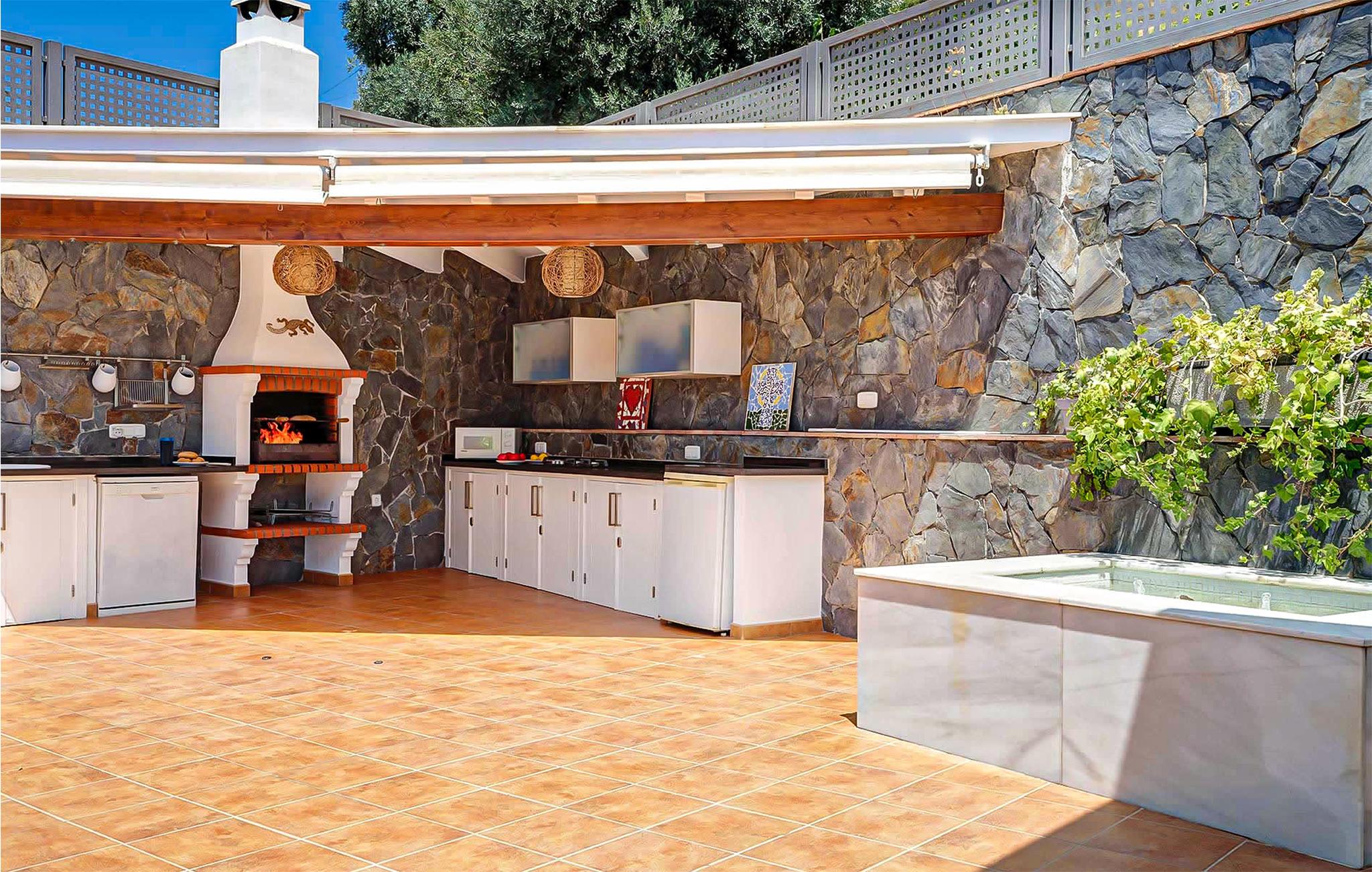 En attraktiv, moderne villa med smukke soveværelser, en dejlig pool, jacuzzi og smukke tagterrasser, det er et fantastisk valg for dem, der ønsker at nyde en anden side af det fortryllende Andalusien. En fantastisk og fredelig bjergomgivelse som denne, så tæt på de fantastiske strande og golfbaner på Costa del Sol, men alligevel uden for de mere tætbefolkede områder, er svær at modstå. Beliggende på en bakketop mellem de ikoniske hvidkalkede byer Canillas de Albaida og Cómpeta, er denne perle af en ejendom en perfekt base for at udforske denne dejlige region. Denne fantastiske villa er nybygget og udstyret med ultra moderne faciliteter. Den er designet til at maksimere panoramaudsigten fra hver af dens tre etager med enorme gulv til loft terrassedøre og fantastiske tagterrasser. Forrest i en smuk have med græsplæne er den smukke pool med en indbydende jacuzzi. Interiøret har honningtonede kalkstensgulve og sprøde hvide vægge blødgjort af mønstrede marokkanske tæpper, farverige pudepuder og omhyggeligt udvalgte kunstværker. Loungen i åbent plan er lys og luftig med en komfortabel L-formet sofa og et spisebord med plads til ti - den perfekte ramme om en livlig familiefest. Det slanke monokromatiske køkken er veludstyret og fuldt udstyret, komplet med morgenmadsbar og taburetter.