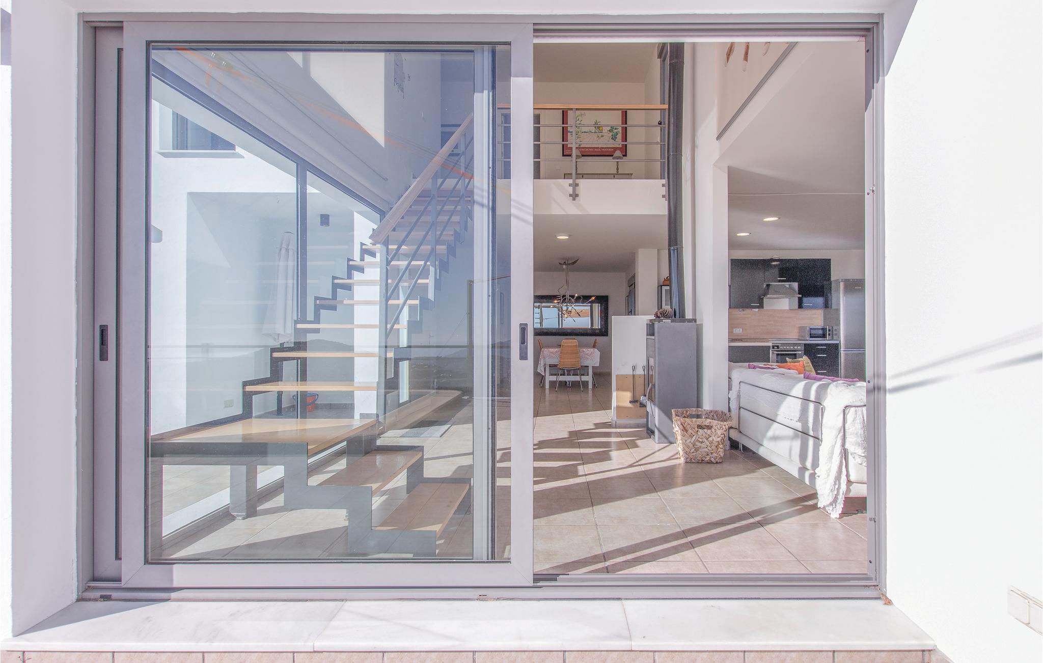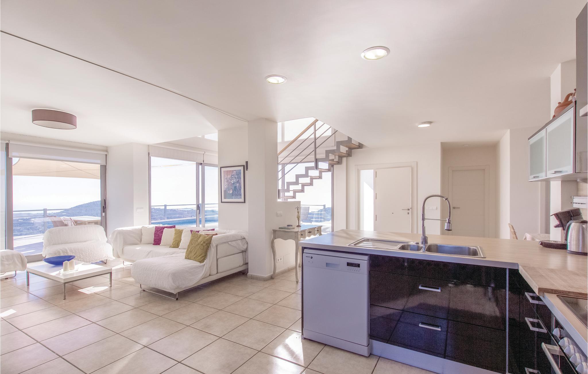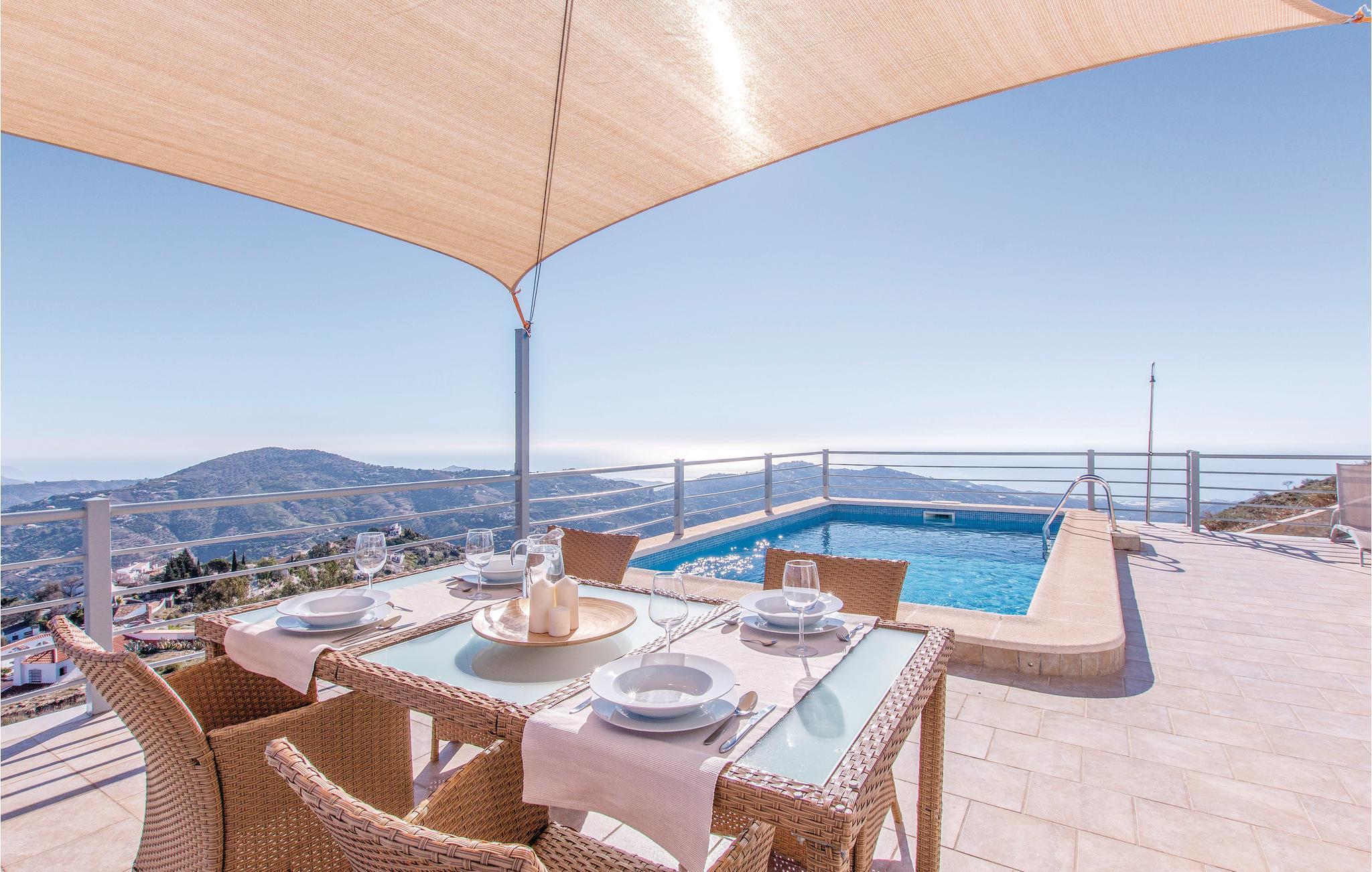 Ultramoderne feriehus med store vinduesfronter, der åbenbarer et fantastisk landskab. Det fuldt udstyrede køkken har plads nok, til at I kan lave mad der. Alle soveværelserne på første sal er møbleret med udsøgt smag, og hovedsoveværelset har en privilegeret udsigt til den private pool og Middelhavet. Den dejlige terrasse med solsejl og luksushavemøbler, lige over for poolområdet, indbyder til hyggeligt samvær og romantiske måltider med en fantastisk udsigt til de nærliggende bjerge og de typiske hvide huse i landsbyerne og på kysten. Smag det typiske landlige køkken i Cómpeta, og prøv fx "migas", eller spis simpelt hen nogle af de lækre tapas mod den lille sult. Nyd en lovende ferie på højeste niveau med garanti for, at I føler jer godt tilpas! Huset ligger på en skråning og kan kun nås over flere trapper (56 trin). Den sidste del op til huset er af en stejl vej, der kun delvist er asfalteret.