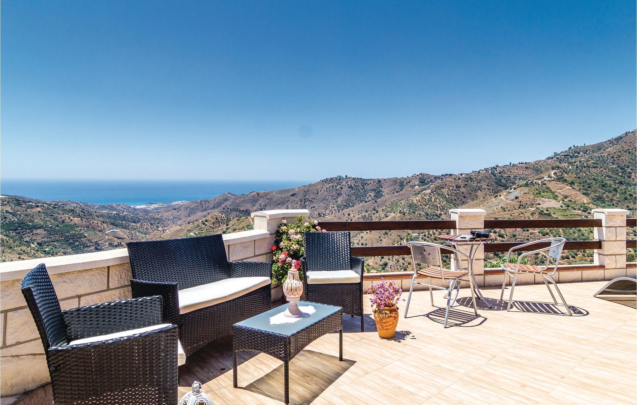 Hold ferie i dette storslåede feriehus som er optimalt beliggende med spektakulær udsigt til det omgivende landskab - på en grund på 4.000 m² med meget privatsfære. Den smagfulde indretning med møbler af høj kvalitet og især det godt udstyrede køkken med farvestrålende fliser vil begejstre jer. Tag bad i husets egen pool og læg jer i solen bagefter på poolterrassen, mens I nyder udsigten over de herlige omgivelser med havet i baggrunden. Her er I tæt på de smukkeste, hvide landsbyer i Axarquia og nationalparken Sierra Almijara-Tejeda (ca. 20 minutters kørsel), der alle sammen er med til at gøre denne region til et eftetragtet feriemål. Da ejendommen ligger i bjergene, er opkørslen via snoede veje.