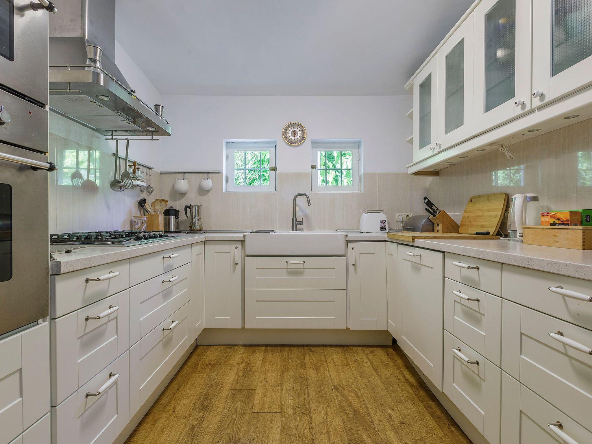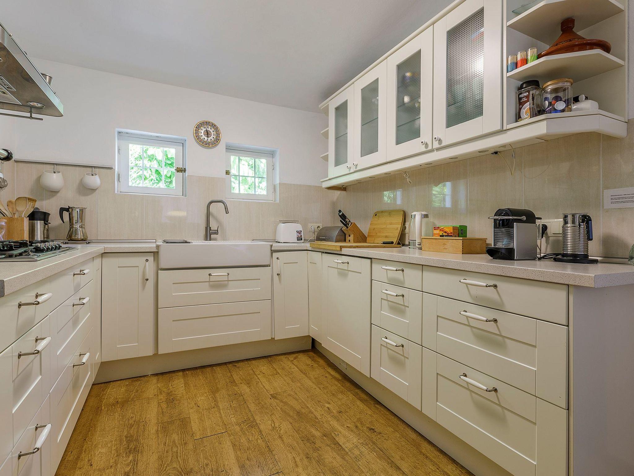 The 120 m² house has three bedrooms: two are furnished with a 150 x 200 cm beds with good quality mattresses. The third one is furnished with a queen size bed and accommodates two children. Additionally, you will find two full bathrooms with a shower tub, a sink and a bidet, a spacious living room with satellite television and an open plan dining area and a modern kitchen with a fridge/freezer, a gas stove, an oven, a microwave, a dishwasher and a Nespresso coffee maker. On the second floor, you will find a bedroom and a spacious work space with a library with mostly German and Spanish books. Wi-Fi, including a printer, are included in the rental price.