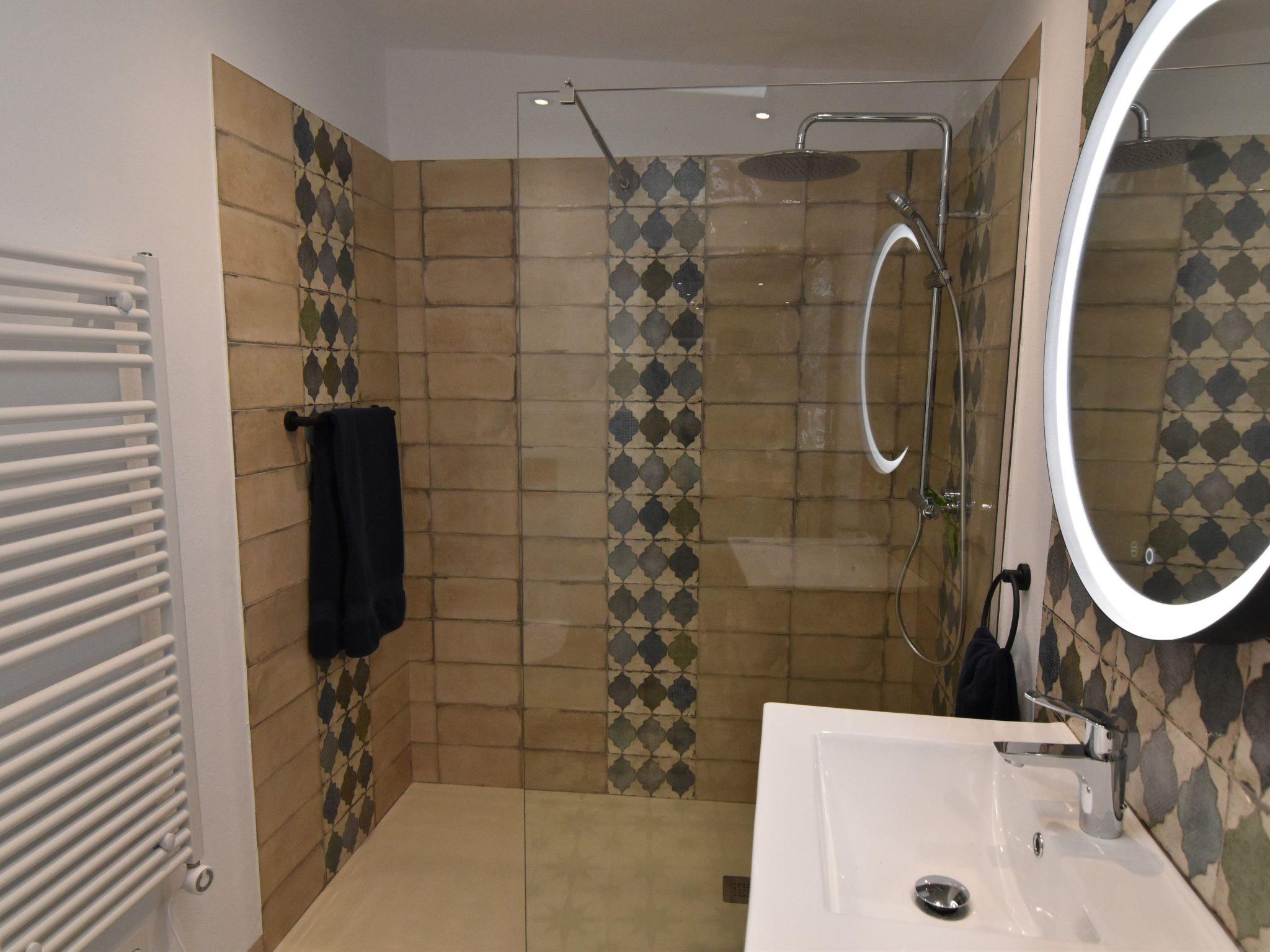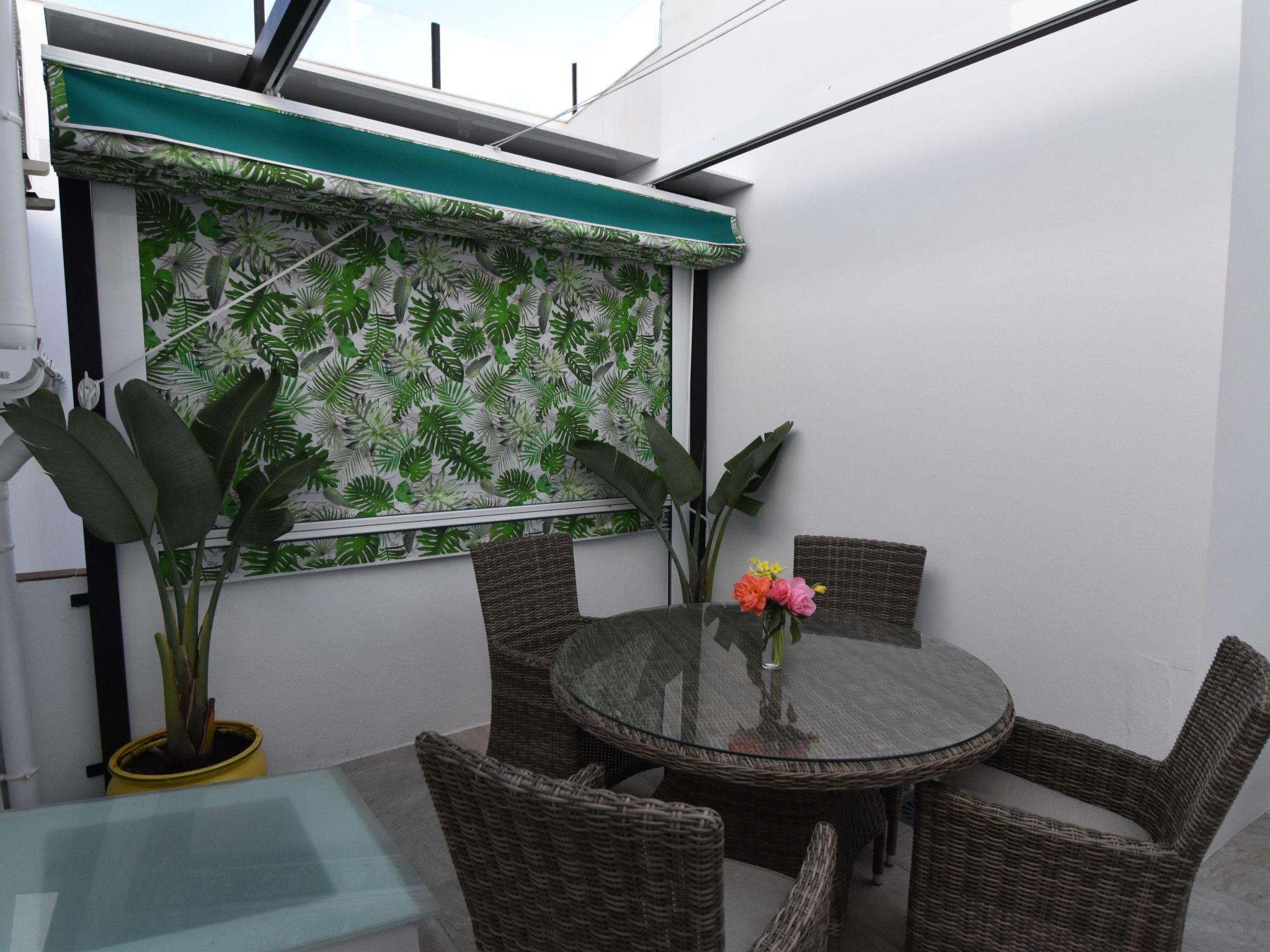 Steps continue to the 2nd floor, to a medium size bedroom with a large double bed (150cm) and en-suite bathroom also with rain effect shower and smart mirror. This floor is complemented with a terrace with colorful awning, seating for 4 people and two sun loungers to unwind and chill after a day of exploring the area.