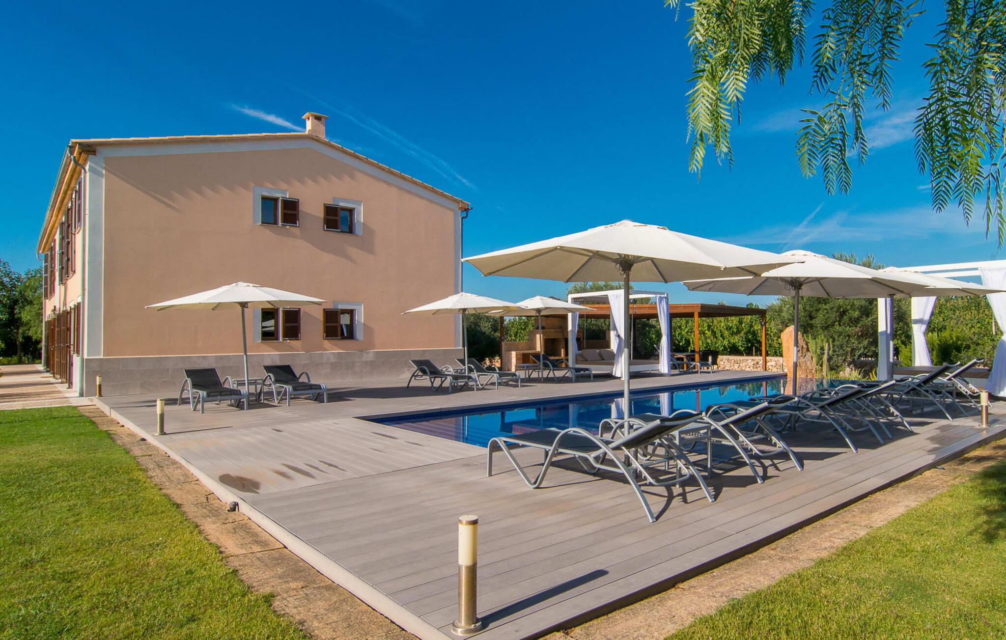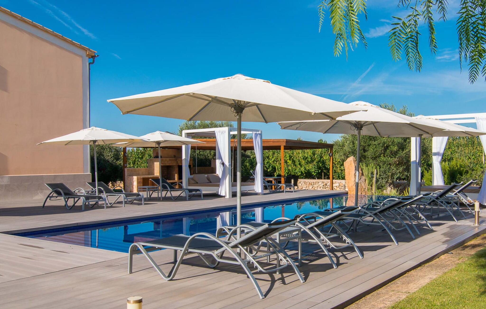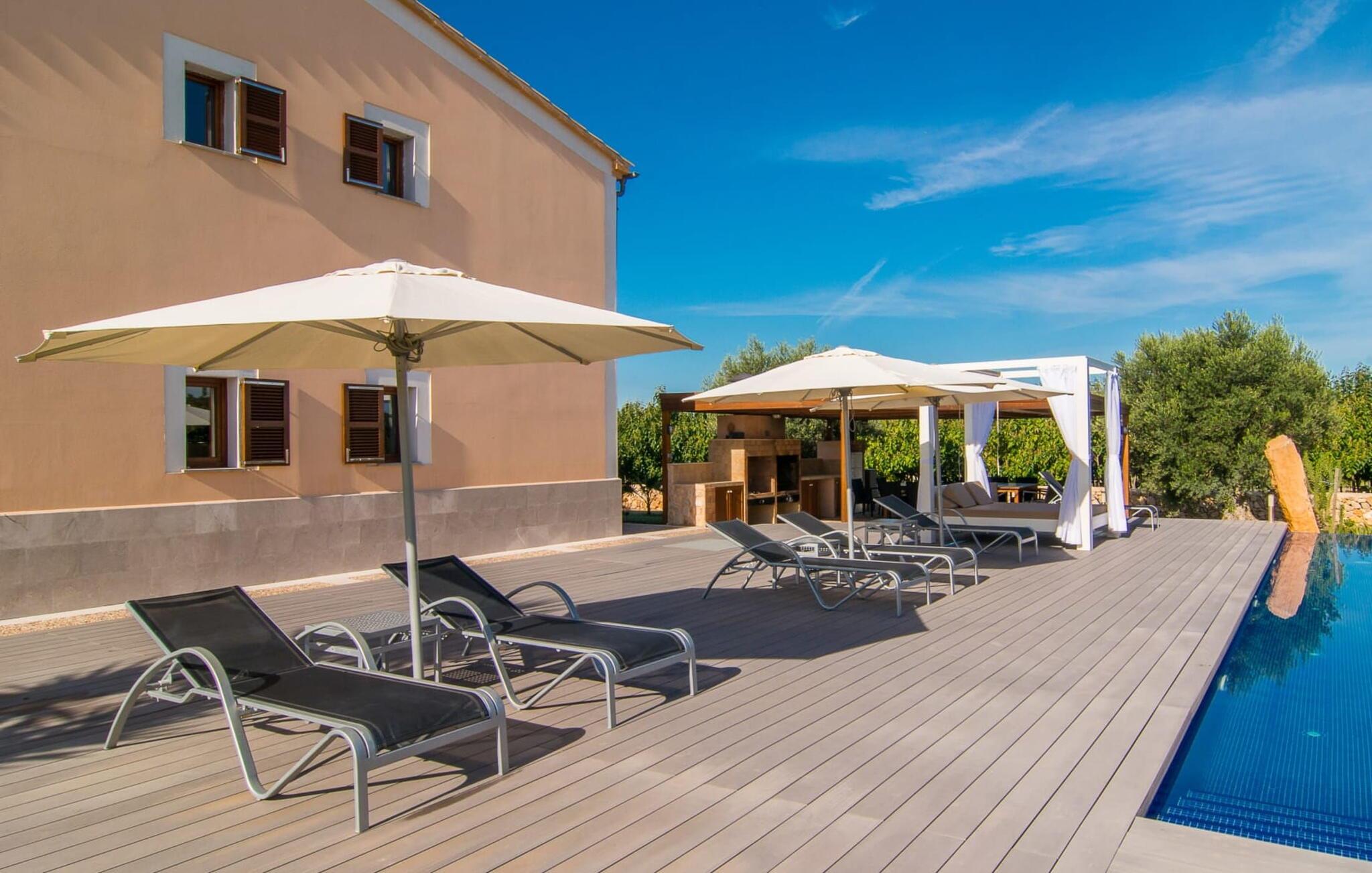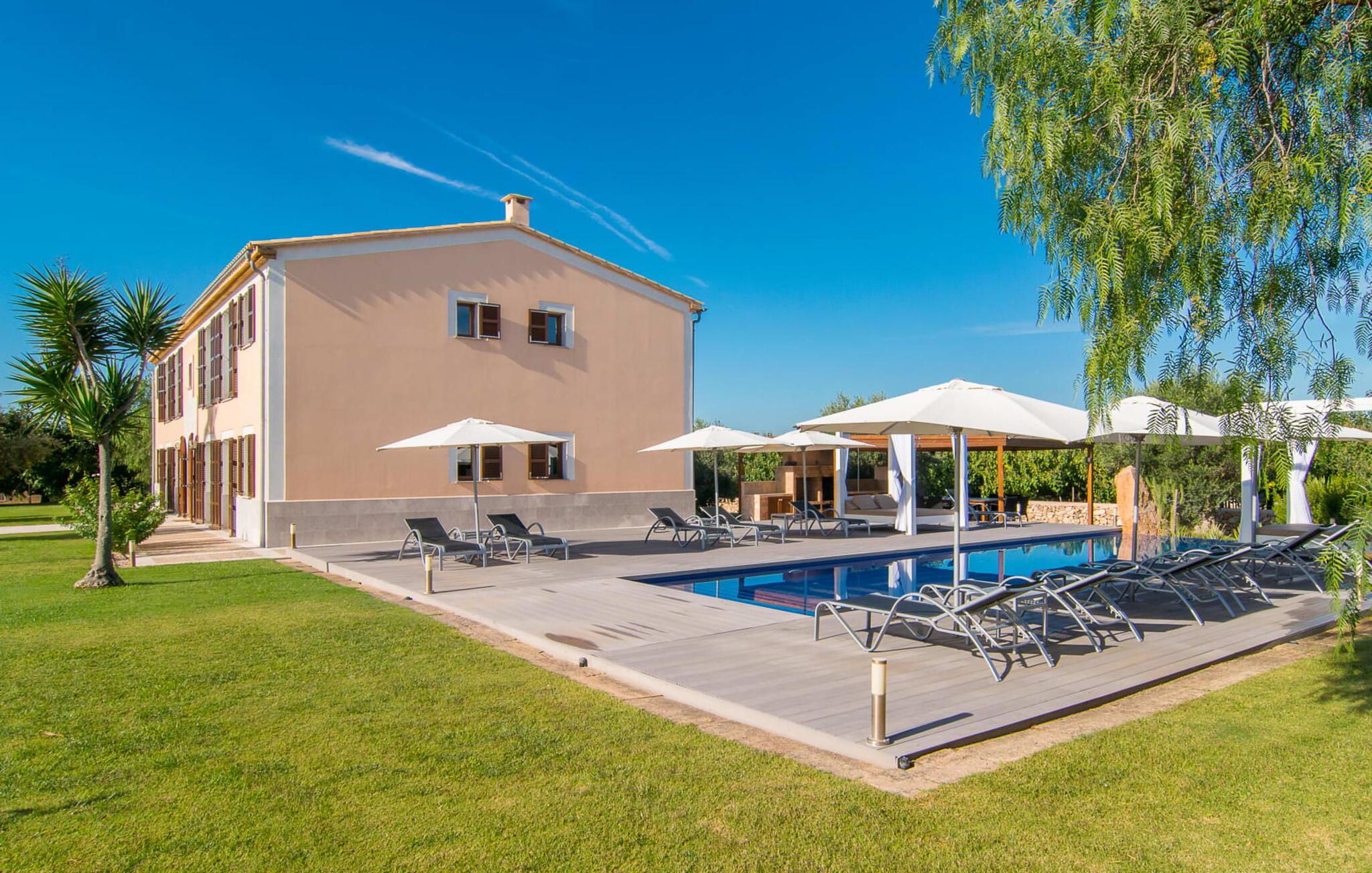 Denne luksuriøse villa "Conies Romani" er beliggende på en 20.000 m² stor grund mellem Manacor og Colonia Sant Pere og tilbyder ultimativ komfort i en fantastisk beliggenhed i udkanten af Son Cifre naturreservat. Dette er et feriehus i Fincallorca. Villaen blev færdiggjort i 2010 og kombinerer moderne design med fuldstændig privatliv, omgivet af store terrasser, der fører til et afsondret poolområde. Poolen med komfortable indgangstrin er omgivet af en frodig græsplæne og modne træer og tilbyder et perfekt afslapningsrum. Slap af på den balinesiske seng eller liggestole, mens en parasol giver skygge, hvis det er nødvendigt. Et højdepunkt ved villaen er det overdækkede udekøkken med grill, køleskab og opvaskemaskine, som er perfekt til fællesspisning på lune aftener. Indenfor er den rummelige, airconditionerede opholdsstue med komfortable siddepladser, en pejs og moderne bekvemmeligheder. Det fuldt udstyrede køkken og den store spiseplads er velegnet til en ferie med egen forplejning. Villaen har seks stilfulde, airconditionerede, stilfuldt designede en-suite soveværelser, to i stueetagen. og fire luksuriøse suiter med dobbeltseng (1,80 x 2,00 m) og boblebad på øverste etage. Med centralvarme overalt sikrer villaen komfort hele året rundt. Villaen er beliggende i den naturligt smukke Son Cifre-region i den østlige del af Mallorca. Dette naturreservat strækker sig fra Artà til Manacor. Manacor ligger kun 4 km væk og byder på flere store supermarkeder samt nogle meget gode restauranter. Med en lejebil kan du hurtigt nå strandene i sydøst, såsom Cala Varquez, eller i nordøst, såsom Son Serra de Marina. Bugten Colonia de St. Pere, en lille søvnig fiskerlandsby, ligger kun 15 minutter væk i bil.