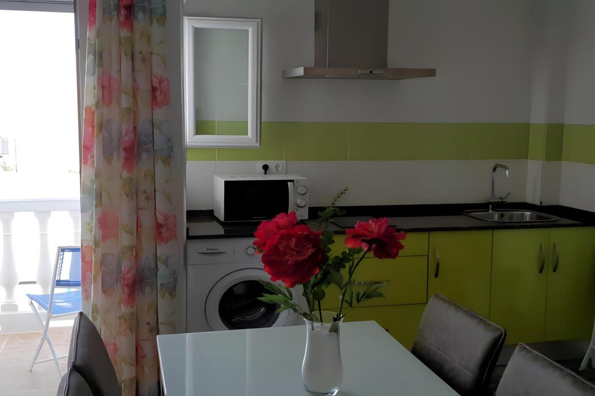 , , , åbent køkken(kakkelovn, brødrister, kaffemaskine, mikrobølgeovn, køleskab, fryser, Saftpresser, Blender, , ), stue / spisestue(enkeltsovesofa(135 x 200 cm), Fjernsyn, spisebord), soveværelse(dobbeltseng(150 x 200 cm)), badeværelse(bruser, håndvask, toilet), Strand, tremmeseng, vaskemaskine, balkon eller terrasse, klimaanlæg, strygebræt, strygejern, Håndklæder/sengelinned (inkl.), , Cleaning products, Long term stays allowed, Sea view, Wine glasses