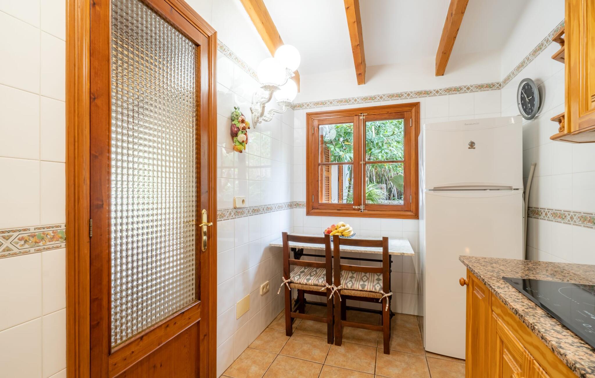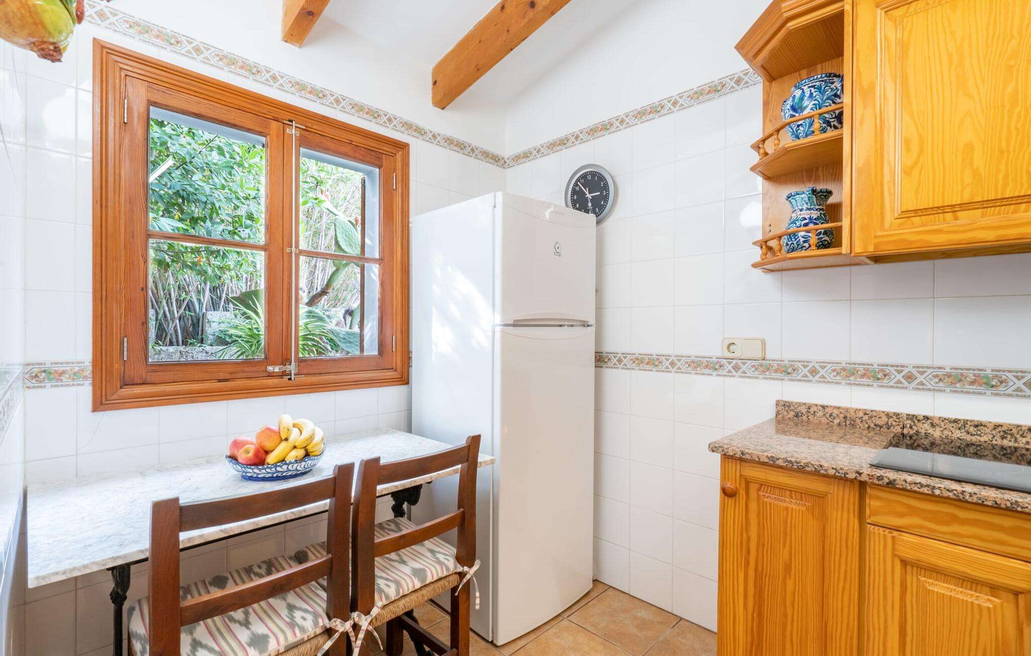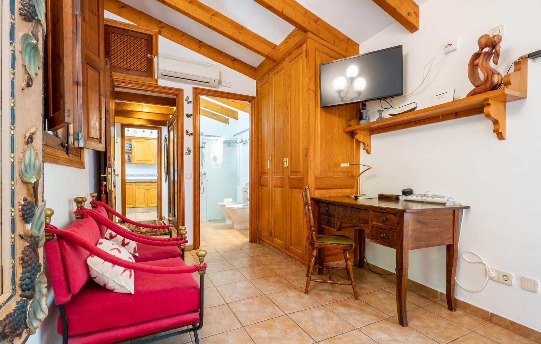 Ejendommen er stor og en venstre side af bygningen er frit tilgængelig, da resten er lukket. På billederne kan I se det indre af det ulåste rum. Inde i villaen finder I en meget komfortabel stue/soveværelse, hvor I kan nyde en afslappende nat, ligesom I ville gøre her i lænestolene foran fladskærms-tv med satellitforbindelse. En let seng på 1,50 x 2,00 m præger den hjemlige stemning, mens hvide vægge, trædøre og vinduer samt nøje udvalgt dekoration bidrager til en individuel og indbydende karakter. I det rustikke køkken finder I alt hvad I skal bruge til jeres daglige behov, som naturligvis også inkluderer en filterkaffemaskine. Her er også en lille indendørs spiseplads, som kan bruges, hvis det er nødvendigt. Det lyse badeværelse, designet i typisk mallorcansk stil, er udstyret med toilet, bidet, håndvask og bruser. For nemheds skyld er strygejern og hårtørrere tilgængelige på stedet, så I ikke behøver at bekymre jer om at tage jeres egen med hjemmefra.