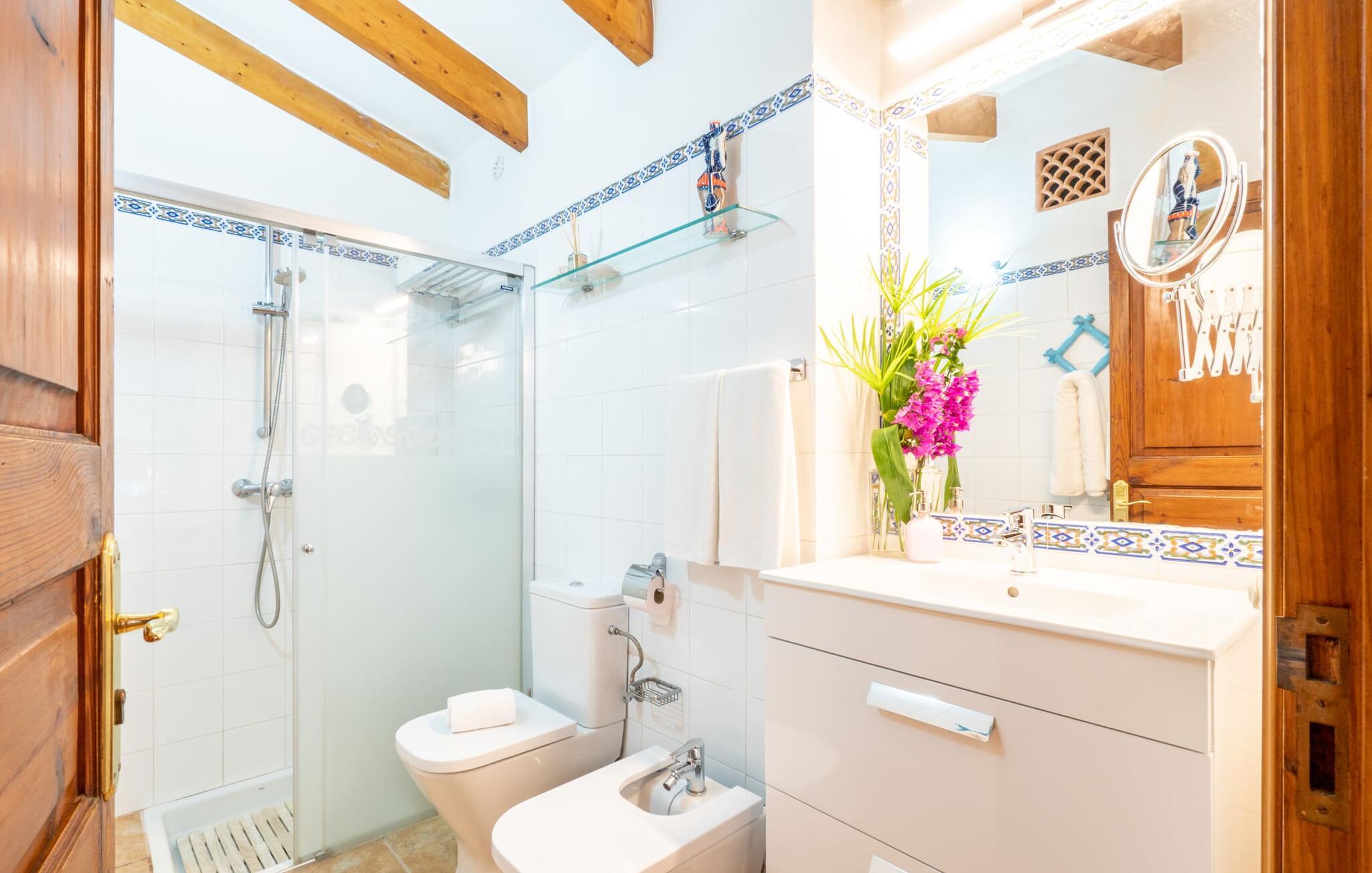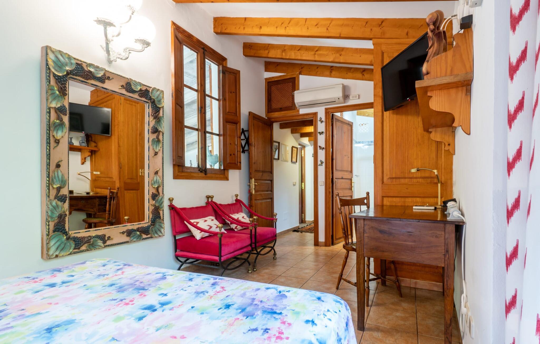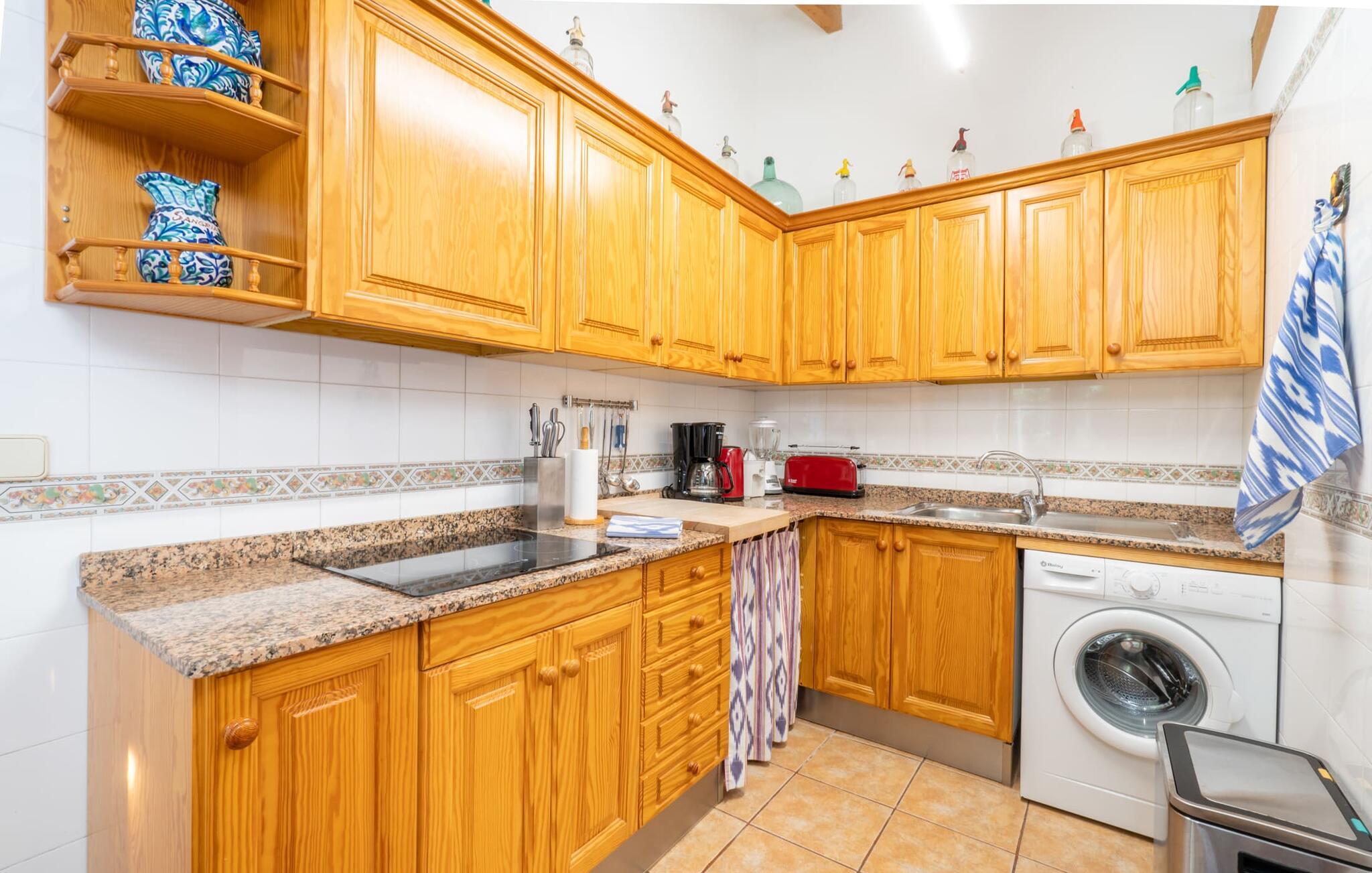 Ejendommen er stor og en venstre side af bygningen er frit tilgængelig, da resten er lukket. På billederne kan I se det indre af det ulåste rum. Inde i villaen finder I en meget komfortabel stue/soveværelse, hvor I kan nyde en afslappende nat, ligesom I ville gøre her i lænestolene foran fladskærms-tv med satellitforbindelse. En let seng på 1,50 x 2,00 m præger den hjemlige stemning, mens hvide vægge, trædøre og vinduer samt nøje udvalgt dekoration bidrager til en individuel og indbydende karakter. I det rustikke køkken finder I alt hvad I skal bruge til jeres daglige behov, som naturligvis også inkluderer en filterkaffemaskine. Her er også en lille indendørs spiseplads, som kan bruges, hvis det er nødvendigt. Det lyse badeværelse, designet i typisk mallorcansk stil, er udstyret med toilet, bidet, håndvask og bruser. For nemheds skyld er strygejern og hårtørrere tilgængelige på stedet, så I ikke behøver at bekymre jer om at tage jeres egen med hjemmefra.