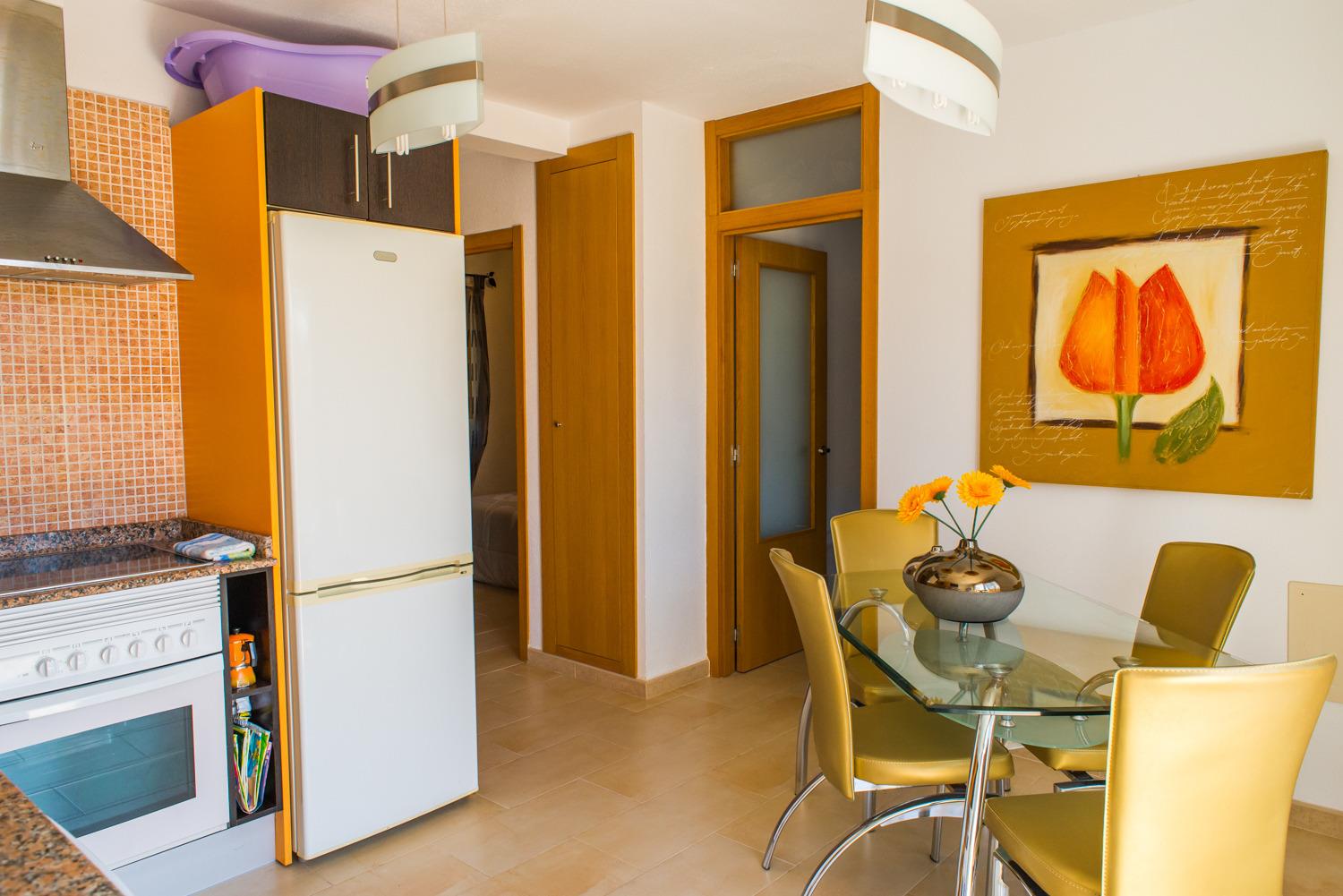 Die Küche ist komplett ausgestattet und der Balkon bietet Ihnen Blick auf den Pool.