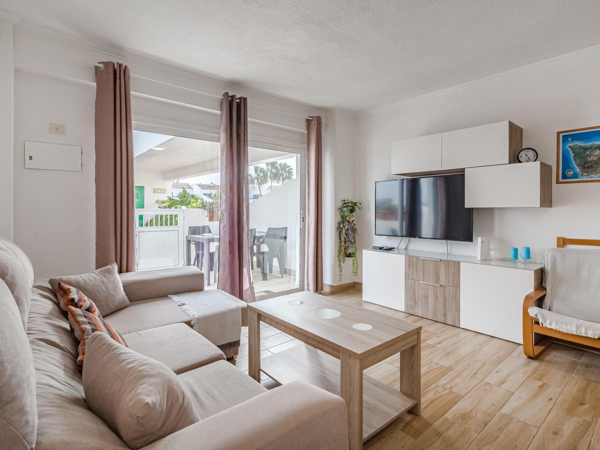"Copana", 2-room apartment 76 m2, on the ground floor. Spacious and bright, practical and comfortable furnishings: 1 large room with Dressing room with 1 french bed (180 cm, length 200 cm), digital TV and flat screen. Living room with digital TV, international TV channels and flat screen. Exit to the terrace. Open kitchen (3 ceramic glass hob hotplates, toaster, kettle, electric coffee machine, combination microwave) with dining table, boiler (30 litres). Shower/bidet/WC. Large terrace 30 m2. Terrace furniture, deck chairs (1). Partial view of the swimming pool and the countryside. Facilities: washing machine, iron, mosquito net, hair dryer. Internet (WiFi, free). Please note: non-smokers only. Fire extinguisher, no lift. A-38-4-0006053 // Reg. Nr.: ESFCTU00003801600036433500000000000000000VV-38-464931