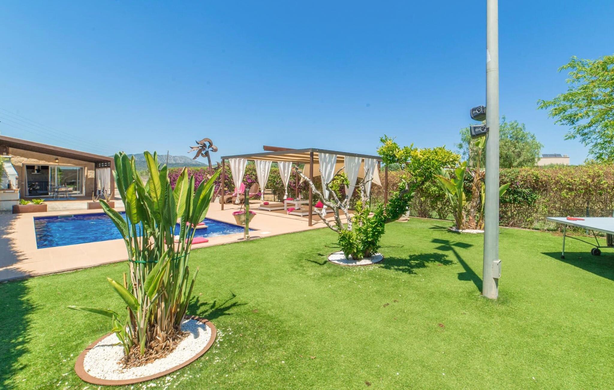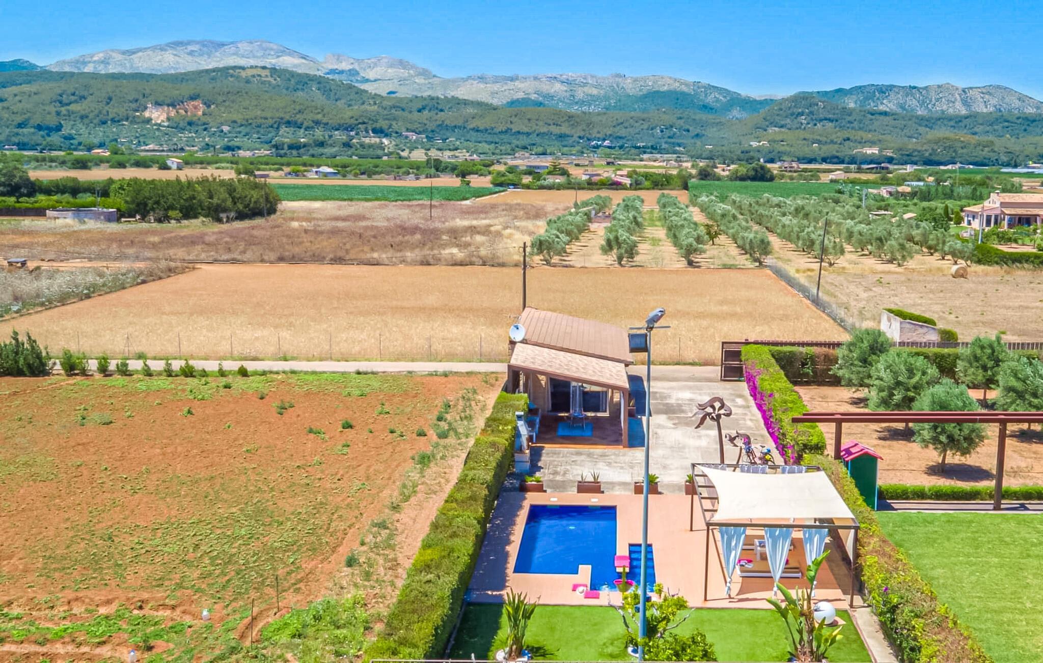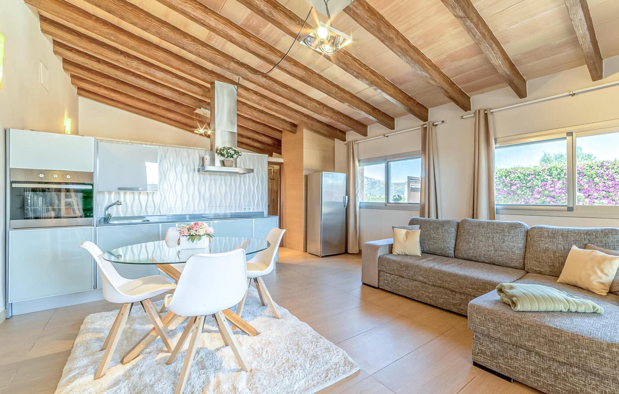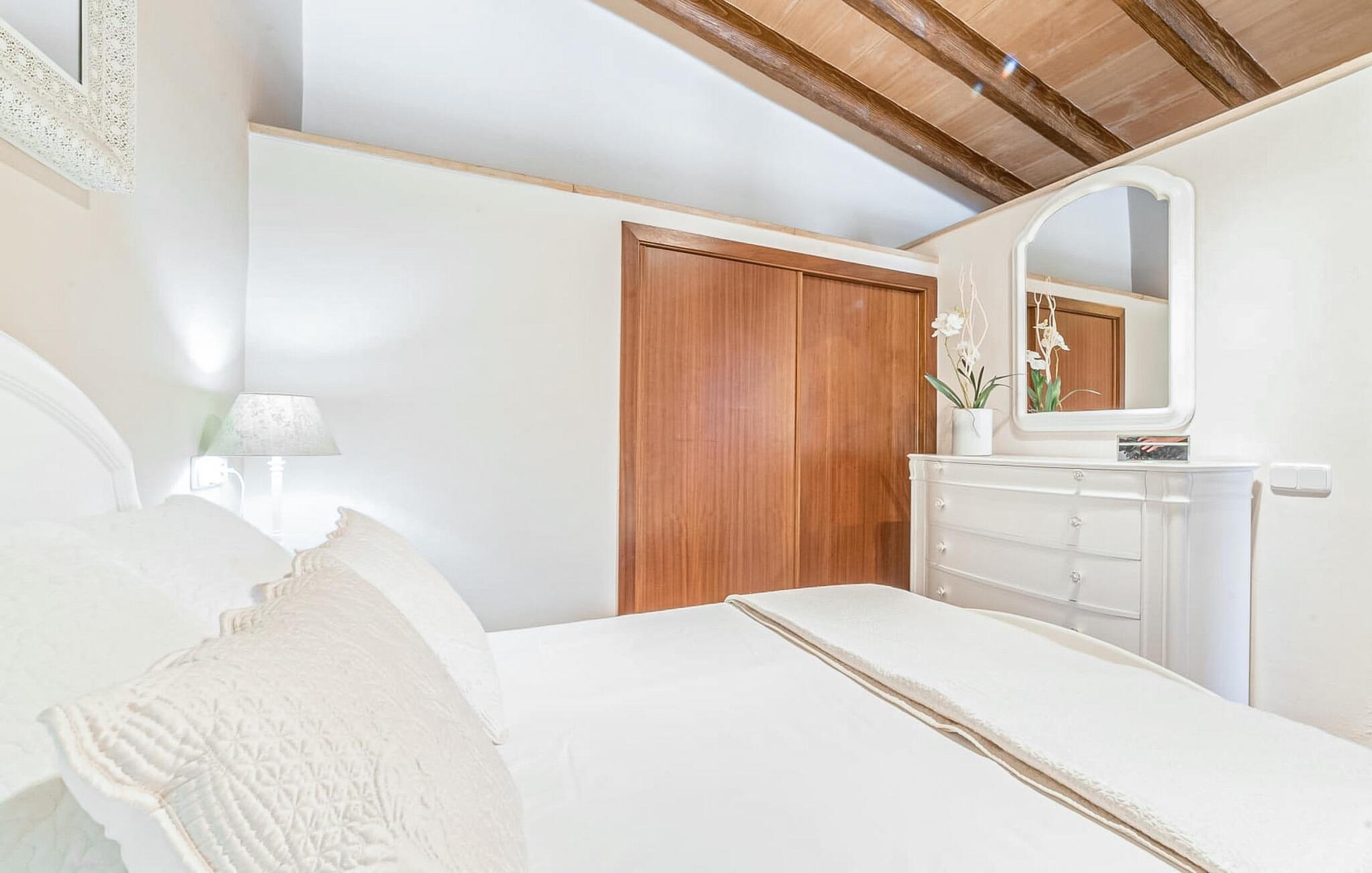 Huset ligger på en 2.000 m² meget grøn havegrund. Udenfor er der det rummelige og kunstfærdigt designede poolområde, som er omgivet af en lys sandstensterrasse. Udover den praktiske udendørs bruser er der også en jacuzzi med hydrojet - afslapning garanteret! Ligeledes i den opvarmede anden jacuzzi, som kan benyttes fra november til marts. Efter badet kan I slappe af med en drink på området dækket af en baldakin eller slappe af eller læse på de komfortable liggestole. Der er også et udendørs musikanlæg, så I kan ledsage jeres timers nydelse med jeres helt egen yndlingsmusik. Fincaen er udstyret med hurtigt trådløst internet, så I kan surfe og maile på terrassen ved hjælp af jeres iPad eller laptop. Der er også et såkaldt "topdæk": Her er et par siddepladser, men også - for den sporty feriegæst - to fitnesscykler. Der er også to cykler til rådighed for alle, der gerne vil udforske området på pedaler. Under øverste dæk ligger saunaen, som på vidunderlig vis supplerer wellness-programmet. Fra det perfekt designede udeareal fører stien ind i huset via en stor glasskydedør. Foran den er der en overdækket terrasse med spiseplads, der også kan rumme fire personer og ligger i en fin forlængelse af stuen. Lige ved siden af ligger den faste grillplads til aftengrill i det fri. Inde i huset kommer man først til opholds- og spiseafdelingen. Spisepladsen her består af et glasbord og flotte designerstole. Det åbne hvide tekøkken med en arkitektonisk cool skillevæg har alt det tekniske udstyr, der gør jeres ferie endnu mere afslappende: Mikroovn, komfur, ovn, stort køleskab med fryseboks, elkedel, filterkaffe og Nespresso-maskine, vaskemaskine og opvaskemaskine. Designet af hele interiøret er moderne og trendy. Den beige væg i opholdsrummet skaber en vidunderlig atmosfære, især i kombination med de synlige træbjælker i loftet. Badeværelset er stilfuldt adskilt fra soveværelset af en trekvart høj væg. For udflugter og shopping kan I hurtigt køre til Sa Pobla. Museet for Samtidskunst ligger også der. Den nærliggende Pollenca har også adskillige seværdigheder, der vidner om Mallorcas historie. De smukke sandstrande i nord kan nemt nås på mindre end 10 km og lægger op til at tilbringe lange dage ved havet. Og har I lyst til at shoppe “rigtig” så tag til hovedstaden Palma og besøg den populære gamle bydel med dens smukke butikker.