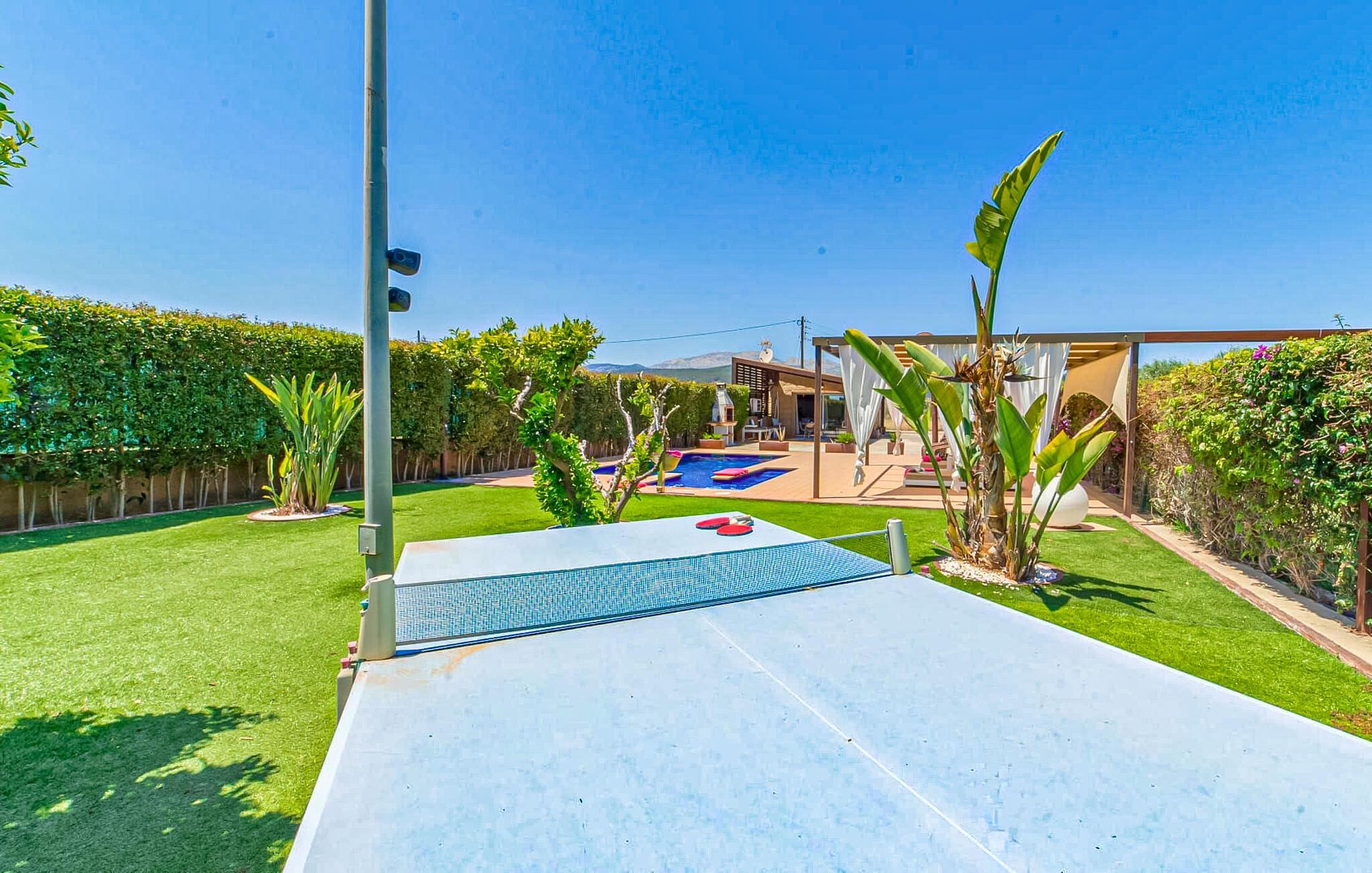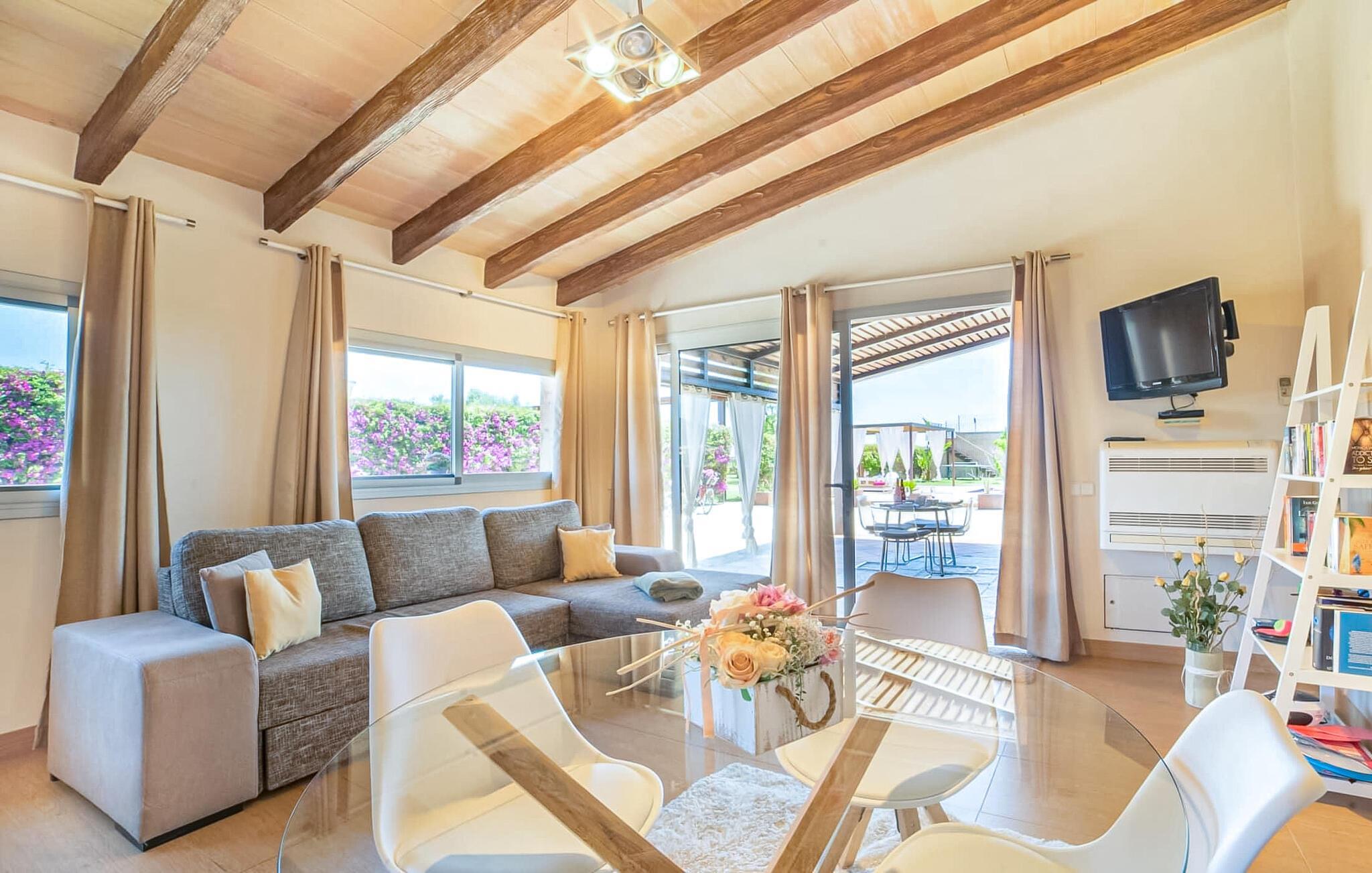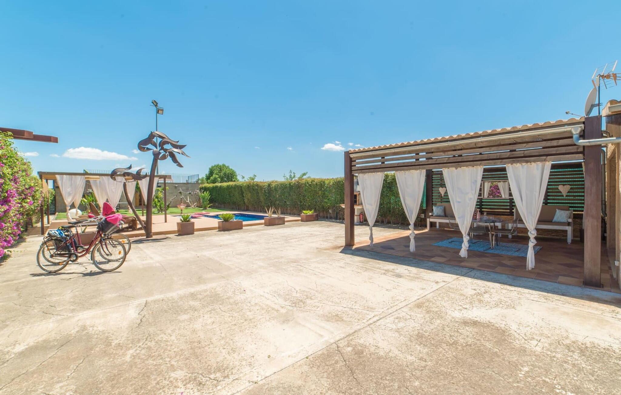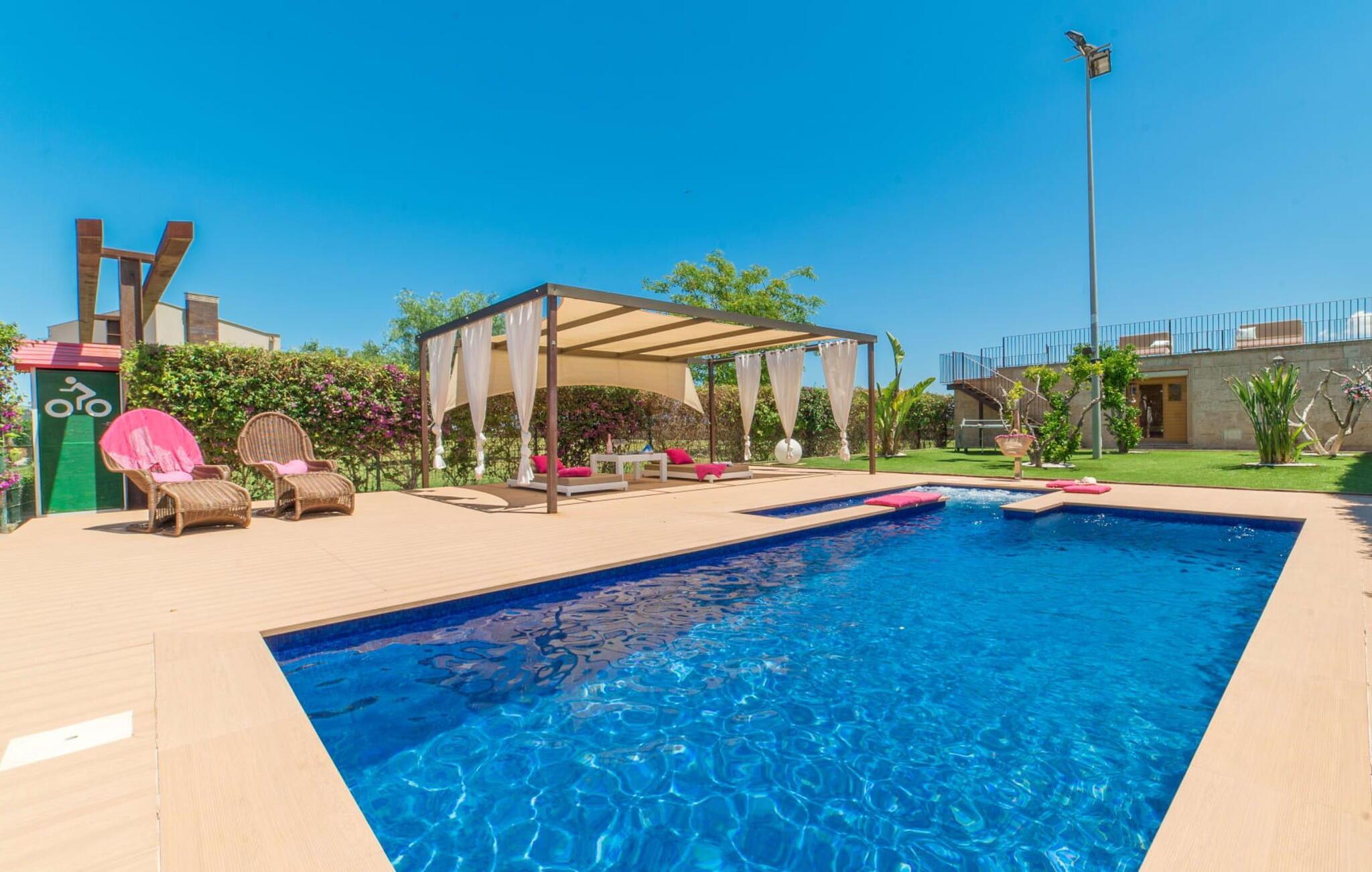 Huset ligger på en 2.000 m² meget grøn havegrund. Udenfor er der det rummelige og kunstfærdigt designede poolområde, som er omgivet af en lys sandstensterrasse. Udover den praktiske udendørs bruser er der også en jacuzzi med hydrojet - afslapning garanteret! Ligeledes i den opvarmede anden jacuzzi, som kan benyttes fra november til marts. Efter badet kan I slappe af med en drink på området dækket af en baldakin eller slappe af eller læse på de komfortable liggestole. Der er også et udendørs musikanlæg, så I kan ledsage jeres timers nydelse med jeres helt egen yndlingsmusik. Fincaen er udstyret med hurtigt trådløst internet, så I kan surfe og maile på terrassen ved hjælp af jeres iPad eller laptop. Der er også et såkaldt "topdæk": Her er et par siddepladser, men også - for den sporty feriegæst - to fitnesscykler. Der er også to cykler til rådighed for alle, der gerne vil udforske området på pedaler. Under øverste dæk ligger saunaen, som på vidunderlig vis supplerer wellness-programmet. Fra det perfekt designede udeareal fører stien ind i huset via en stor glasskydedør. Foran den er der en overdækket terrasse med spiseplads, der også kan rumme fire personer og ligger i en fin forlængelse af stuen. Lige ved siden af ligger den faste grillplads til aftengrill i det fri. Inde i huset kommer man først til opholds- og spiseafdelingen. Spisepladsen her består af et glasbord og flotte designerstole. Det åbne hvide tekøkken med en arkitektonisk cool skillevæg har alt det tekniske udstyr, der gør jeres ferie endnu mere afslappende: Mikroovn, komfur, ovn, stort køleskab med fryseboks, elkedel, filterkaffe og Nespresso-maskine, vaskemaskine og opvaskemaskine. Designet af hele interiøret er moderne og trendy. Den beige væg i opholdsrummet skaber en vidunderlig atmosfære, især i kombination med de synlige træbjælker i loftet. Badeværelset er stilfuldt adskilt fra soveværelset af en trekvart høj væg. For udflugter og shopping kan I hurtigt køre til Sa Pobla. Museet for Samtidskunst ligger også der. Den nærliggende Pollenca har også adskillige seværdigheder, der vidner om Mallorcas historie. De smukke sandstrande i nord kan nemt nås på mindre end 10 km og lægger op til at tilbringe lange dage ved havet. Og har I lyst til at shoppe “rigtig” så tag til hovedstaden Palma og besøg den populære gamle bydel med dens smukke butikker.