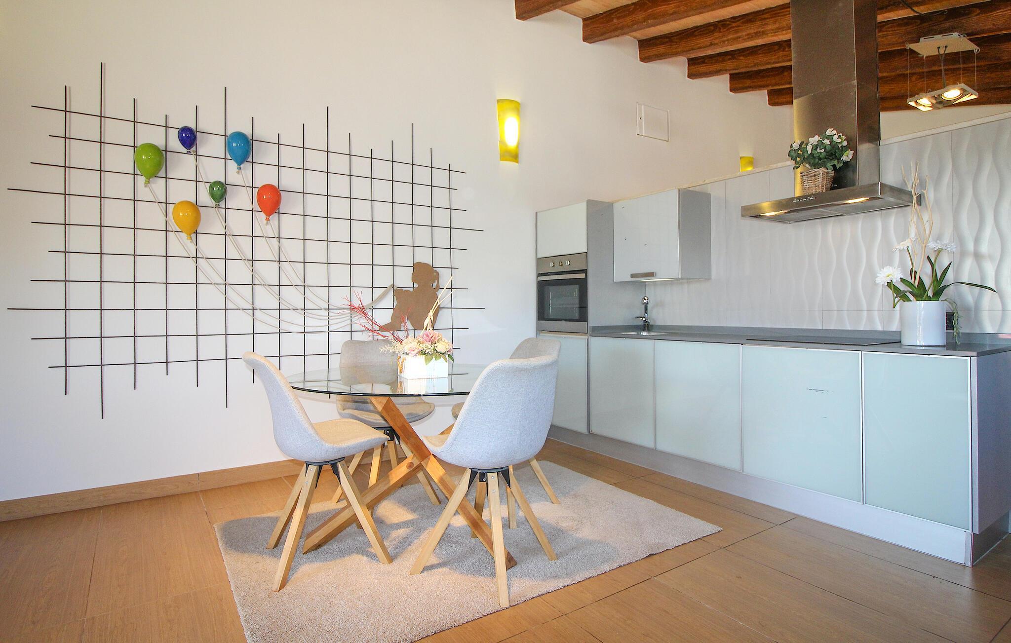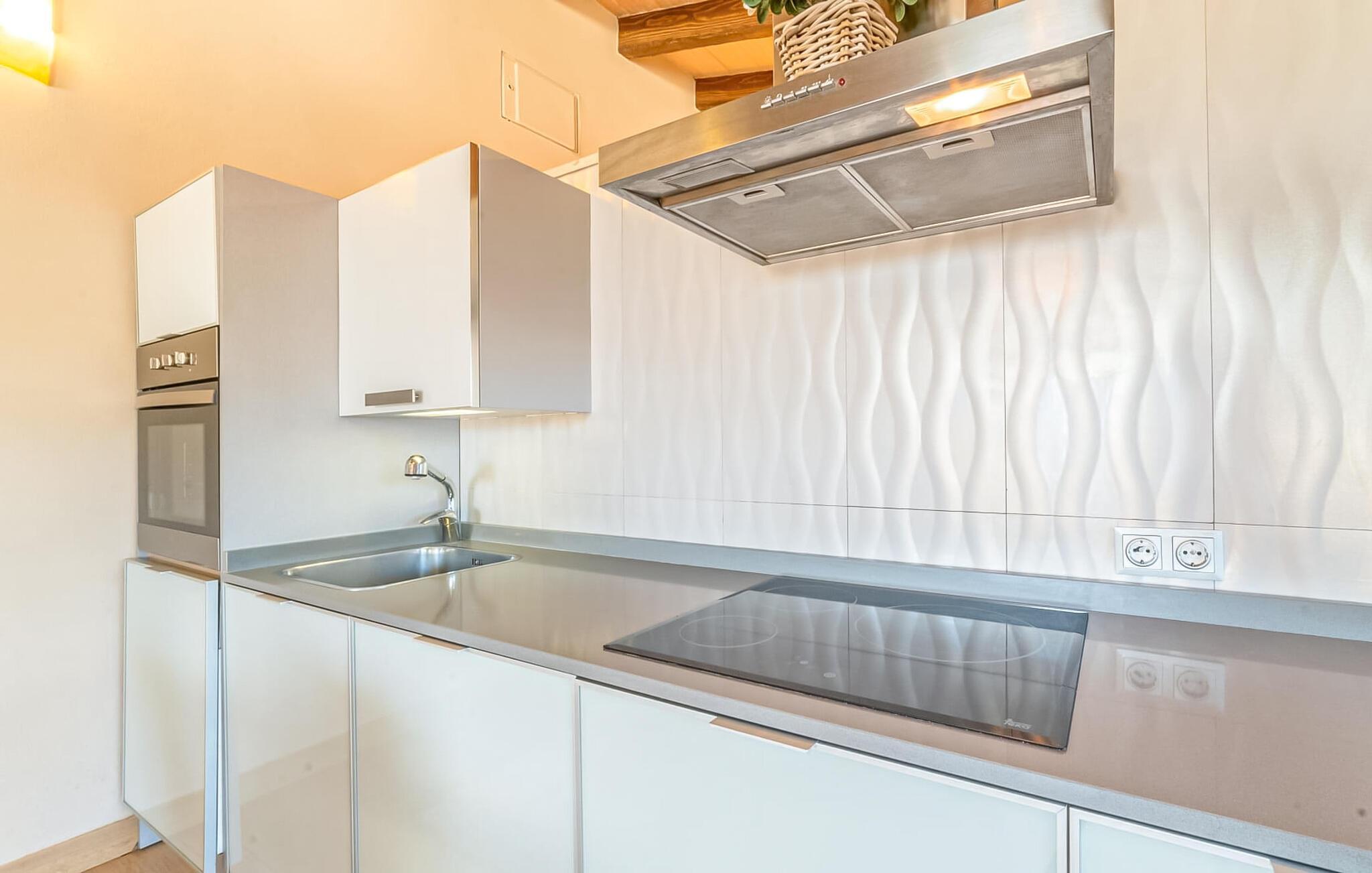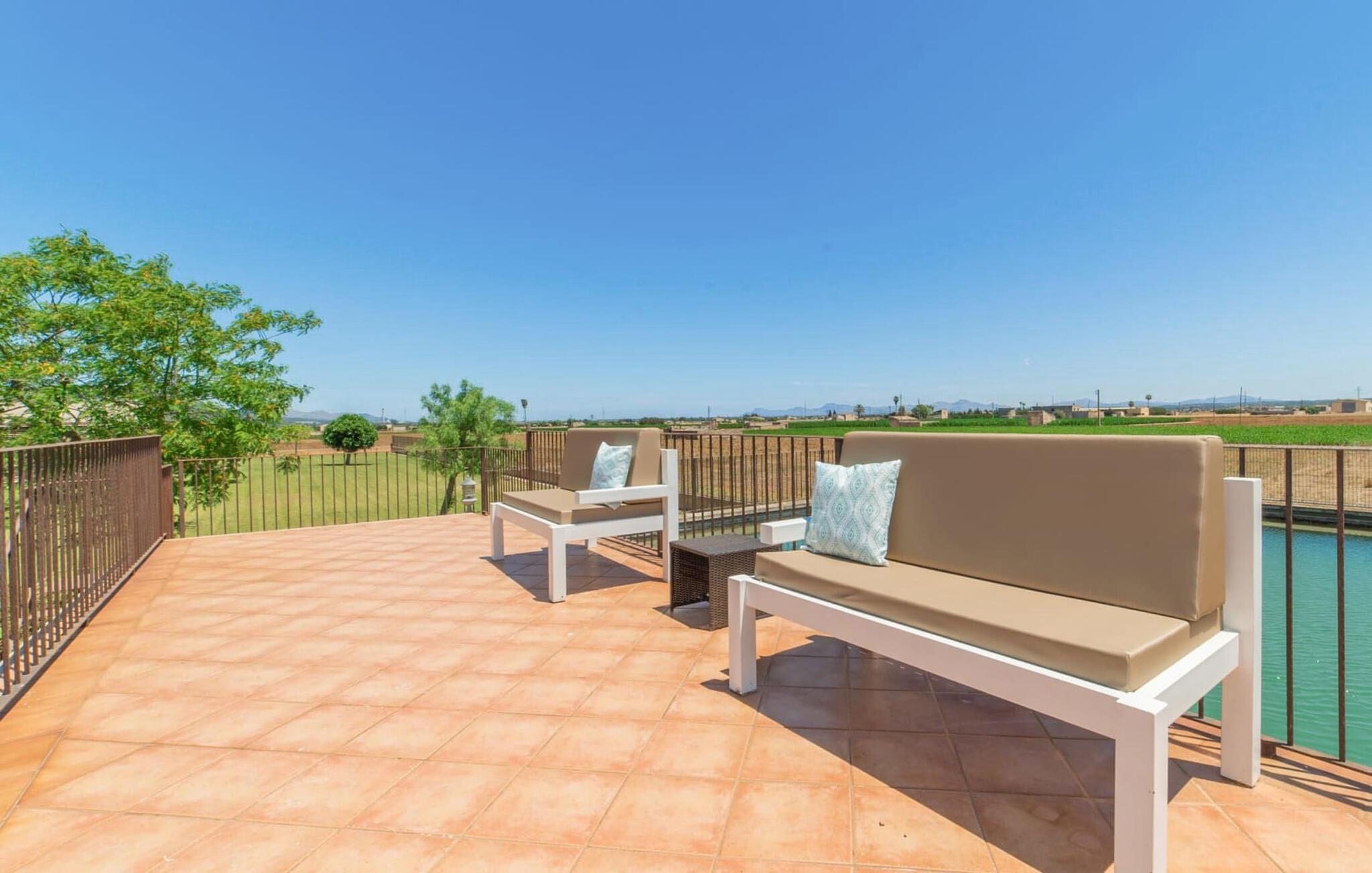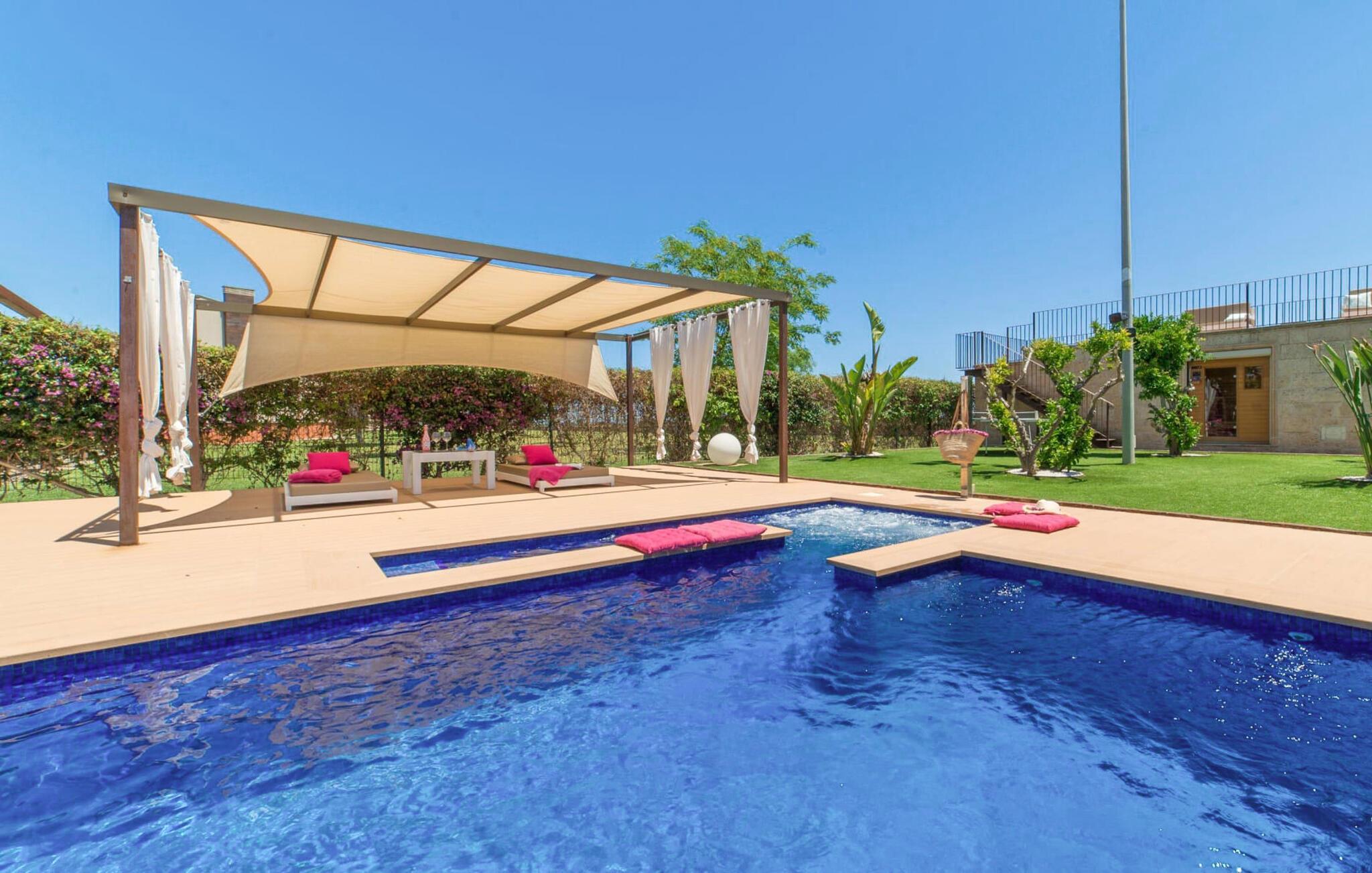 Huset ligger på en 2.000 m² meget grøn havegrund. Udenfor er der det rummelige og kunstfærdigt designede poolområde, som er omgivet af en lys sandstensterrasse. Udover den praktiske udendørs bruser er der også en jacuzzi med hydrojet - afslapning garanteret! Ligeledes i den opvarmede anden jacuzzi, som kan benyttes fra november til marts. Efter badet kan I slappe af med en drink på området dækket af en baldakin eller slappe af eller læse på de komfortable liggestole. Der er også et udendørs musikanlæg, så I kan ledsage jeres timers nydelse med jeres helt egen yndlingsmusik. Fincaen er udstyret med hurtigt trådløst internet, så I kan surfe og maile på terrassen ved hjælp af jeres iPad eller laptop. Der er også et såkaldt "topdæk": Her er et par siddepladser, men også - for den sporty feriegæst - to fitnesscykler. Der er også to cykler til rådighed for alle, der gerne vil udforske området på pedaler. Under øverste dæk ligger saunaen, som på vidunderlig vis supplerer wellness-programmet. Fra det perfekt designede udeareal fører stien ind i huset via en stor glasskydedør. Foran den er der en overdækket terrasse med spiseplads, der også kan rumme fire personer og ligger i en fin forlængelse af stuen. Lige ved siden af ligger den faste grillplads til aftengrill i det fri. Inde i huset kommer man først til opholds- og spiseafdelingen. Spisepladsen her består af et glasbord og flotte designerstole. Det åbne hvide tekøkken med en arkitektonisk cool skillevæg har alt det tekniske udstyr, der gør jeres ferie endnu mere afslappende: Mikroovn, komfur, ovn, stort køleskab med fryseboks, elkedel, filterkaffe og Nespresso-maskine, vaskemaskine og opvaskemaskine. Designet af hele interiøret er moderne og trendy. Den beige væg i opholdsrummet skaber en vidunderlig atmosfære, især i kombination med de synlige træbjælker i loftet. Badeværelset er stilfuldt adskilt fra soveværelset af en trekvart høj væg. For udflugter og shopping kan I hurtigt køre til Sa Pobla. Museet for Samtidskunst ligger også der. Den nærliggende Pollenca har også adskillige seværdigheder, der vidner om Mallorcas historie. De smukke sandstrande i nord kan nemt nås på mindre end 10 km og lægger op til at tilbringe lange dage ved havet. Og har I lyst til at shoppe “rigtig” så tag til hovedstaden Palma og besøg den populære gamle bydel med dens smukke butikker.