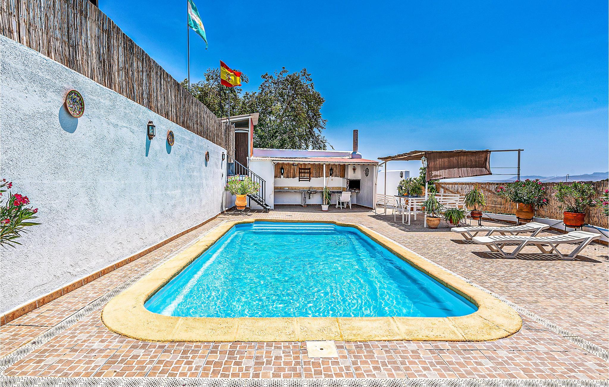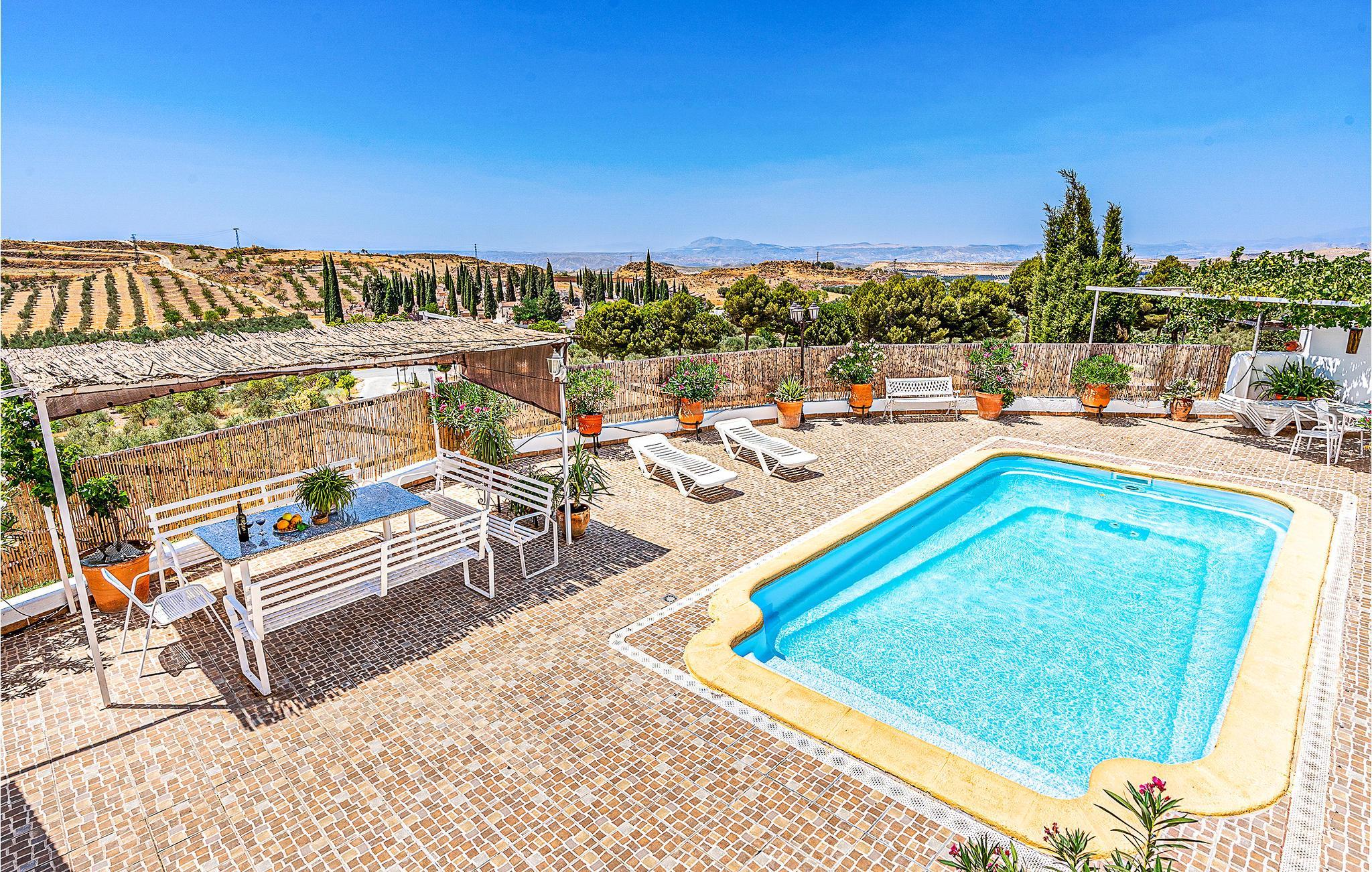 Huset passer ind i regionens landskab, integreres med naturen, byder på udsigt til Granadas bjerge og er let tilgængeligt i bil. Det flotte feriehus byder på komfortable og ventilerede værelser og er indrettet i en autentisk stil, som udstråler varme og gør det nemt at slappe af. En stor terrasse med spiseplads i skyggen og en indbydende swimmingpool giver jer smuk udsigt til Granadas bjerge. Snup friske dukkert i vandet og tilbring mange timers sjov med familien.