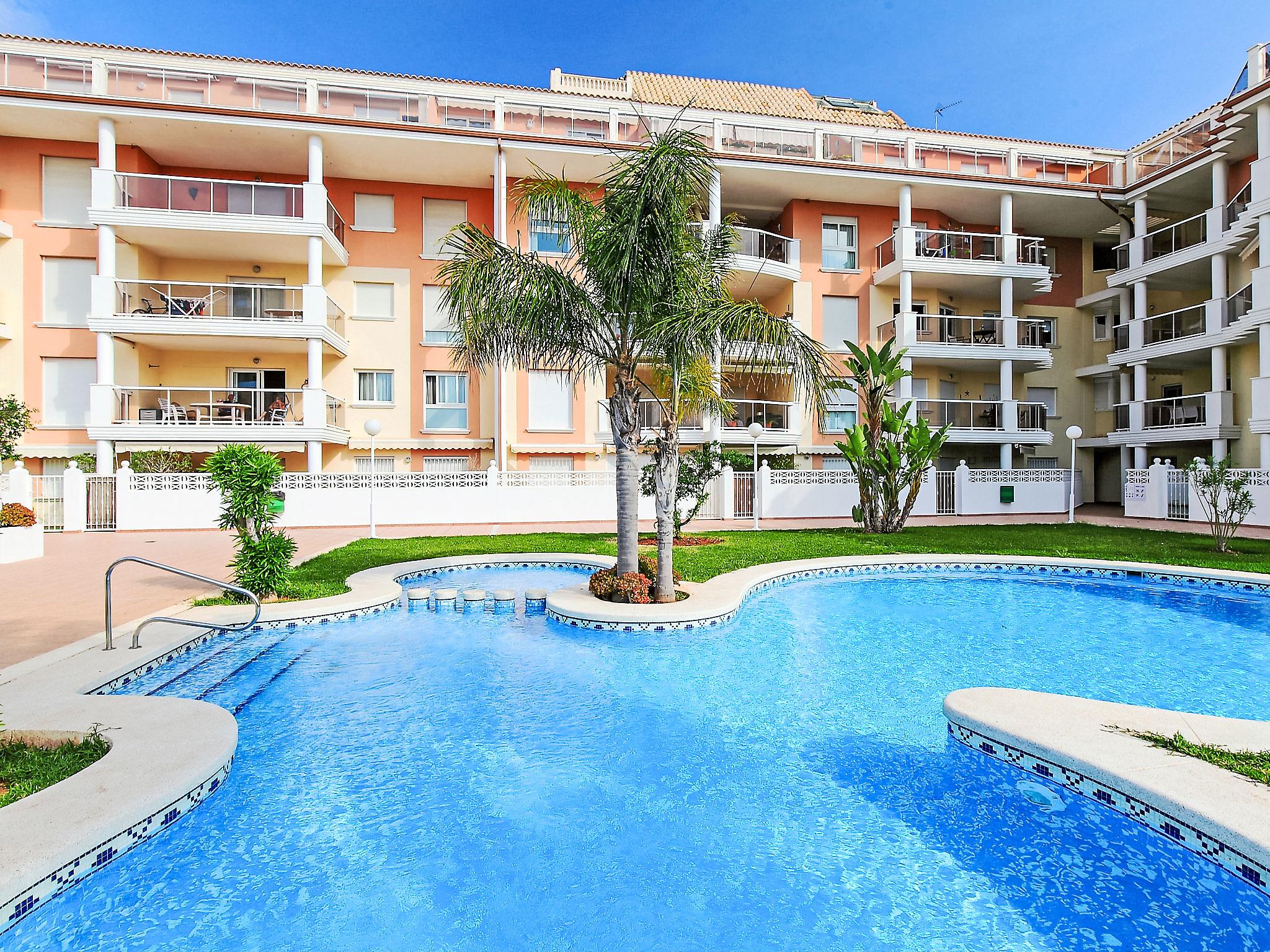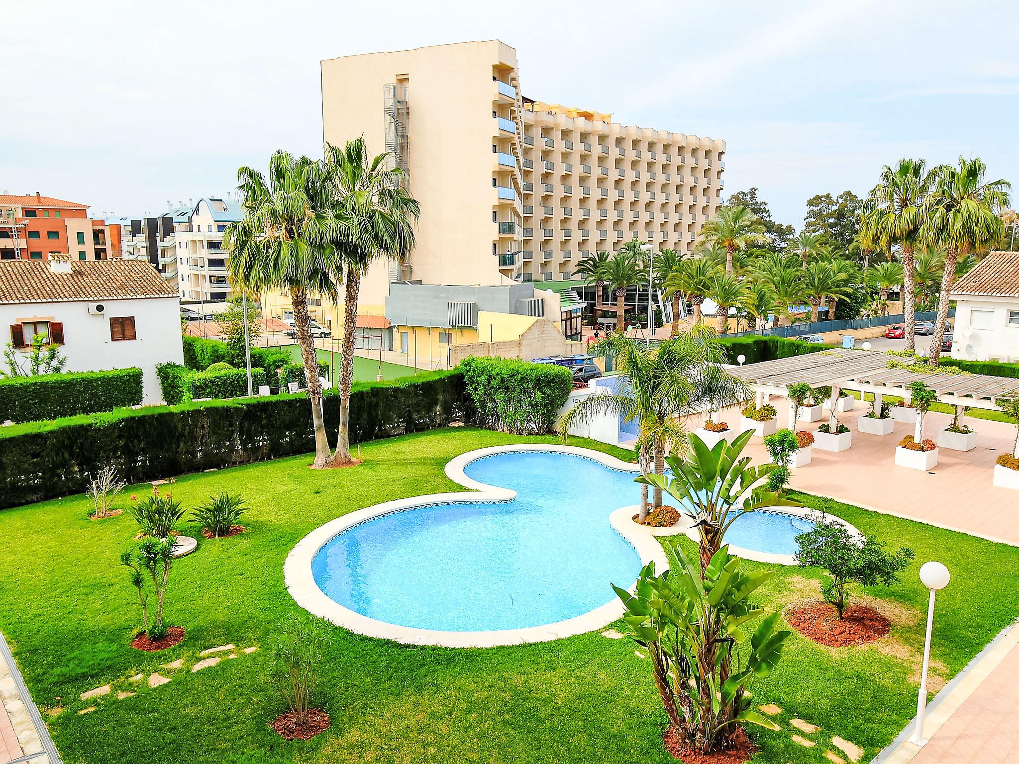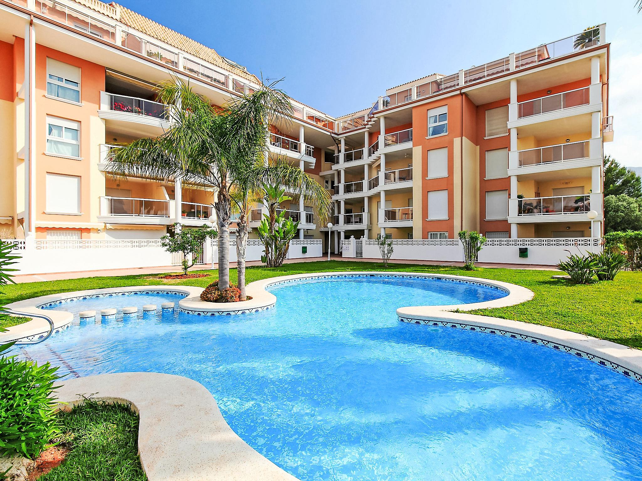 Sorts de la Mar 1 km from Dénia: Very beautiful, comfortable apartment block "Estrella del Mar", 3 storeys. On the outskirts, 1 km from the centre of Dénia, 130 m from the sea, 130 m from the beach, north facing position. For shared use: large garden (fenced) with lawn and trees, swimming pool (12 x 8 m, depth 80 - 210 cm, seasonal availability: 01.Jan. - 31.Dec.). Unconventional pool shape. Children's pool, outdoor shower. Bus stop 500 m, railway station 2.5 km, ferry 2.5 km. Nearby attractions: club náutico 500 m. The owner does not accept any youth groups.