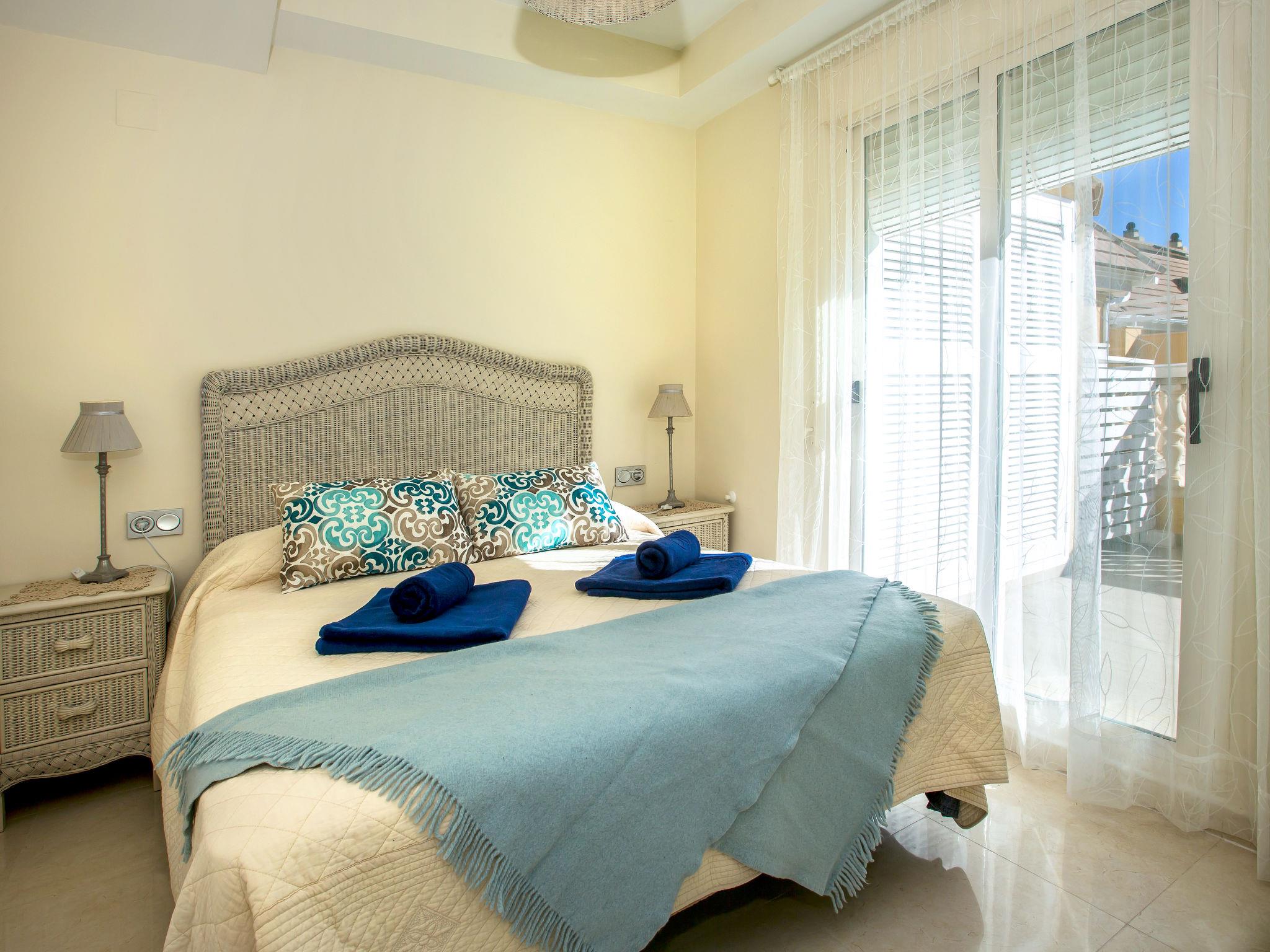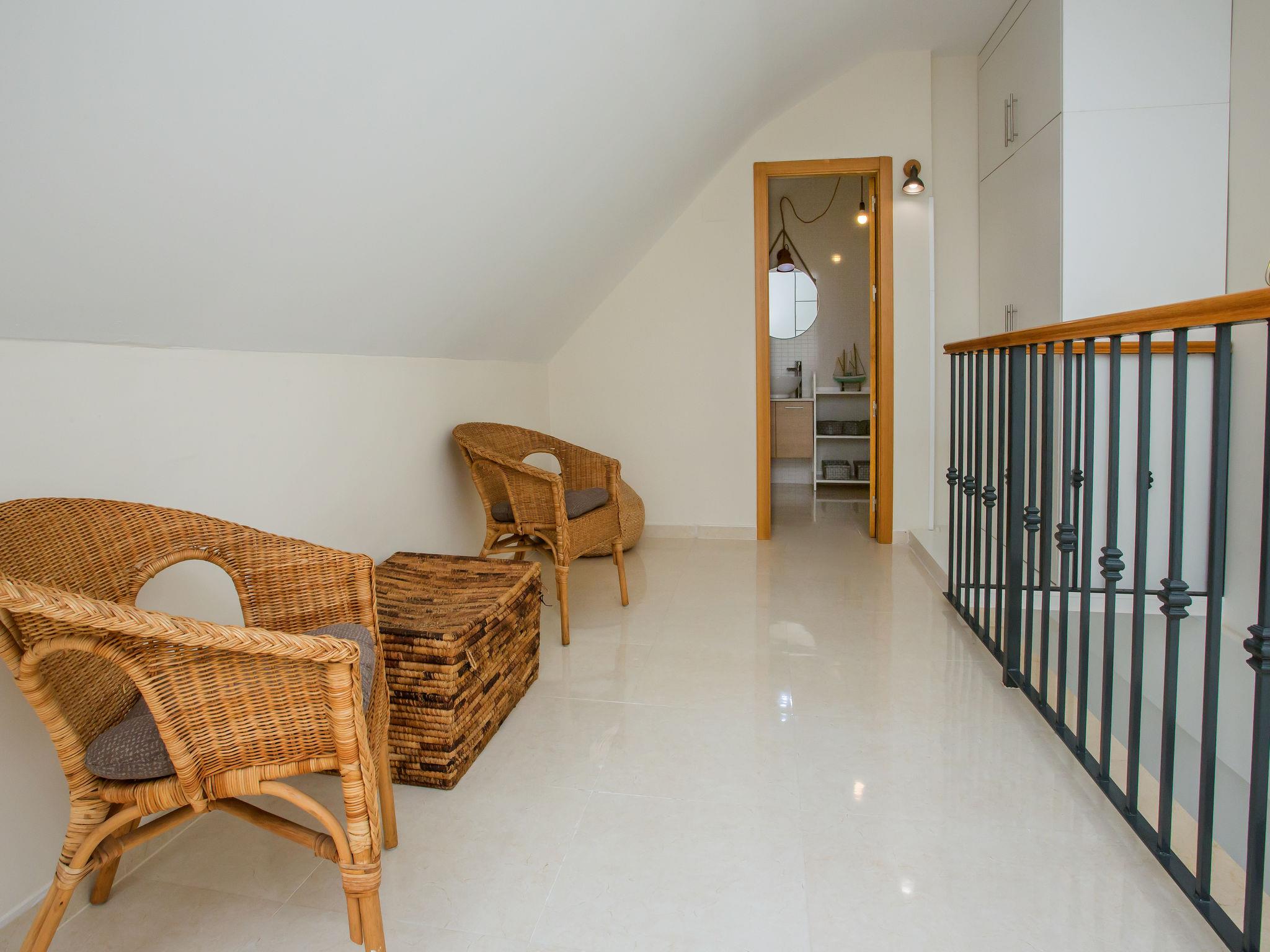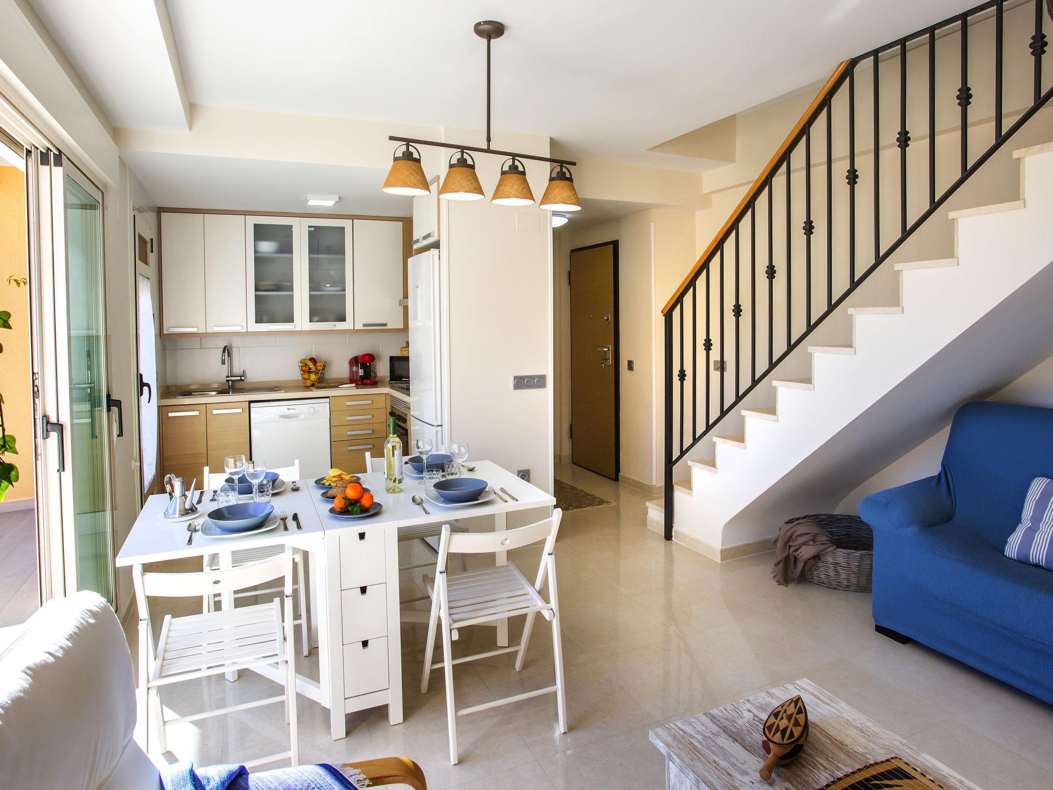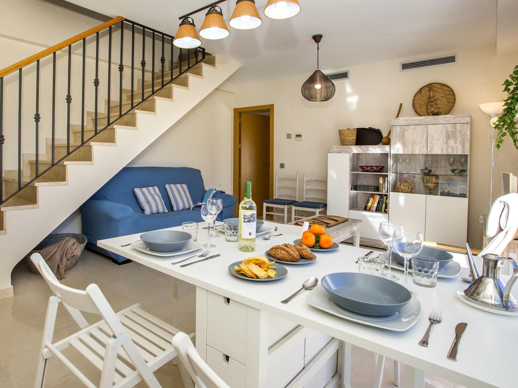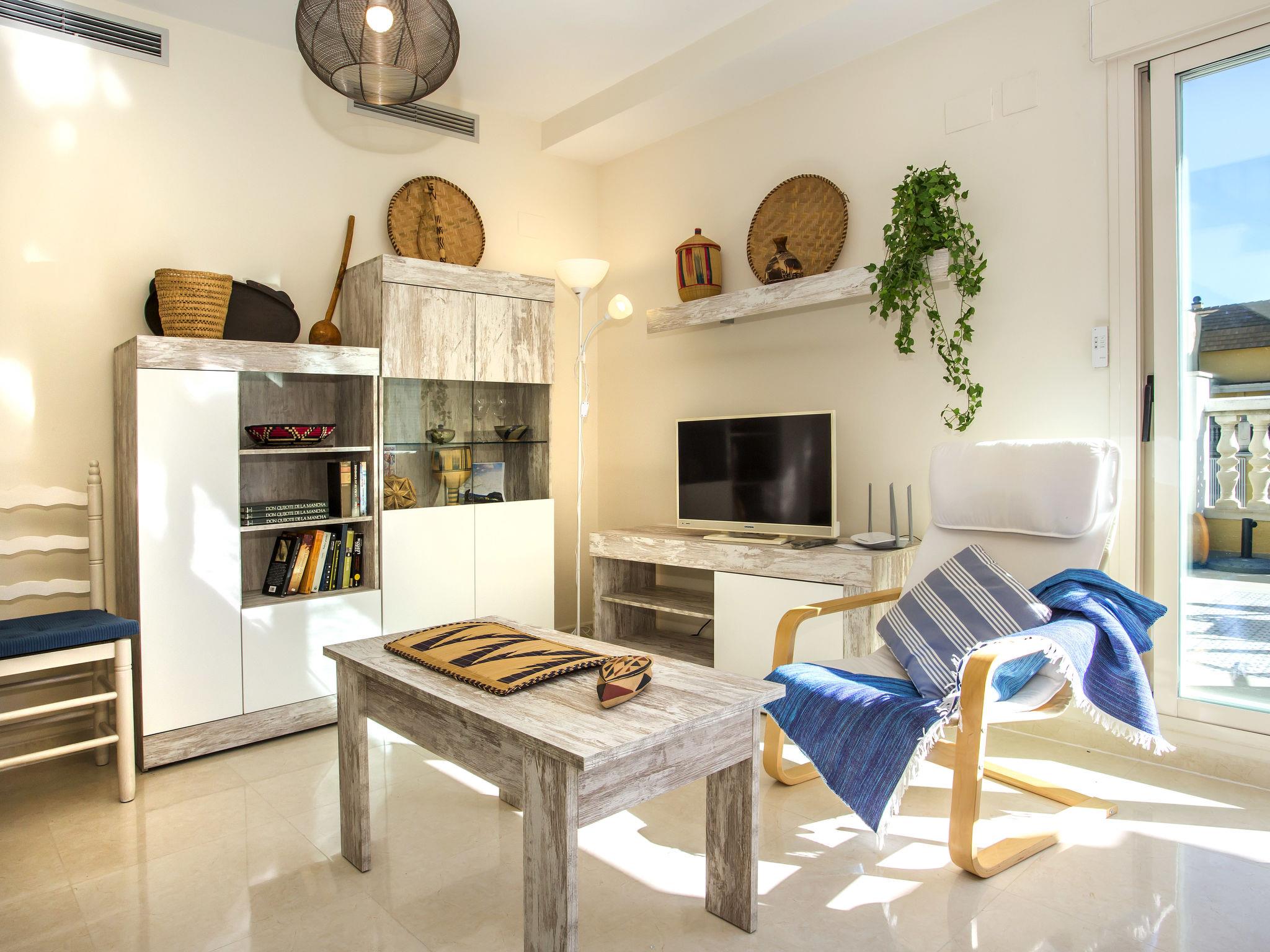 "Denia Plaza Bonita", 3-room penthouse 90 m2 on 2 levels. Spacious and bright, beautiful and cosy furnishings: living/dining room with digital TV, air conditioning and forced-air heating. Exit to the terrace. 1 room with 1 french bed (150 cm, length 200 cm), shower/bidet/WC, air conditioning and forced-air heating. Exit to the terrace. Open kitchen (oven, dishwasher, 4 ceramic glass hob hotplates, toaster, microwave, freezer, electric coffee machine). Upper floor: 1 room with sloping ceilings with 1 french bed (135 cm, length 200 cm), shower/WC, air conditioning and forced-air heating. Large terrace 35 m2. Terrace furniture. Marvellous view of the mountains, the valley and the swimming pool. Facilities: washing machine, iron, hair dryer. Internet (WiFi, free). Garage space n 150-2. Please note: maximum 1 pet/ dog allowed. TV only ES. R000000001