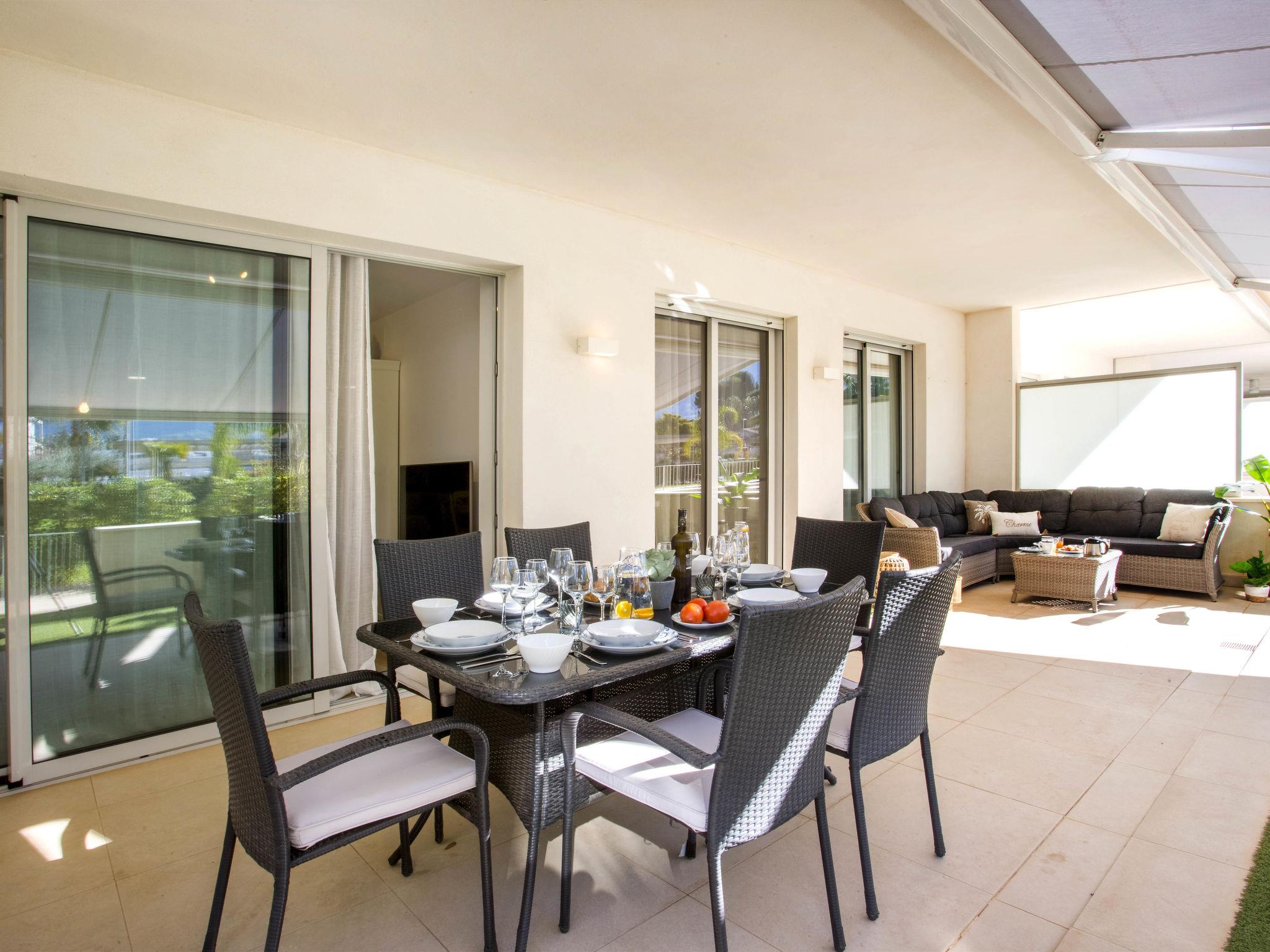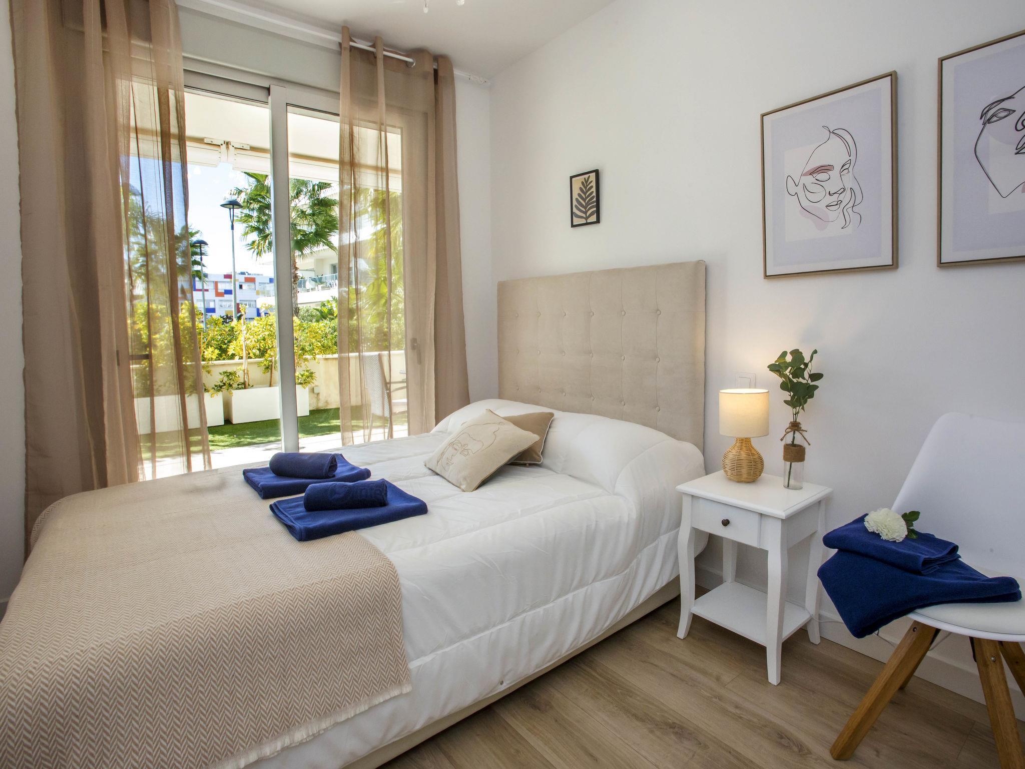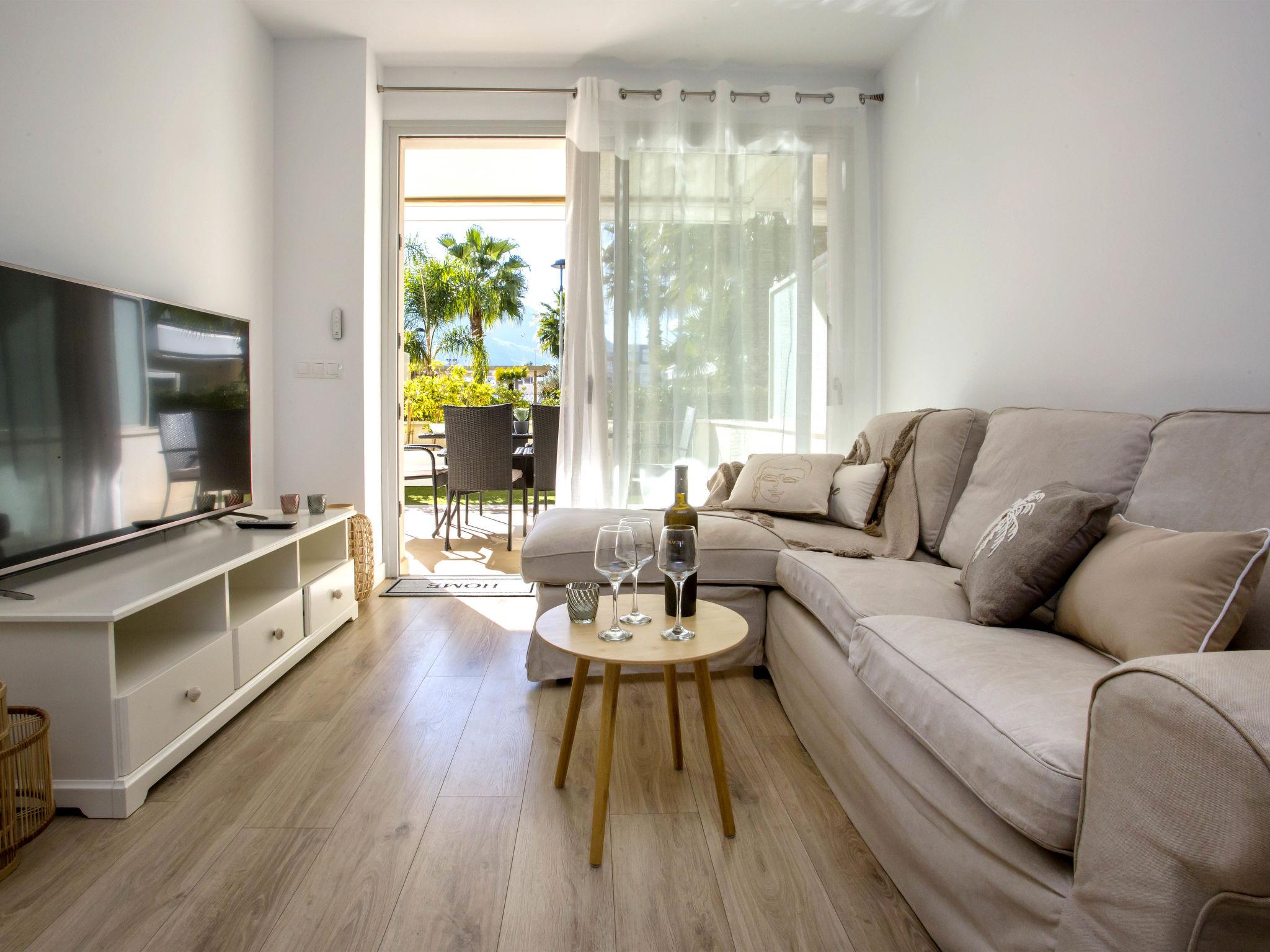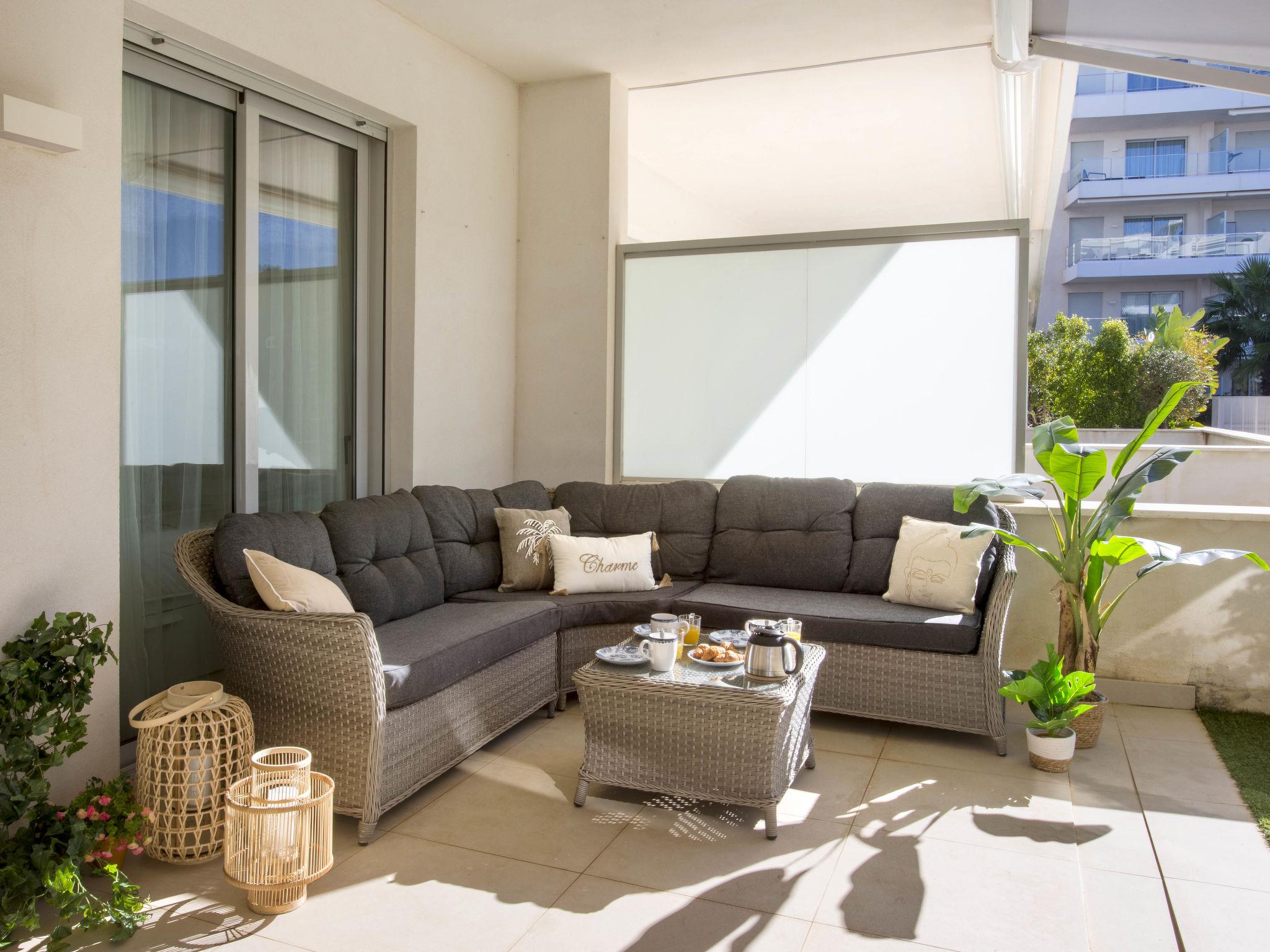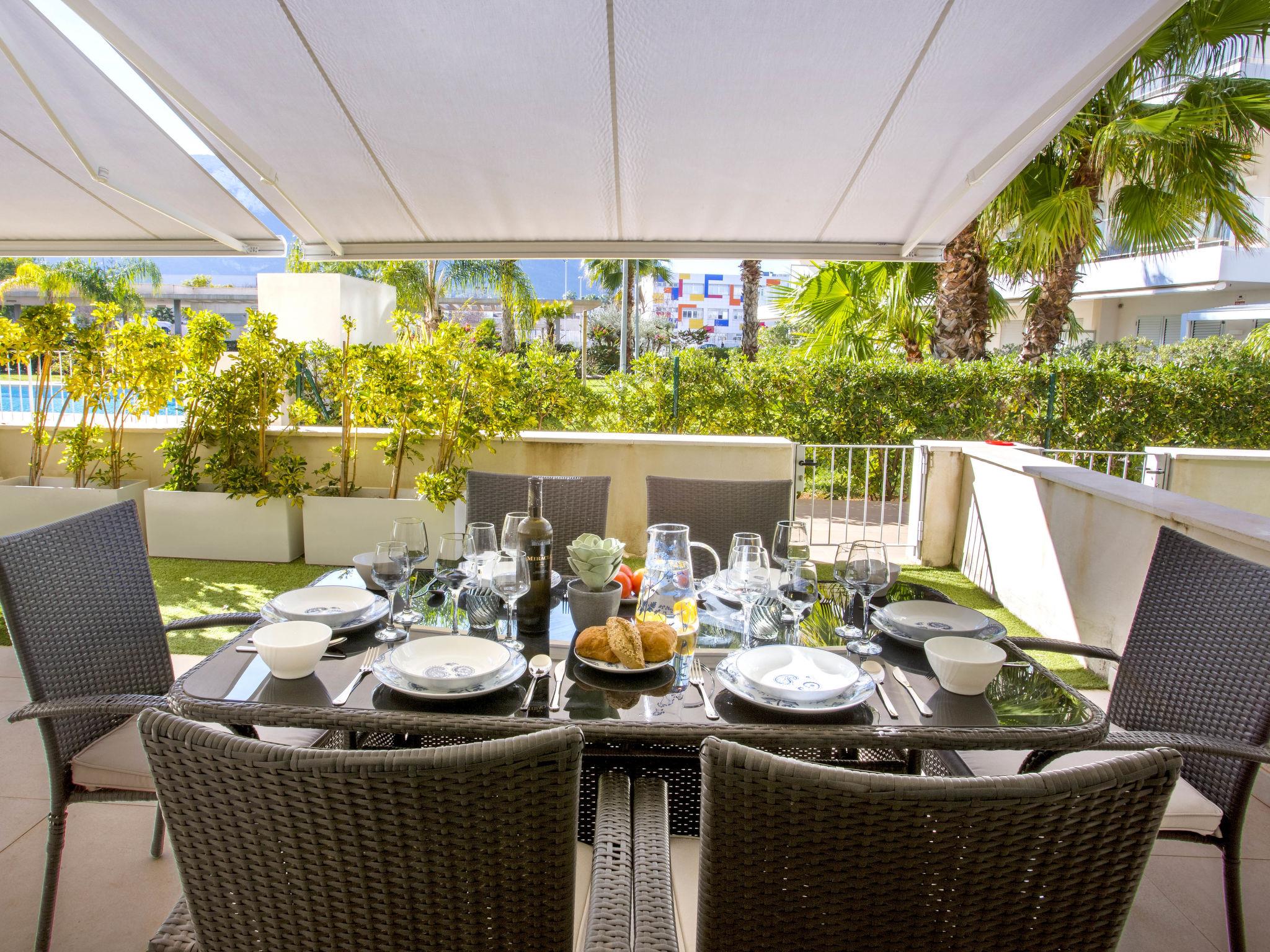 "Marina Real I", 3-room apartment 70 m2. Spacious and bright, very beautiful and stylish furnishings: living/dining room with digital TV, air conditioning and forced-air heating. Exit to the patio, to the swimming pool. 1 room with 1 french bed (160 cm, length 200 cm), shower/WC, air conditioning and forced-air heating. Exit to the terrace. 1 room with 1 french bed (140 cm, length 200 cm), air conditioning and forced-air heating. Exit to the terrace. Open kitchen (oven, dishwasher, 3 induction hot plates, toaster, kettle, microwave, freezer, electric coffee machine, Capsules for coffee machine (Senseo) extra). Shower/WC. Large terrace 40 m2. Terrace furniture, covered balcony. Very beautiful view of the mountains. Facilities: washing machine, dryer, iron, children's high chair, baby cot, hair dryer. Internet (WiFi, free). Garage space n 49. Please note: non-smokers only. CV-VUT0514959-A // Reg. Nr.: ESFCTU0000030550008251430000000000000CV-VUT0514959-A8
