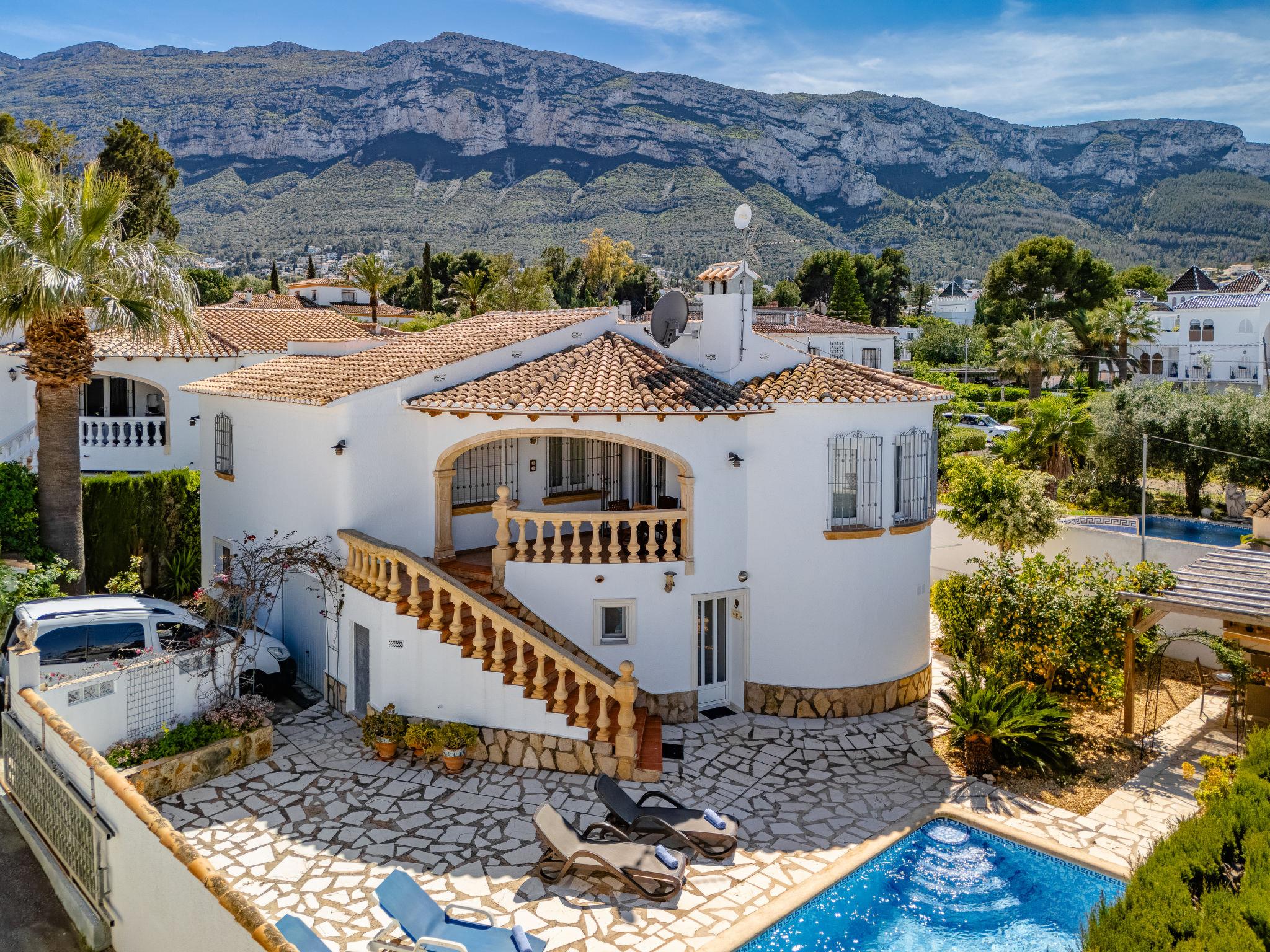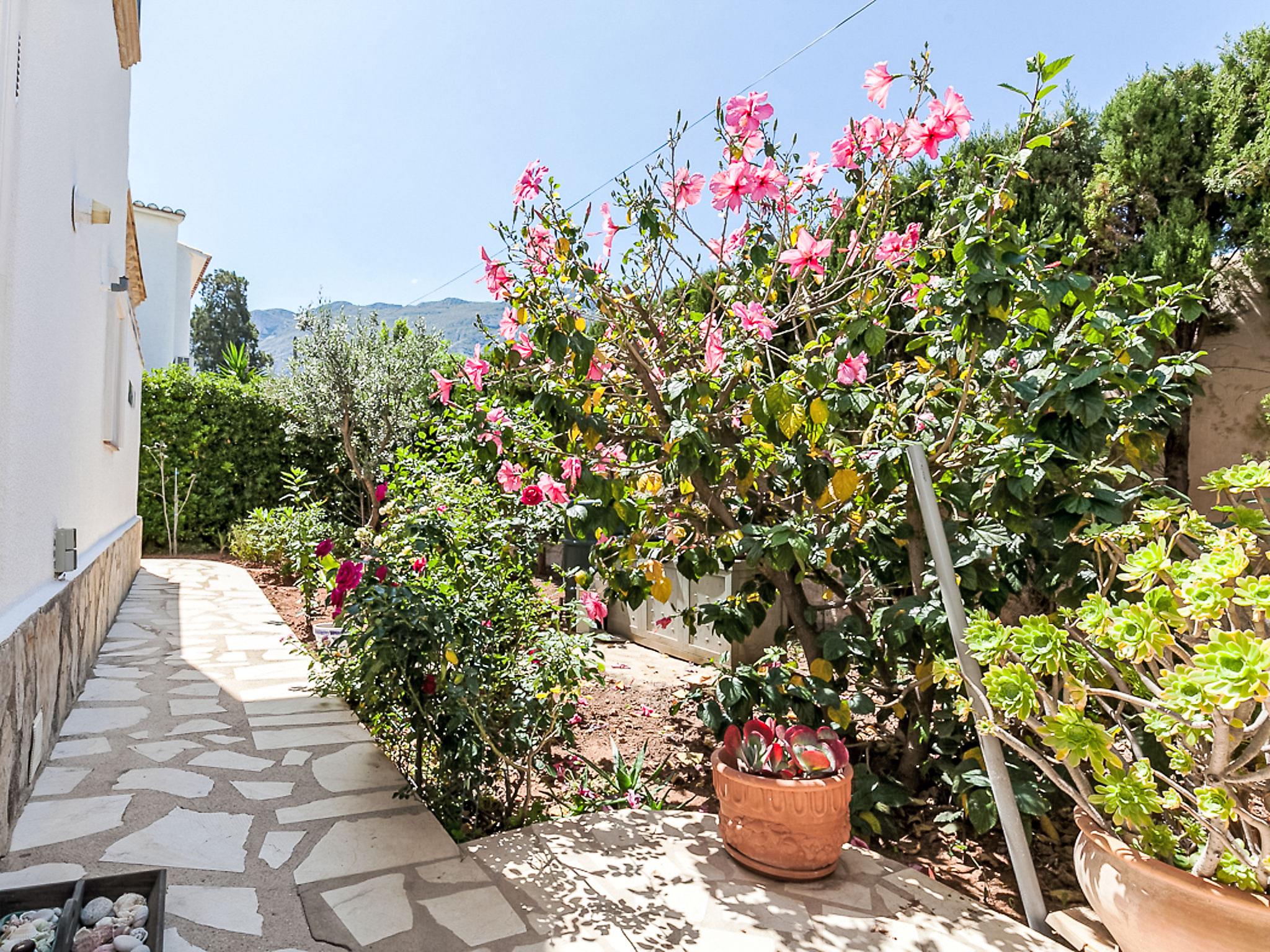 Cosy, very comfortable villa "Tulipanes". In the resort 500 m from the centre of de Dënia, in a quiet, sunny position residential area (villas). Private: beautiful, well-kept garden (fenced) with flowers and trees, swimming pool angular (4 x 8 m, depth 180 cm, seasonal availability: 01.Jan. - 31.Dec.). Outdoor shower, arbour, garden furniture, pool maintenance by the owner/gardener. Stepped path (13 steps) to the house. Parking on the premises, single garage. Supermarket, shopping centre, restaurant, bar 300 m, bus stop 1.8 km, railway station 1.8 km, ferry 3.6 km. Sports harbour 800 m, surf school, sailing school. The owner does not accept any youth groups.
