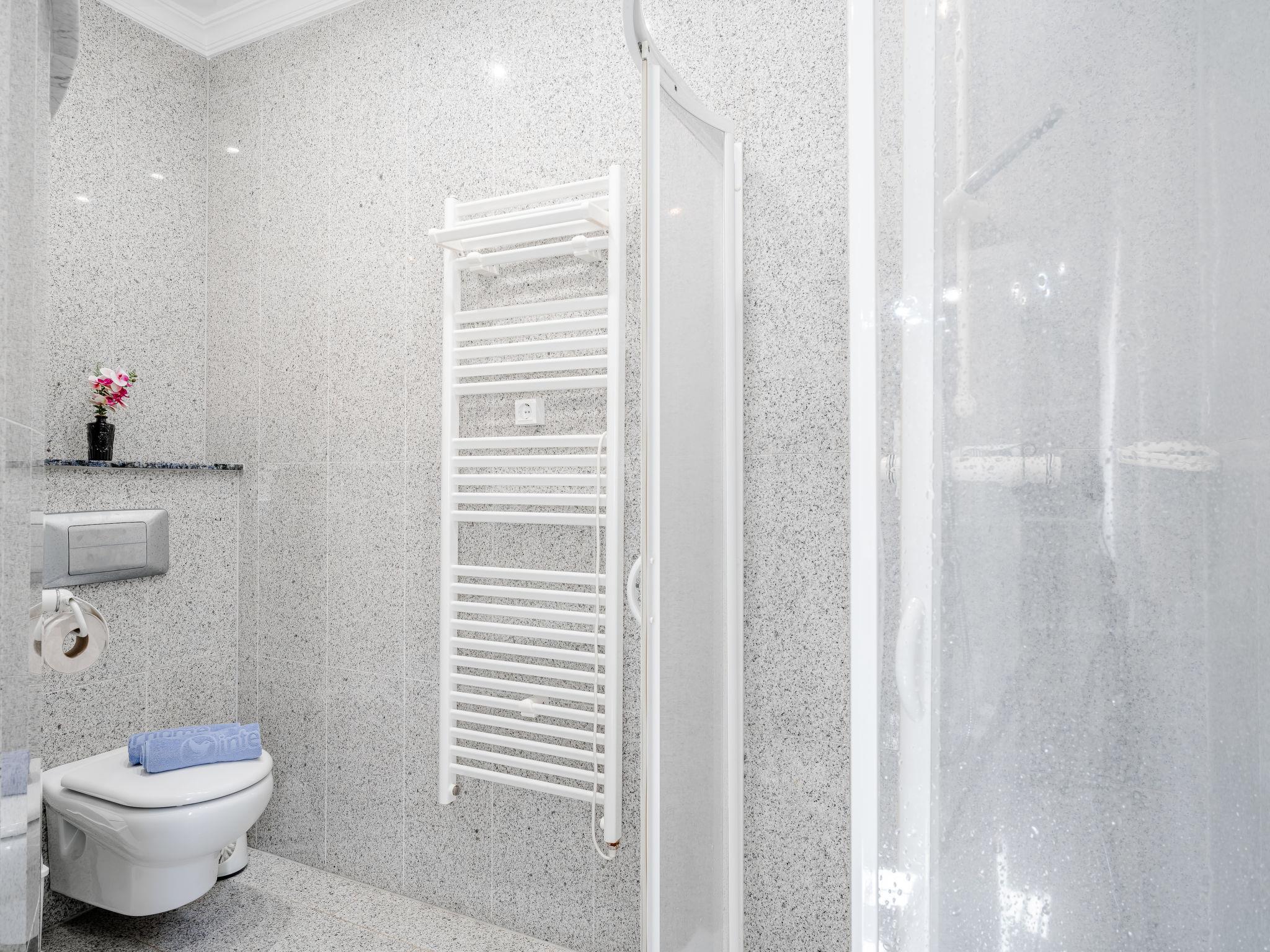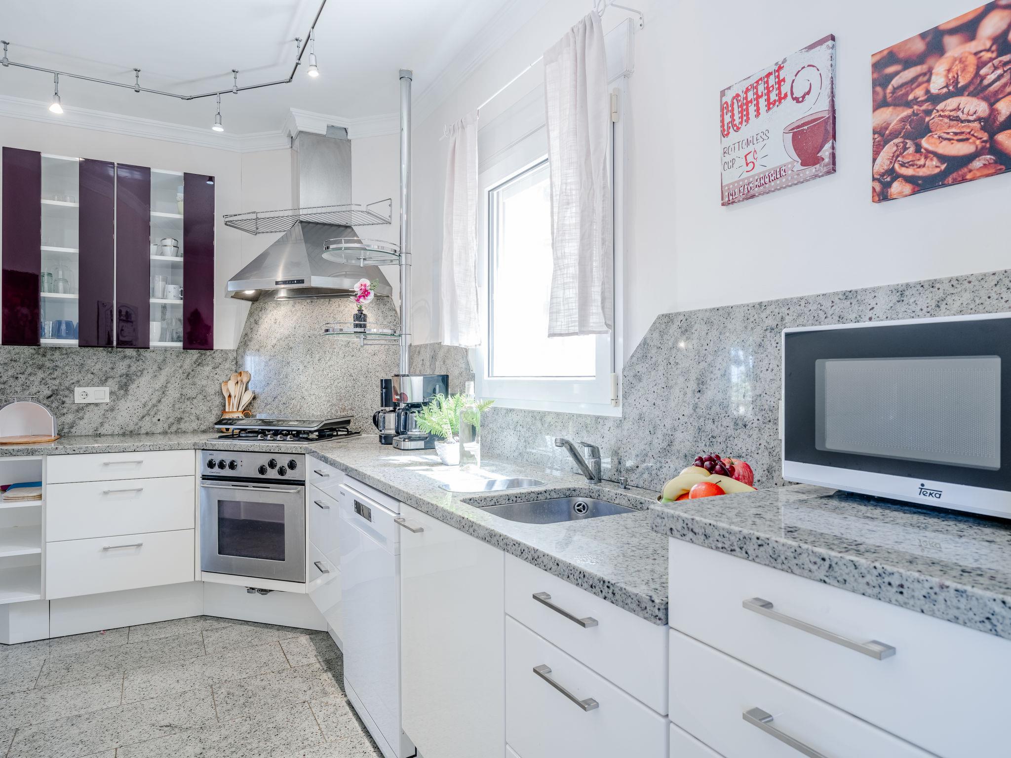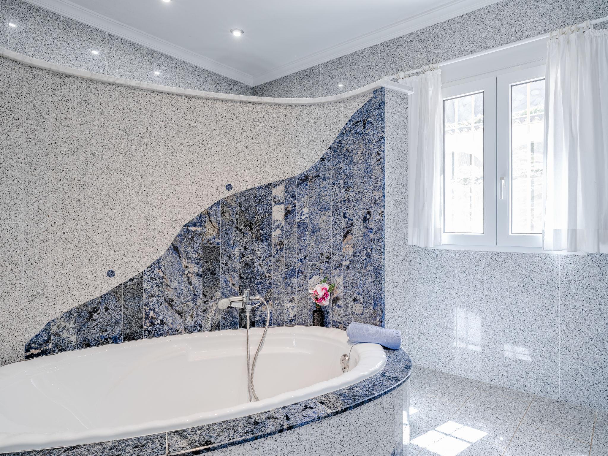 "Villa Rosa", 5-room house 270 m2 on 2 levels. Spacious and bright, very comfortable and cosy furnishings: living/dining room with open-hearth fireplace, satellite TV, air conditioning, fan and forced-air heating. Exit to the terrace. 1 room with 1 french bed (2 x 90 cm, length 200 cm), air conditioning and forced-air heating. Open kitchen (4 hot plates, oven, dishwasher, 2 ceramic glass hob hotplates, toaster, microwave, freezer, electric coffee machine). Sep. WC, bath/shower/WC. Floor heating. On the lower ground floor: living/dining room with air conditioning and forced-air heating. Upper floor: 1 room with 2 beds (90 cm, length 200 cm). 1 room with 1 french bed (2 x 90 cm, length 200 cm), shower/WC, air conditioning and forced-air heating. Patio. Terrace furniture, barbecue, covered balcony. Very beautiful view of the sea. Facilities: washing machine, dryer, iron, hair dryer. Internet (WiFi, free). CV-VUT0519341-A // Reg. Nr.: ESFCTU00000305500025946700000000000000000AT-437917-A3
