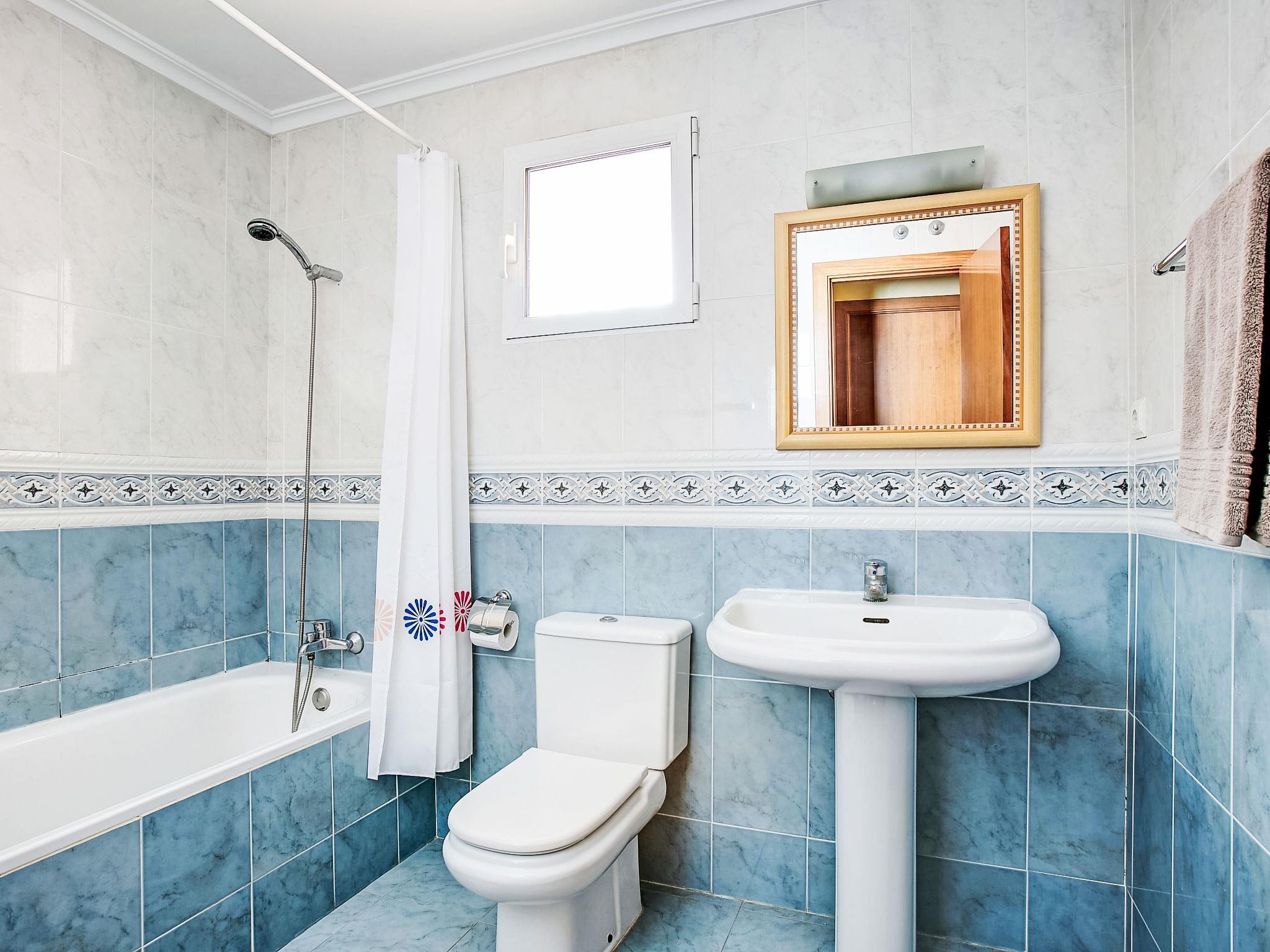 "Luz del Mediterraneo", 3-room apartment 60 m2 on 2nd floor. Spacious and bright, beautiful and tasteful furnishings: living/dining room with satellite TV, digital TV, DVD, air conditioning and forced-air heating. Exit to the terrace. 1 room with 1 french bed (1 x 150 cm, length 190 cm), air conditioning and forced-air heating. 1 room with 2 beds (90 cm, length 190 cm), electric heater. Kitchen (oven, 4 ceramic glass hob hotplates, toaster, kettle, microwave, freezer, electric coffee machine). Bath/bidet/WC, shower/WC. Large terrace 25 m2 partly roofed. Terrace furniture, deck chairs. Beautiful view of the mountains, the swimming pool and the garden. Facilities: washing machine, dryer, iron, children's high chair, baby cot for up to 2 year olds, hair dryer. Internet (WiFi, free). Parking space n 68 (roofed). Maximum 1 pet/ dog allowed. AT-423408-A // Reg. Nr.: ESFCTU00000304500052142800000000000000000AT-423408-A1