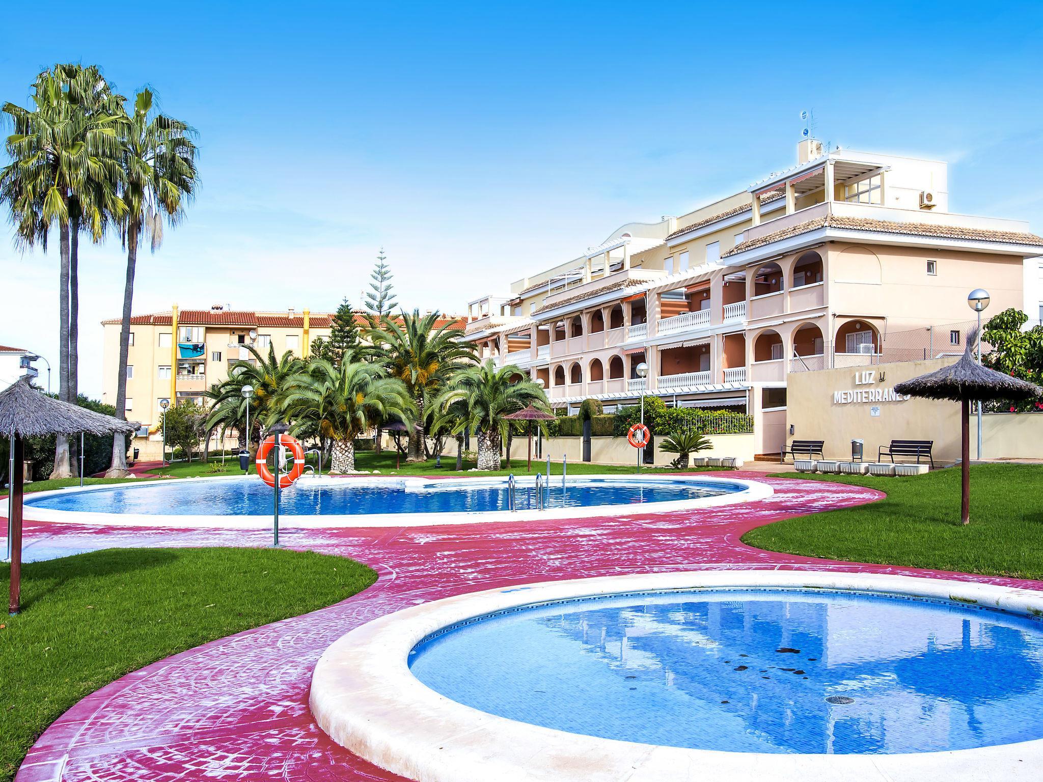 Beautiful, cosy apartment block "Luz del Mediterraneo", 3 storeys, built in 2001. 5 km from the centre of Dénia, in the district Les Marines, 200 m from the sea, 180 m from the beach, west facing position. For shared use: large, beautiful, well-kept garden (fenced) with lawn and plants, swimming pool (20 x 11 m, depth 230 - 80 cm, seasonal availability: 01.Jan. - 31.Dec.). Children's pool, outdoor shower, tennis. In the house: lift. Communal covered parking. Shop 300 m, supermarket 500 m, restaurant 250 m, café 250 m, bus stop 50 m, sandy beach "Els Molins" 250 m. Sports harbour 5 km, golf course (18 hole) 2 km. The owner does not accept any youth groups.
