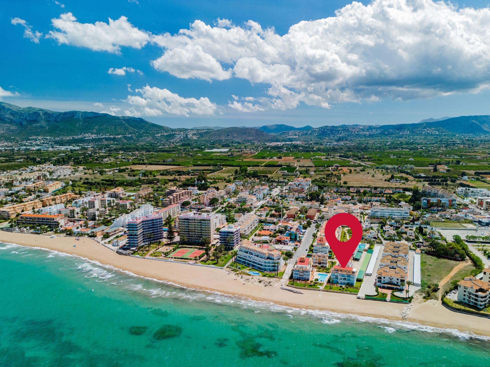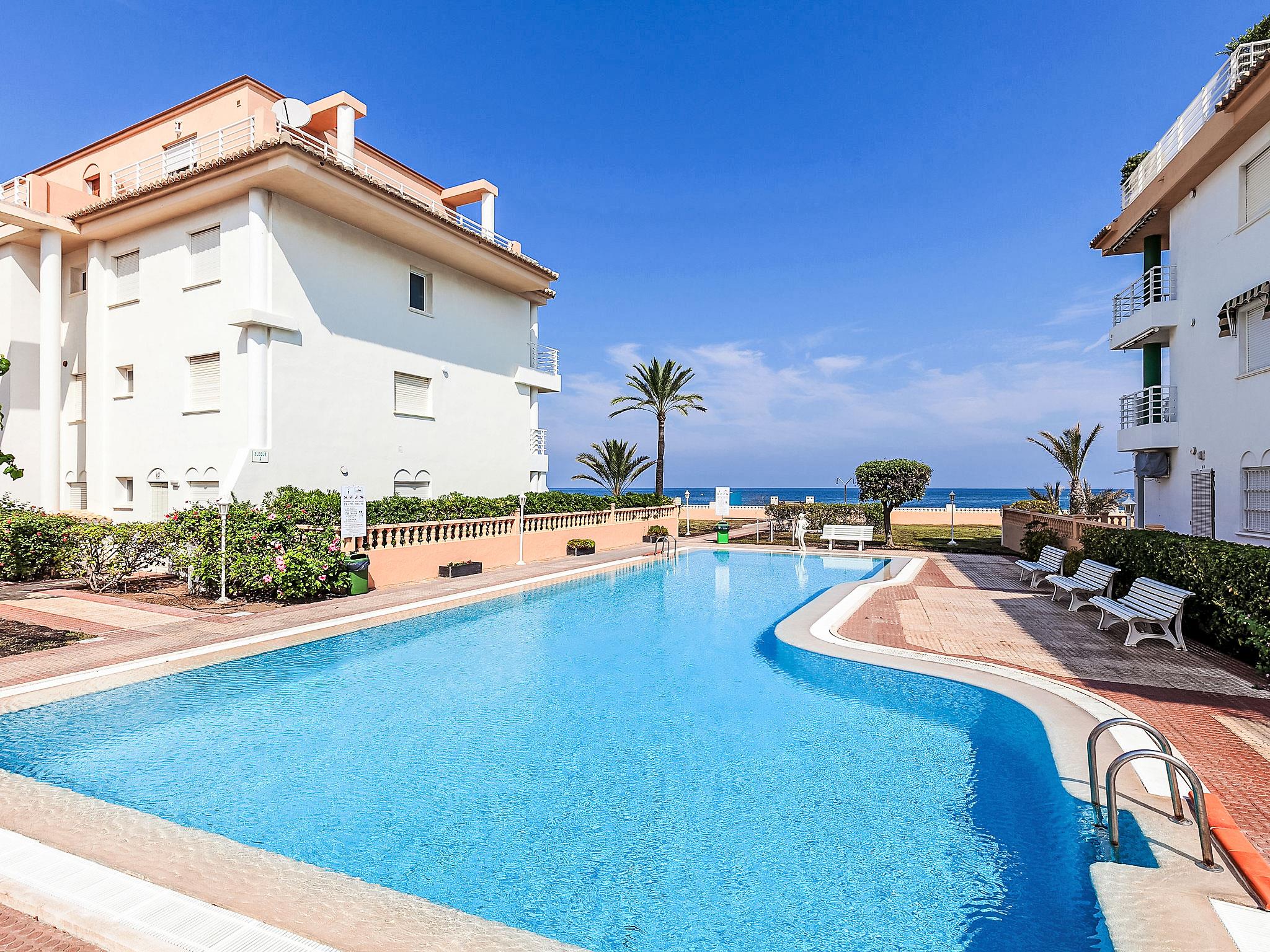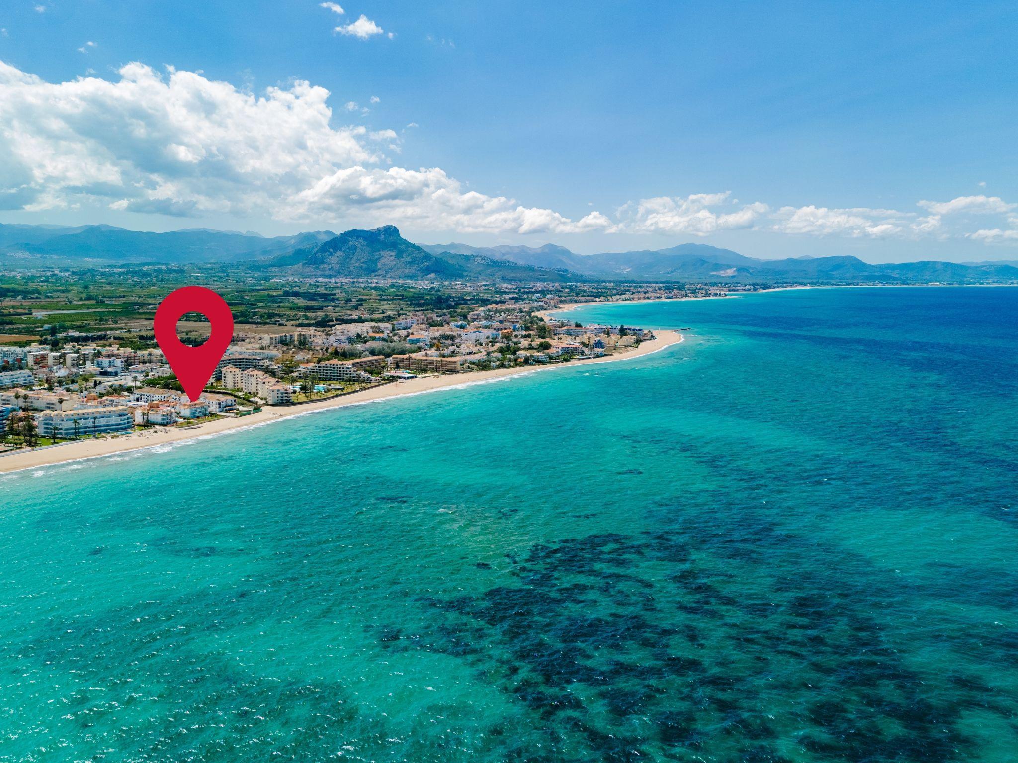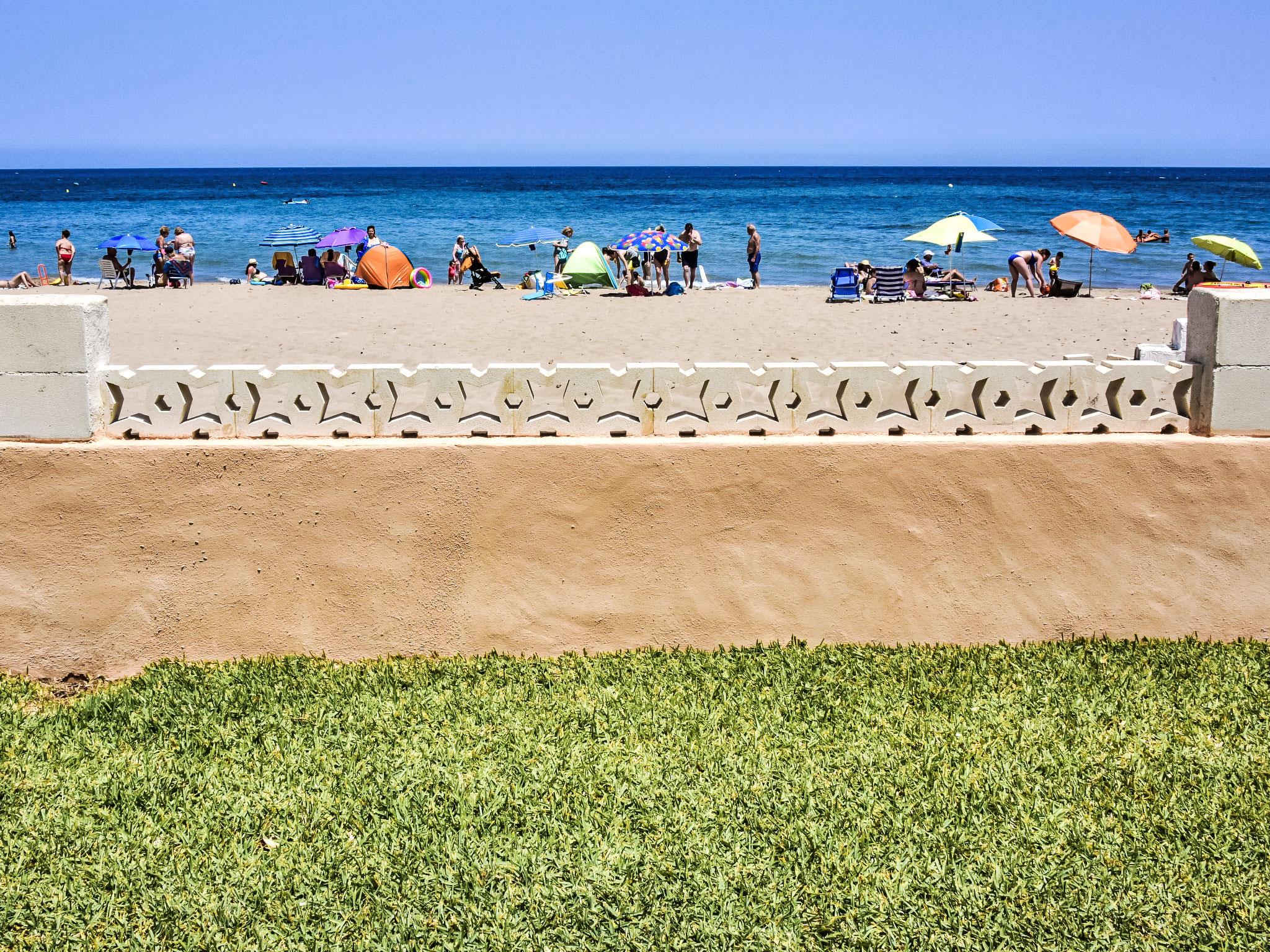 Les Marines 4 km from Dénia: Apartment block "Talima". In the district Les Marines, 50 m from the sea, 15 m from the beach, direct access to the beach, in a cul-de-sac. For shared use: garden (fenced) with lawn, swimming pool (16 x 8 m, depth 75 - 250 cm, seasonal availability: 01.Jan. - 31.Dec.). Outdoor shower. Supermarket 450 m, restaurant 200 m, bar, café, bus stop 450 m, railway station 6.4 km, ferry 5.4 km, sandy beach 30 m.
