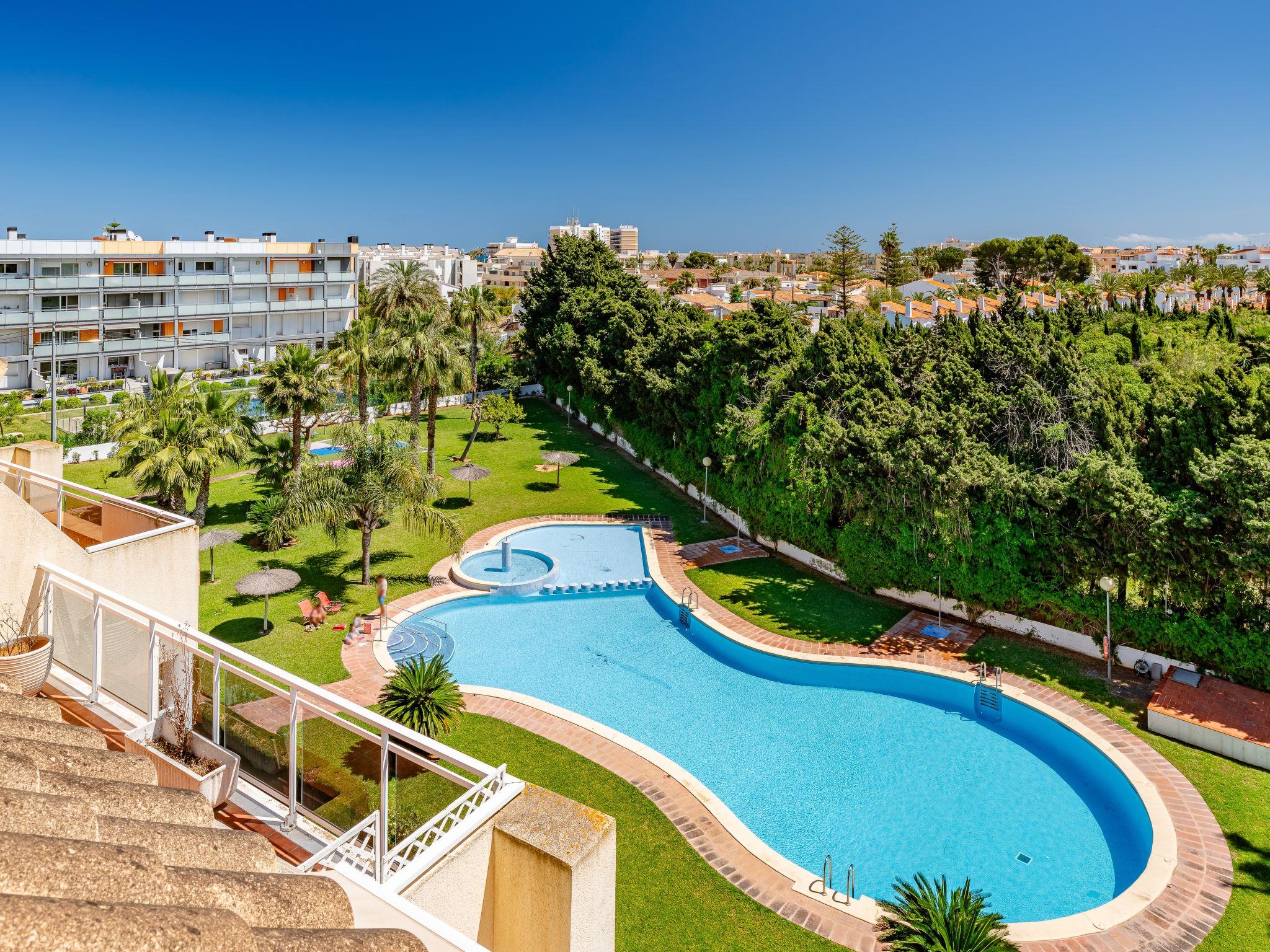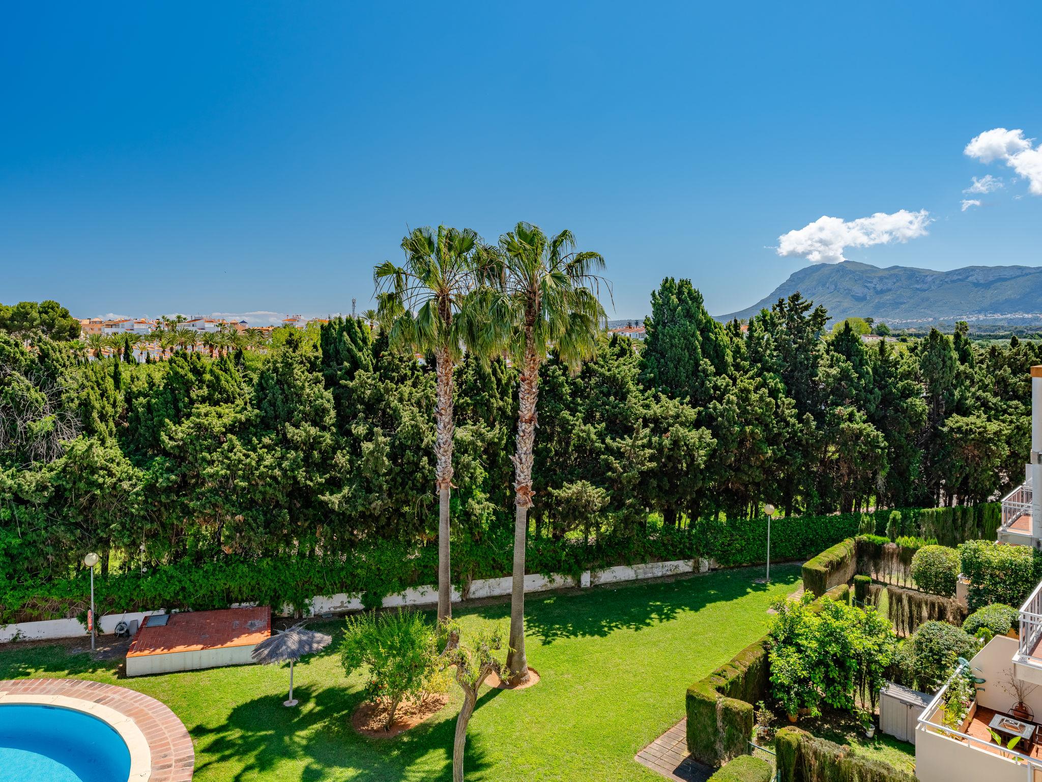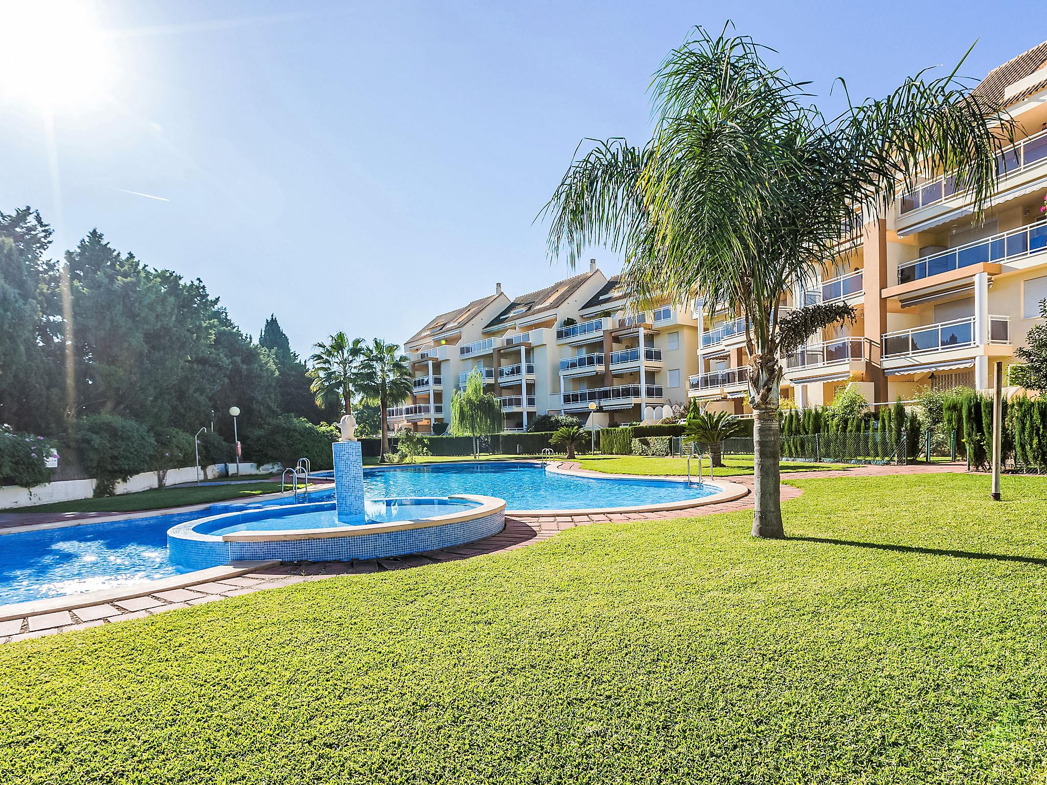 Apartment block "Los Sauces". 4.5 km from the centre of Denia, 500 m from the sea. For shared use: large garden (fenced) with lawn and trees, swimming pool (seasonal availability: 01.Jan. - 31.Dec.) with internal staircase. Children's pool, outdoor shower, children's playground (swing, sandbox). Private: swimming pool kidney shaped (28 x 15 m, depth 40 - 210 cm, seasonal availability: 01.Jan. - 31.Dec.) with internal staircase. Paddling pool, outdoor shower. In the house: lift. Parking on the premises, communal covered parking. Supermarket, restaurant, bar, bus stop 300 m, sandy beach 500 m. Sports harbour 4 km, marina 4 km. The owner does not accept any youth groups.