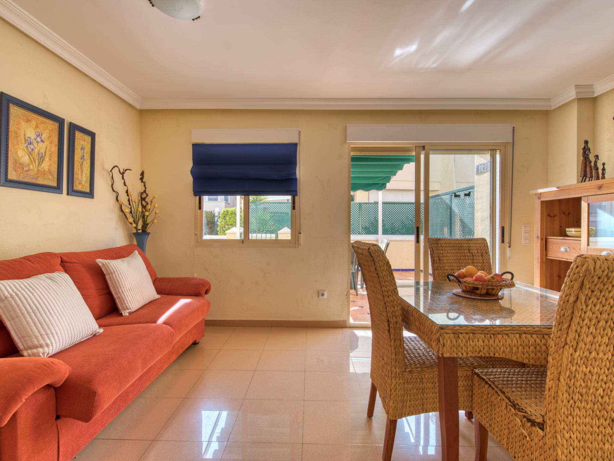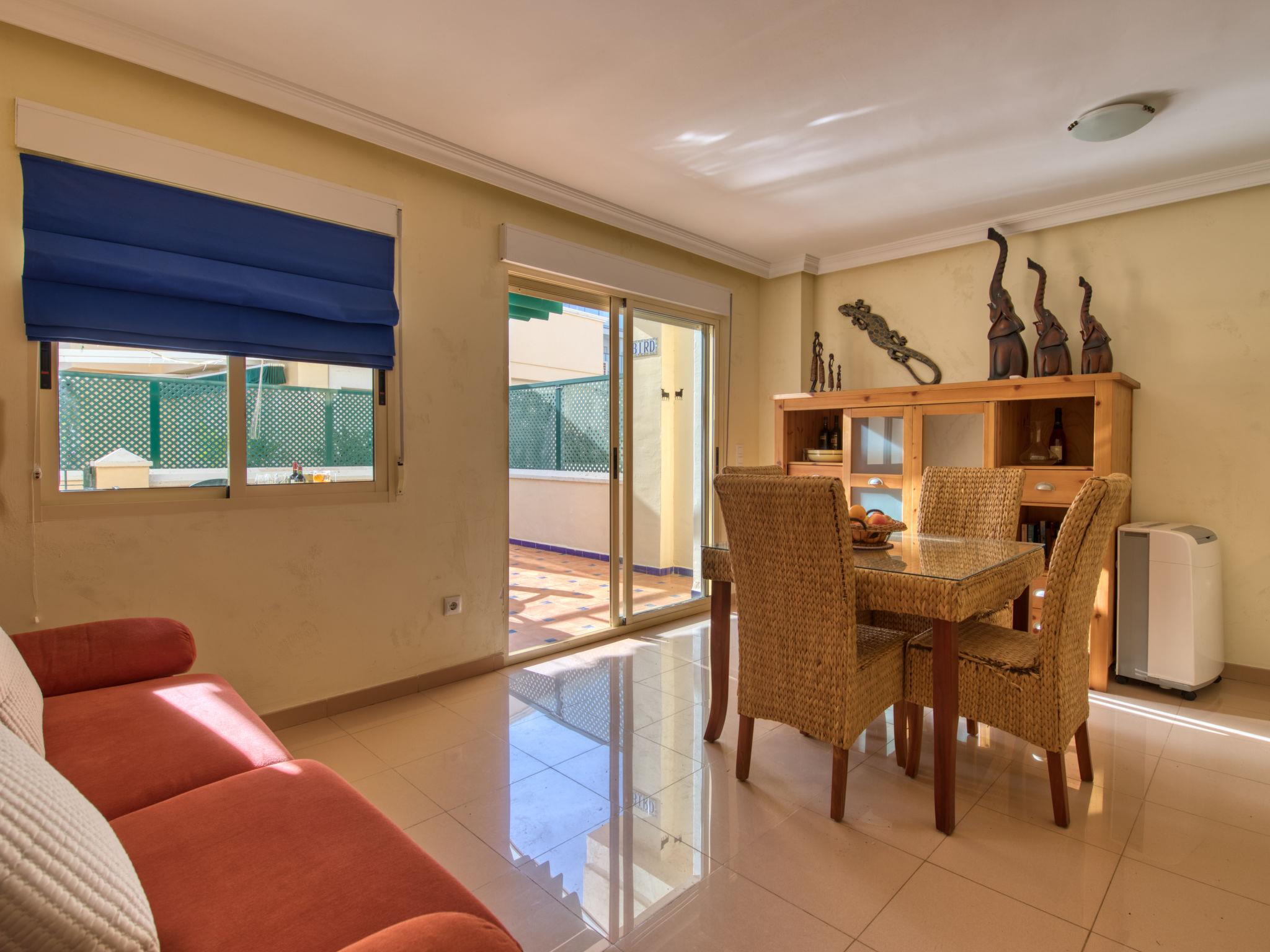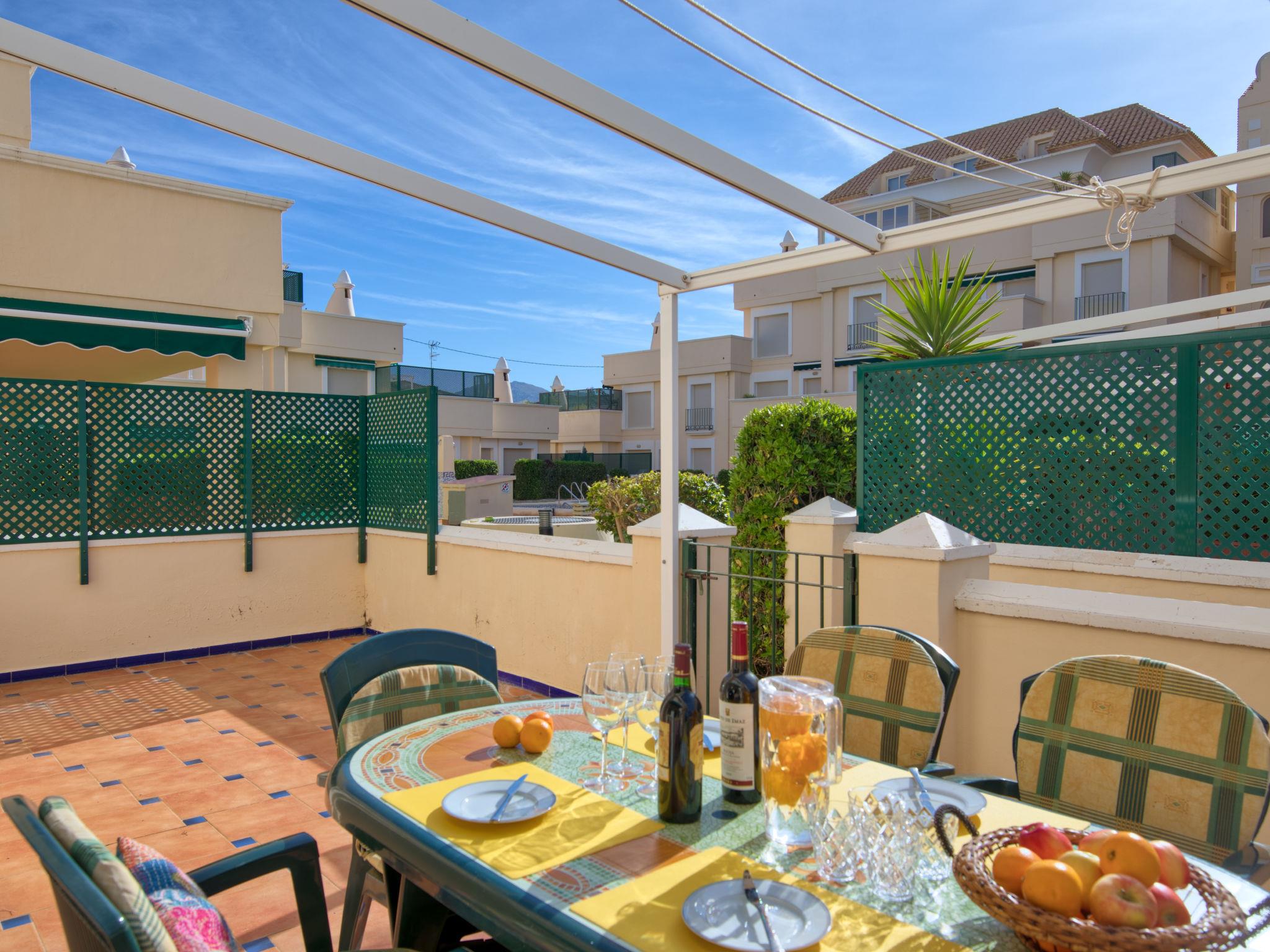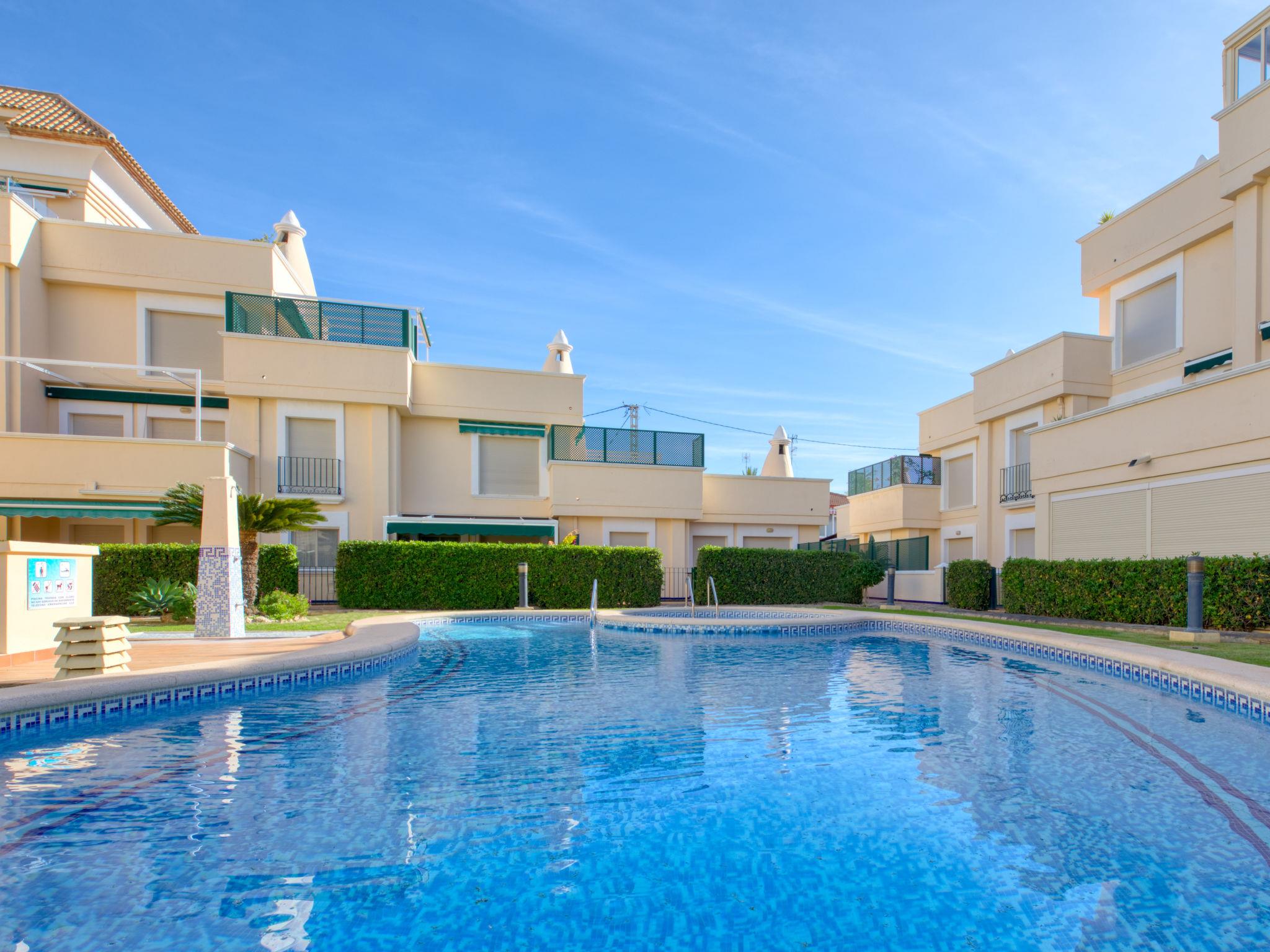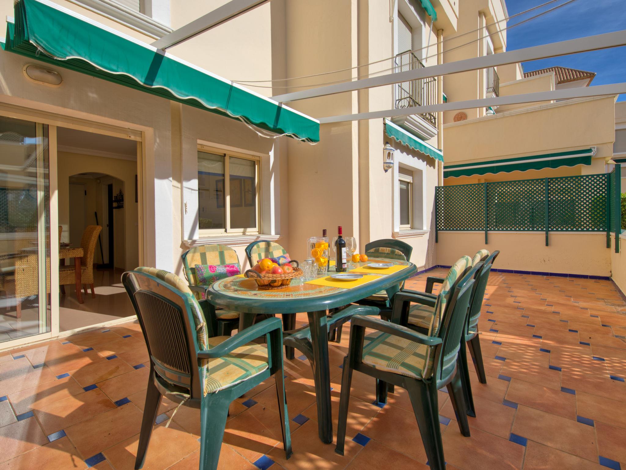 Cosy, comfortable apartment block "Medina del Sol I". 4.5 km from the centre of Denia, in a quiet position, 230 m from the sea, 230 m from the beach. For shared use: garden (fenced) with lawn and flowers, swimming pool (15 x 7 m, depth 110 - 210 cm, seasonal availability: 01.Jan. - 31.Dec.) with internal staircase. Children's pool, outdoor shower, public car park. Supermarket 150 m, restaurant, bar, café, bus stop, sandy beach 230 m. Sports harbour 4.5 km, tennis 3 km. The owner does not accept any youth groups.