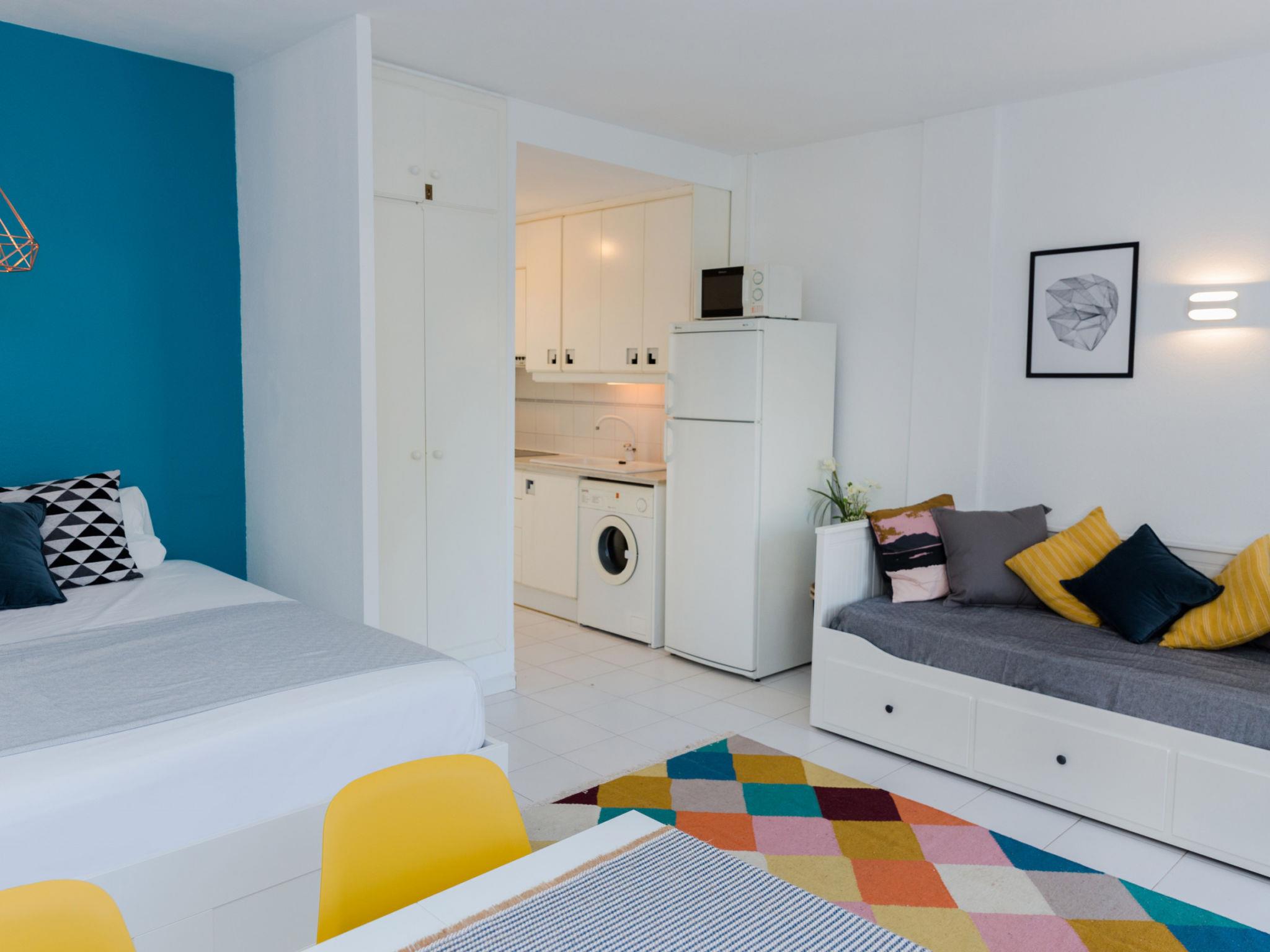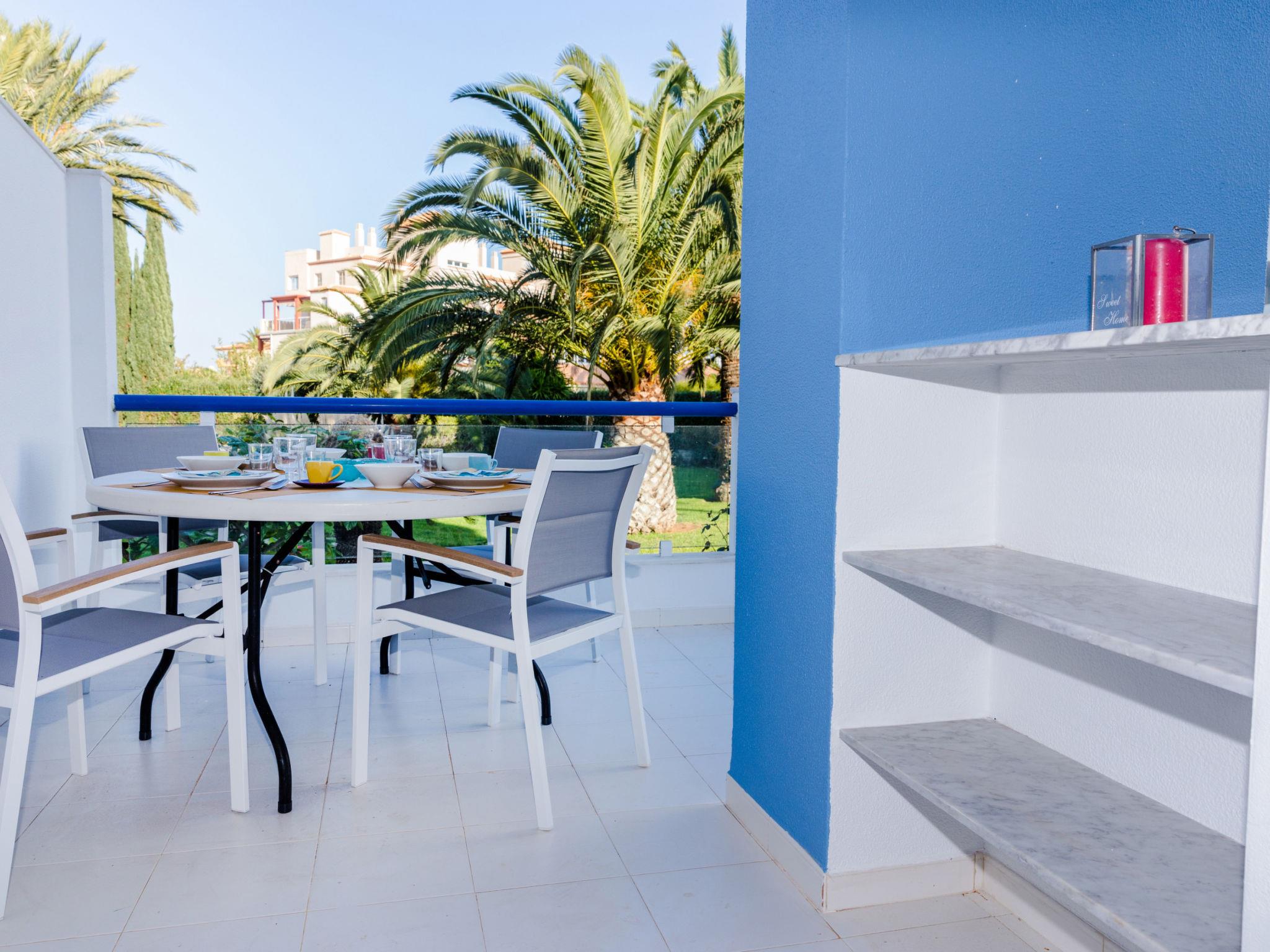 "Cala Blanca Denia", 1-room apartment 35 m2. Spacious and bright, very beautiful and cosy furnishings: living/dining room with 1 french bed (150 cm, length 190 cm), digital TV, air conditioning and forced-air heating. Exit to the terrace, to the swimming pool. Open kitchen (oven, 4 ceramic glass hob hotplates, toaster, kettle, microwave, freezer, electric coffee machine). Shower/WC. Terrace. Terrace furniture. Facilities: washing machine, iron, hair dryer. Internet (WiFi, free). Parking. Please note: TV only ES. R000000001