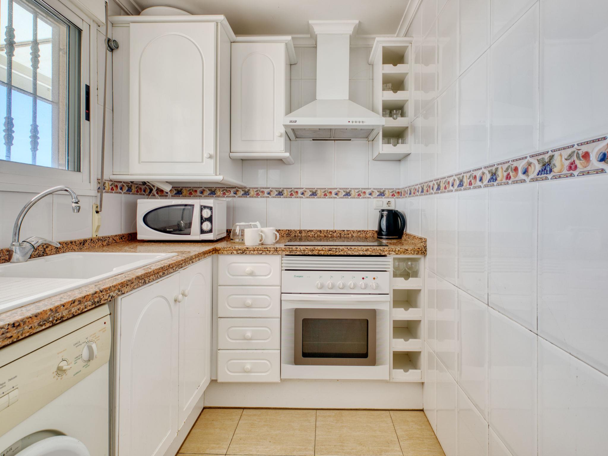 Cosy apartment block "Bahia Blanca", 3 storeys. In the district of Les Marinas, 4 km from the centre of Denia, 300 m from the sea, road to cross. For shared use: well-kept garden (fenced) with lawn, swimming pool (seasonal availability: 01.Jan. - 31.Dec.). Children's pool. In the house: lift. Parking. Supermarket 1 km, restaurant 200 m, bar, bus stop 20 m, sandy beach 200 m. The owner does not accept any youth groups.