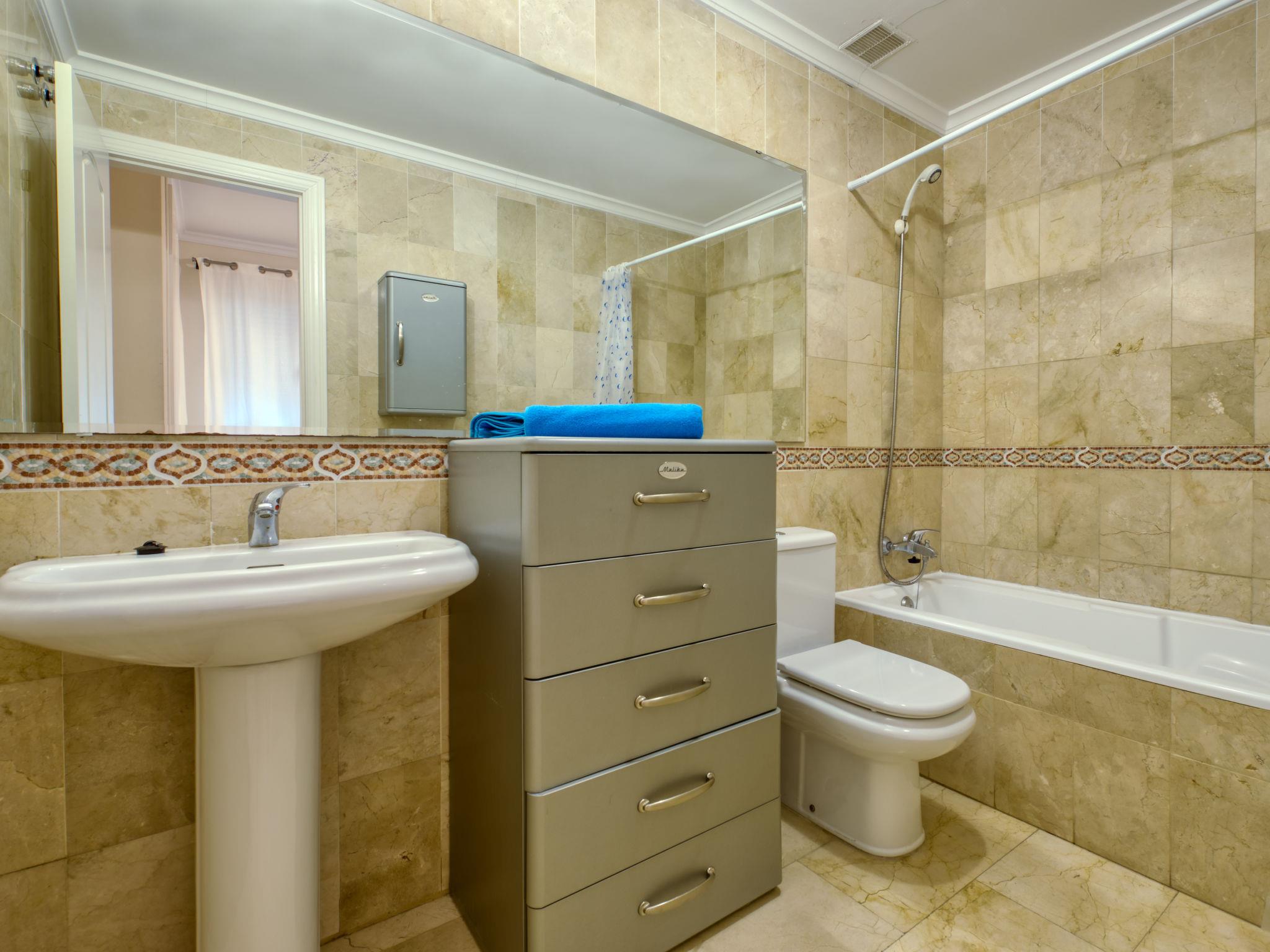 "Bahia Blanca", 2-room penthouse 50 m2 on 3rd floor. Practical and cosy furnishings: living/dining room with 1 sofabed, digital TV, international TV channels, flat screen, air conditioning and forced-air heating. Exit to the terrace. 1 room with 1 french bed, bath/WC and electric heating. Kitchen (oven, 3 ceramic glass hob hotplates, toaster, kettle, microwave, freezer, electric coffee machine). Terrace partly roofed. Terrace furniture. View of the swimming pool and the garden. Facilities: washing machine, iron, children's high chair, baby cot for up to 2 year olds, hair dryer. Internet (WiFi, free). Parking space n 13. Maximum 1 pet/ dog allowed. AT-434565-A // Reg. Nr.: ESFCTU00000304500053882200000000000000000AT-434565-A3