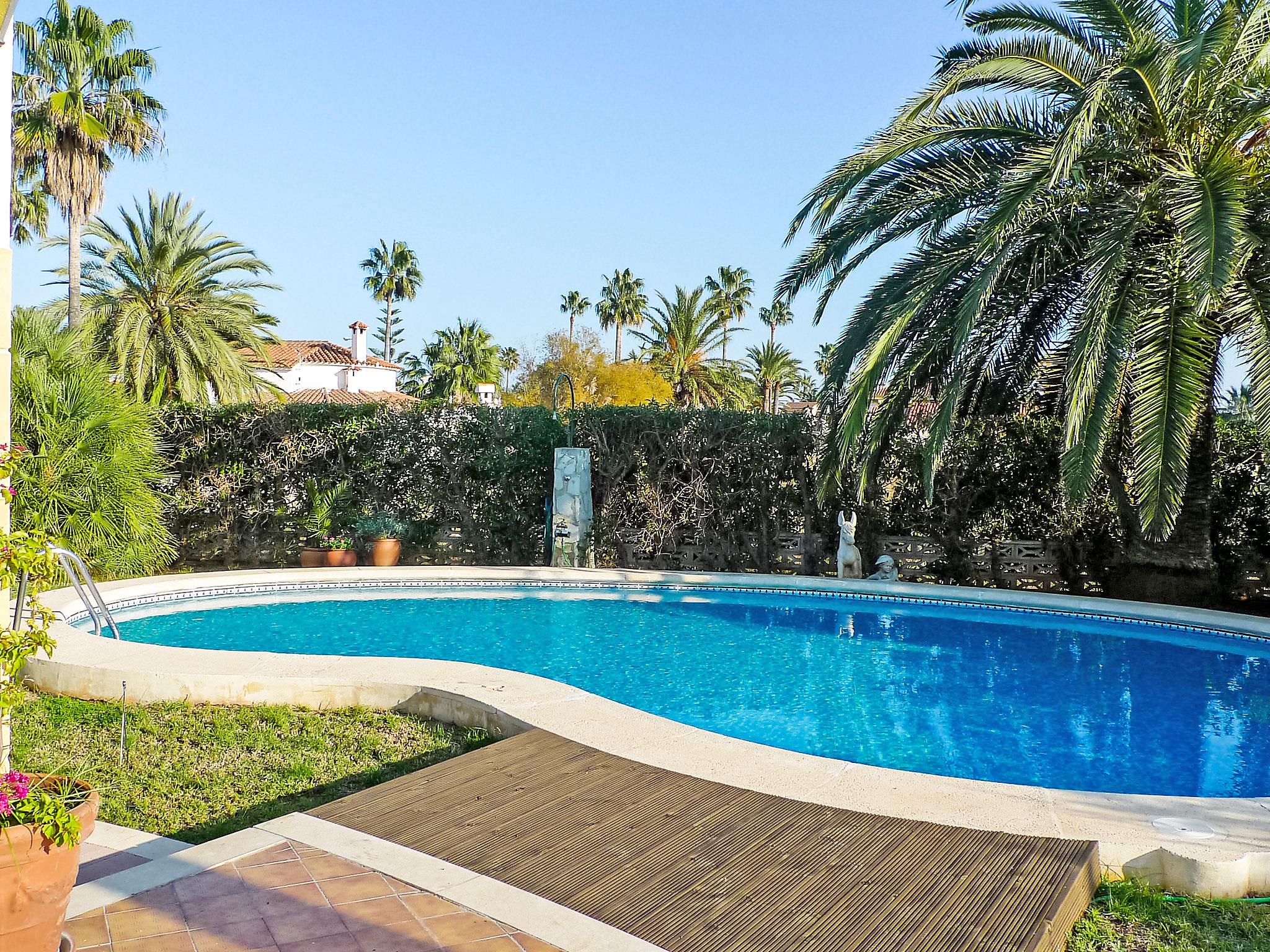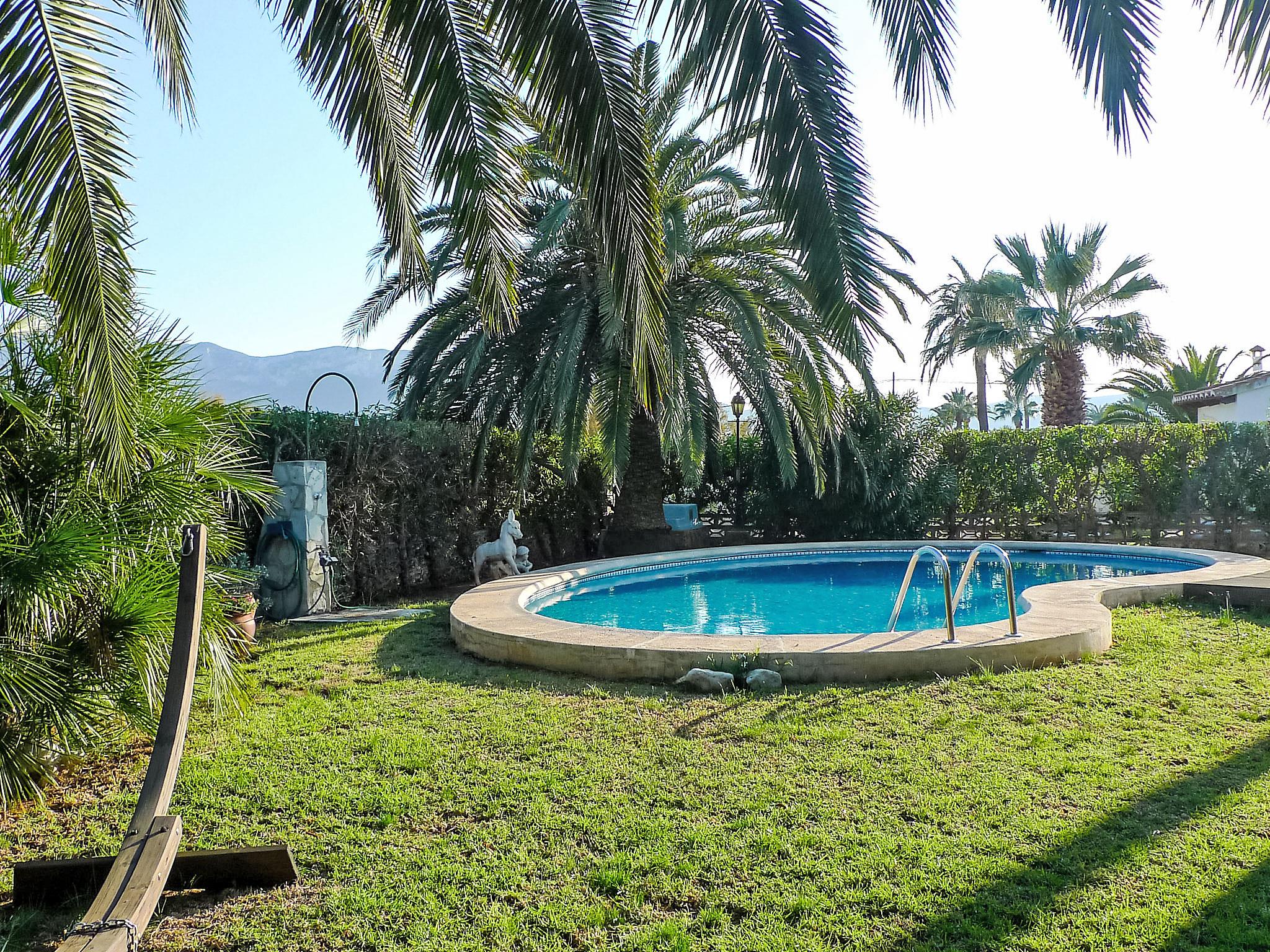Cosy house "El Paradiso". Outside the resort, 3 km from the centre of Dénia, in a quiet position, 250 m from the sea, road to cross, located by a road, east facing position. Private: garden (fenced) with lawn 800 m2 trees, swimming pool kidney shaped (4 x 8 m, seasonal availability: 01.Jan. - 31.Dec.). Outdoor shower, garden furniture, barbecue house, roofed, parking on the premises. Supermarket, restaurant, bar 700 m, café, bus stop 150 m, sandy beach 250 m. Golf course (18 hole) 10 km, tennis 2 km. The owner does not accept any youth groups.