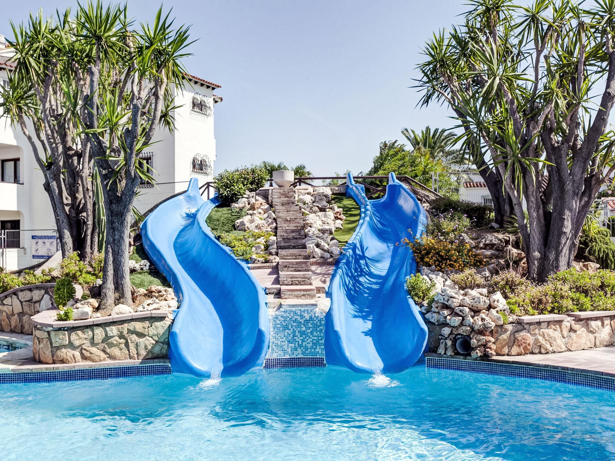 Residence with 2 shared swimming pools. Tennis open from middle of June to middle September (extra) 250 m away. Large, cosy residence "El Palmar 9". In the district of Las Marinas, 4.5 km from the centre of Dénia, 400 m from the sea, road to cross. For shared use: swimming pool (35 x 30 m, depth 80 - 210 cm, seasonal availability: 01.Jan. - 31.Dec.) with internal staircase. Children's pool, slide, children's playground, public car park. Supermarket 400 m, restaurant 300 m, bar, café 300 m, bus stop 300 m, sandy beach 400 m. Golf course (18 hole) 11 km, tennis 2 km. Please note: no lift.