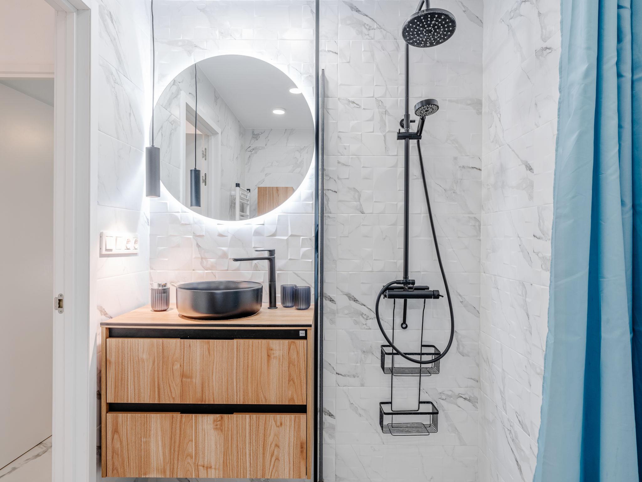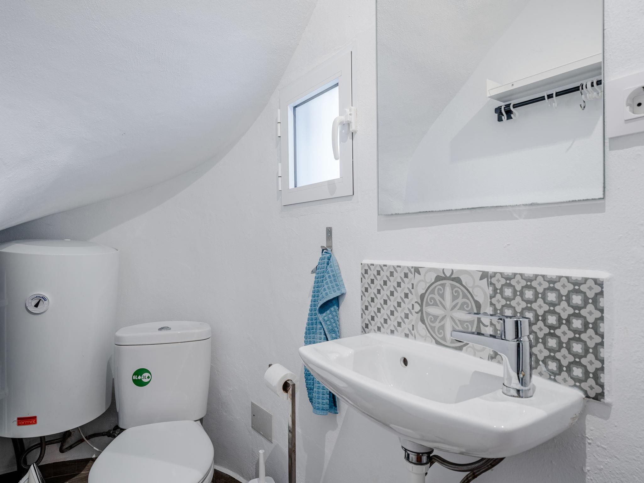 "Residencia La Perla", 4-room terraced house 80 m2 on 2 levels. Spacious and bright, very beautiful and stylish furnishings: living/dining room with satellite TV, air conditioning, fan and forced-air heating. Exit to the terrace. Open kitchen (oven, 4 ceramic glass hob hotplates, toaster, kettle, microwave, freezer, electric coffee machine). Sep. WC. Upper floor: 1 room with 1 french bed (150 cm, length 200 cm), satellite TV, air conditioning, fan and forced-air heating. 1 room with 1 double bed (2 x 90 cm, length 190 cm), air conditioning, fan and forced-air heating. 1 room with 1 x 2 bunk beds (80 cm, length 190 cm), fan. Shower/WC. 2 large terraces. Terrace furniture, sitting area. Facilities: washing machine, iron, hair dryer. Internet (WiFi, free). VT-501040-A // Reg. Nr.: ESFCTU00000304500031048000000000000000000VT-501040-A1