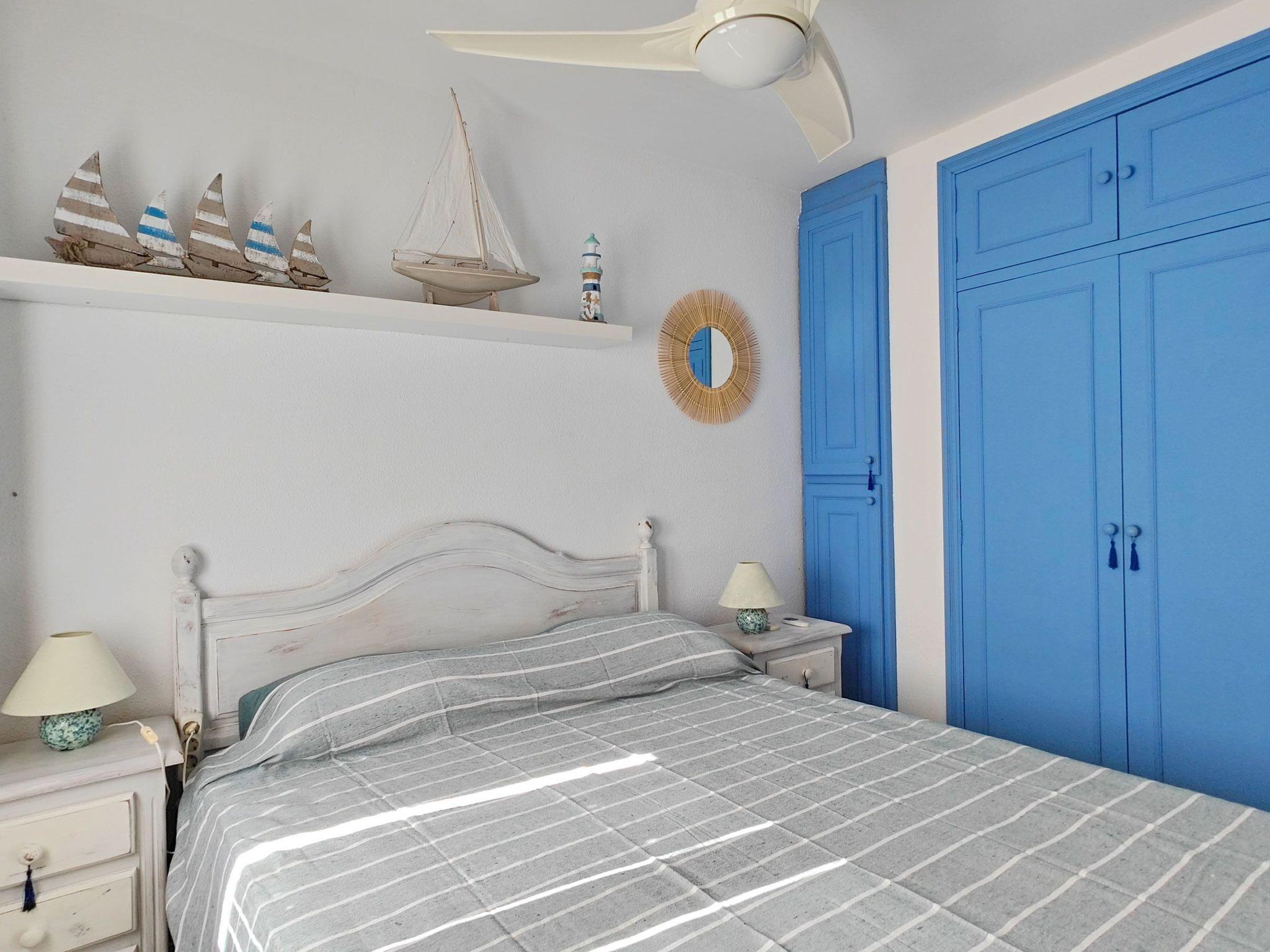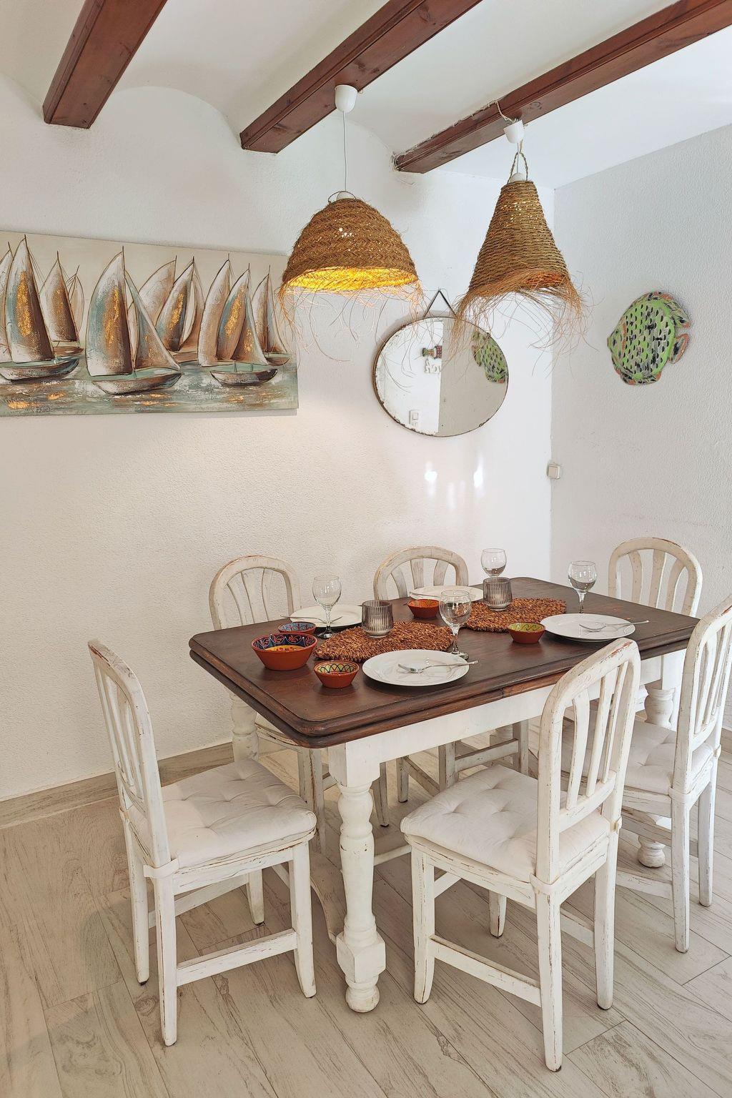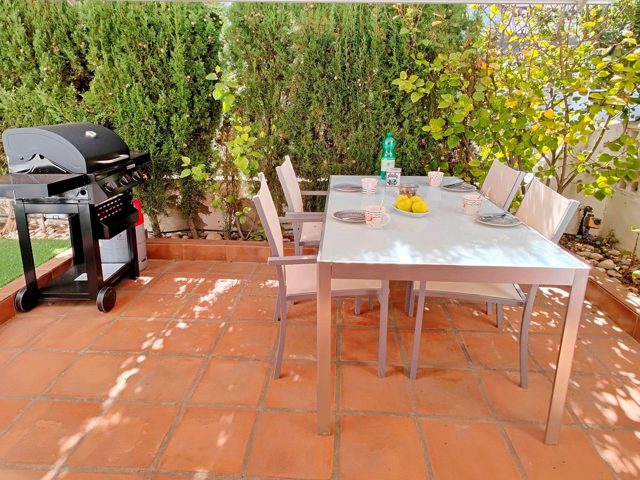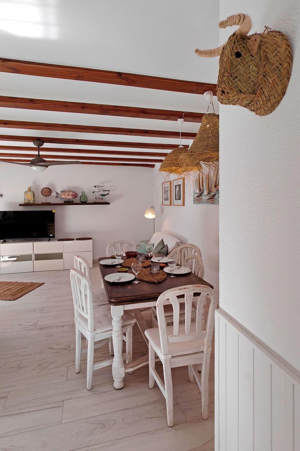 Casa Nautica is part of the Villa Riviera urbanisation, a private residence directly at the beach in Denia. It has 2 bedrooms on the upper floor as well as a sleeping alcove with 1 single bed (0.80x2.00), a small balcony and a stylish bathroom with shower on the upper floor. On the ground floor there is another shower bathroom, a spacious living room with open kitchen, as well as access to the terrace and the private garden. The furnishings and décor follow an Ibiza style, the house is bright and airy. Air conditioning in the bedrooms and the living area provide pleasant temperatures. The kitchen is well equipped with everything you need for holiday cooking. Outside, there is a spacious terrace with dining area and barbecue. A sunshade awning provides shade. The house is ideal for everyone who appreciates beach, pool and a quiet, relaxed environment during their holiday.