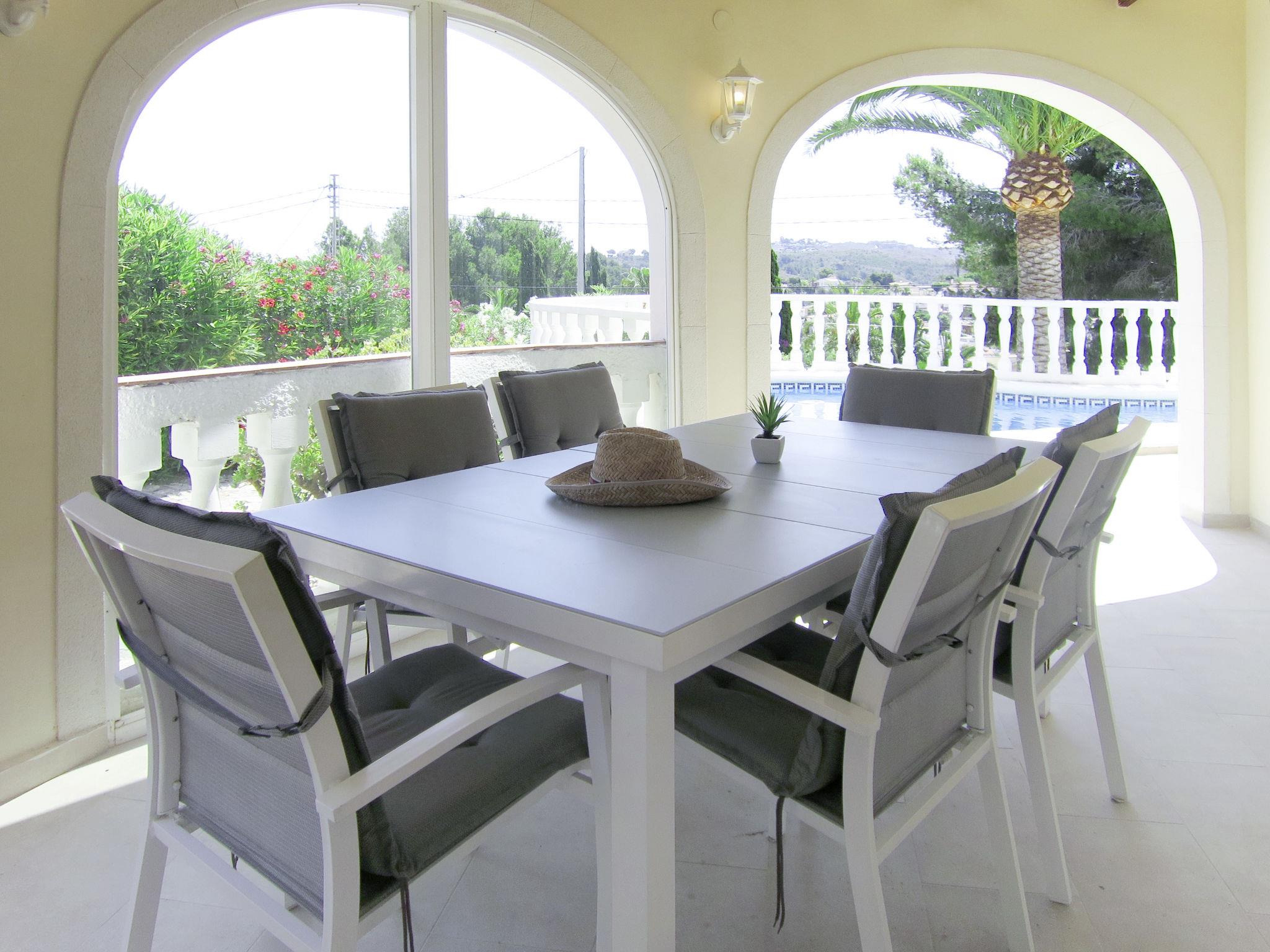 Single-family house "Romantica". In the district of Galeretes 2 km from the centre of Denia, 100 km from the centre of Alicante, 100 km from the centre of Valencia, 2 km from the sea. Private: property 850 m2 (fenced), terraced garden with lawn and wildlife garden, swimming pool kidney shaped (8 x 4 m, depth 180 cm, seasonal availability: 01.Jan. - 31.Dec.). Parking on the premises. Carport. Restaurant 150 m, bus stop 2.7 km, railway station 3.6 km, sandy beach 2 km. Tennis 100 m.