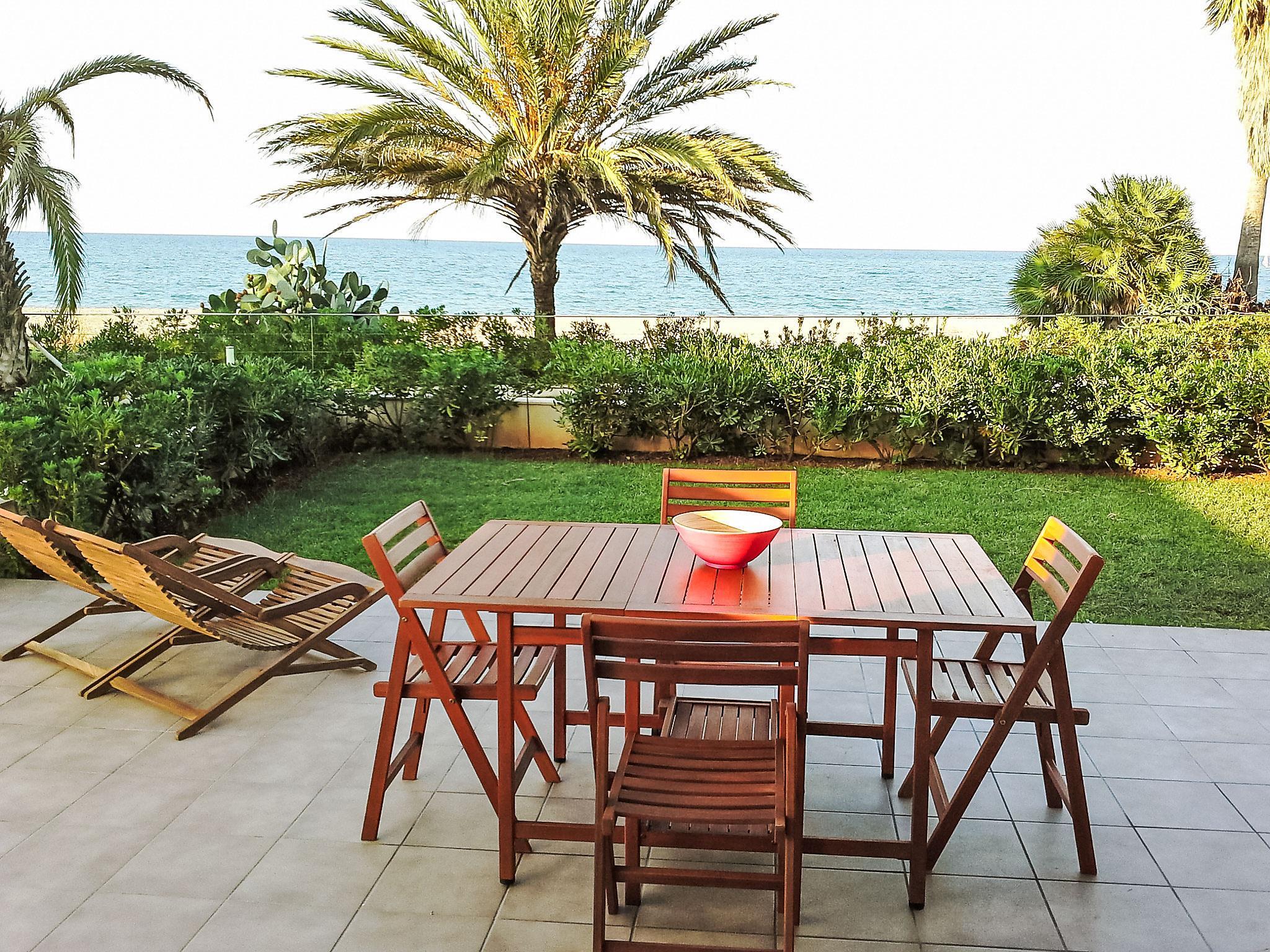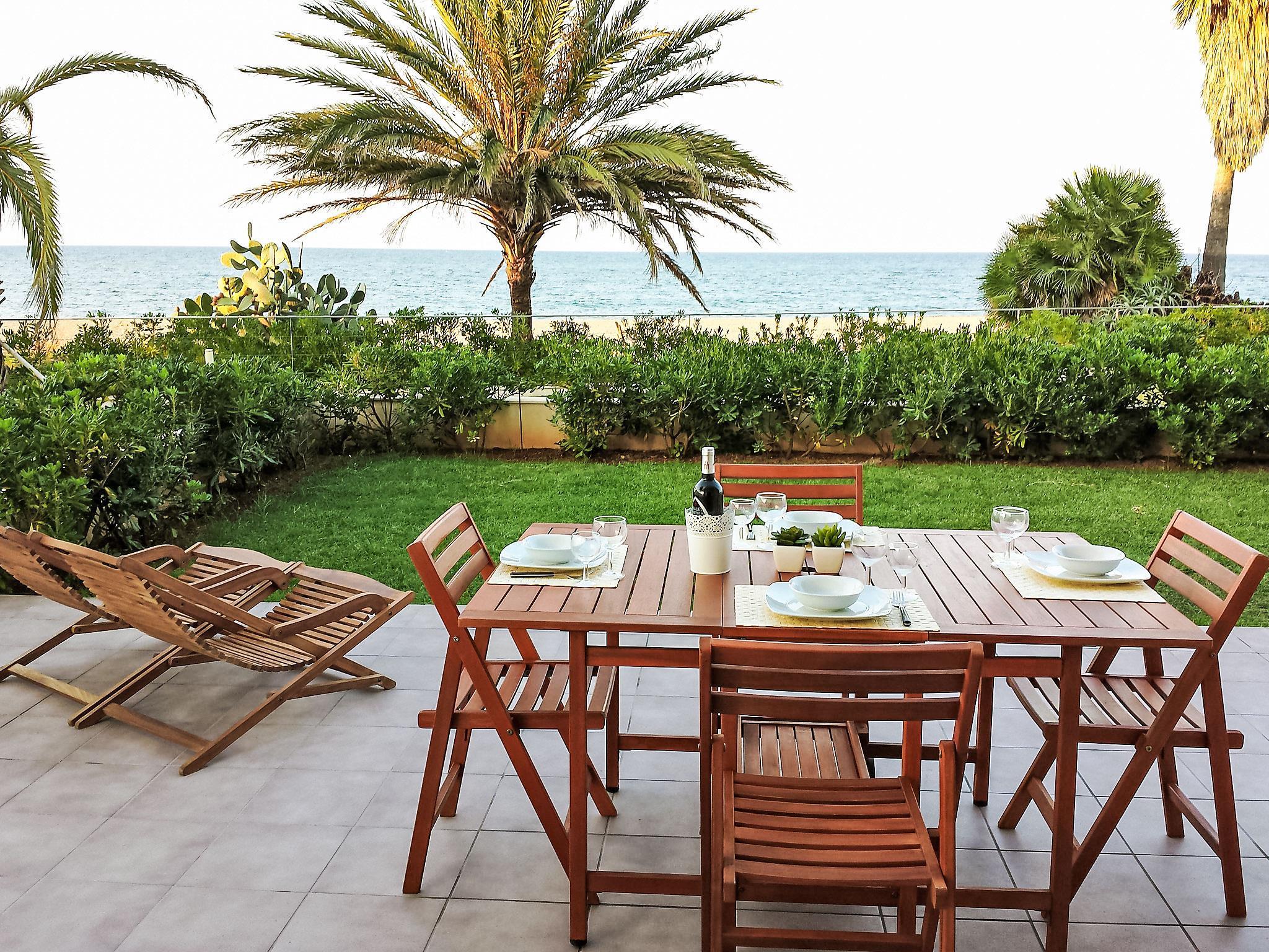 "Marenia", 3-room apartment 60 m2, on the ground floor. Comfortable and modern furnishings: living/dining room with digital TV and flat screen. Exit to the garden, to the terrace, to the swimming pool. 1 room with 1 french bed (160 cm, length 200 cm). Exit to the terrace, to the swimming pool. 1 room with 2 beds (90 cm, length 200 cm). Kitchen (oven, dishwasher, 3 ceramic glass hob hotplates, toaster, kettle, microwave, freezer, electric coffee machine). Bath/WC. Air-conditioning, forced-air heating. Large terrace partly roofed. Terrace furniture. Very beautiful view of the sea, the swimming pool and the garden. Facilities: washing machine, iron, children's high chair, baby cot, hair dryer. Internet (WiFi, free). Garage space n 20. Please note: non-smokers only. TV only ES. AT-437651-A // Reg. Nr.: ESFCTU00000304500100630600000000000000000AT-437651-A8