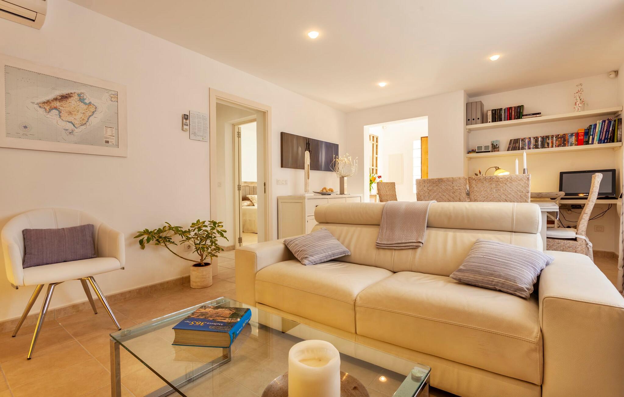 Centralt beliggende, en et-etagers bygning og smagfuldt designet: Dette er villaen "Del Mar 37" i Colònia de Sant Pere i den østlige del af Mallorca. Huset ligger på en typisk villavej i udkanten af den rolige by - så I føler jer ikke ensom på grund af jeres direkte naboer, men takket være privatlivsvægge behøver I heller ikke give afkald på privatlivets fred. Bag det velholdte hus opdager I ikke kun Middelhavet i umiddelbar nærhed, men også et smukt udendørsområde med masser af indbydende siddepladser. For eksempel kan I lige ved siden af huset sidde ved et stort spisebord på den overdækkede terrasse eller slappe af lige ved siden af under stilfuld solafskærmning på de komfortable loungemøbler. Fra en tagterrasse over har I en smuk delvis udsigt over havet. Fra stueplan fører en lille trappe op til endnu en smuk brolagt terrasse, indrammet af en hæk, en mur og et imponerende træ: det ideelle sted for en lur på en af liggestolene eller en kølig drink og en god bog. Villaens indre kan opsummeres med få ord: lyst, sommerligt, venligt, moderne – og stilfuldt. Alt passer perfekt sammen, farverne spænder fra frisk hvid til romantiske cremefarver til naturlige jordfarver. Alle værelser er i ét plan - især hvis I rejser med børn, vil I sætte pris på manglen på trapper i opholdsområdet. Der er dog en lille trappe med gelænder – men det vil jeres lille helt sikkert kunne lide. Et af de tre soveværelser med aircondition er udstyret med en stor køjeseng. Den nederste seng er endda stor nok til to personer, hvis børnene har brug for, at I bliver der, indtil de falder i søvn. De to andre soveværelser har mindst ligeså smuk indretning. Udover komfortable dobbeltsenge er der også store garderobeskabe til jeres feriegarderobe. Det åbne spise- og opholdsområde har også en lædersofa, en pejs og et stort spisebord med smukke kurvestole. Køkkenet er udstyret med hårde hvidevarer af høj kvalitet og er særligt imponerende med et vindue til terrassen, hvorfra der er udsigt til det omkringliggende landskab. To smarte badeværelser, hver med brusere fra gulv til loft, fuldender boligen. Uanset om I har lyst til afslappende gåture eller udfordrende vandreture gennem naturen på den østlige del af øen, altid på baggrund af de imponerende kystbjerge: jeres villa er det perfekte udgangspunkt! Men bebyggelsen Colònia de Sant Pere er også bestemt værd at opdage. Colònia de Sant Pere er et af de mere rolige feriesteder ved Alcúdia-bugten. Her blev der aldrig bygget højhuse, men havnen er bevaret, hvor man i dag hovedsageligt kan beundre fancy lystbåde, selvom nogle få traditionelle fiskerbåde stadig ligger der. Under en strandpromenade, kun 700 m fra jeres villa, finder I også den kunstigt byggede bystrand Platja de Colònia de Sant Pere. Det er beskyttet af bølgebrydere og byder på en god infrastruktur med brusere, cafeer, restauranter og butikker. I kan nemt nå den smukke by Artà med jeres lejebil via den hørbare vej - kun 13,5 km fra jeres villa. Artà er særligt imponerende på grund af sin historie. For eksempel er en gåtur op til det historiske kloster Santuari de Sant Salvador særligt værd. Fra de delvist overdækkede terrasseområder i den smarte villa "Del Mar 37", nyd en vidunderlig udsigt over de grønne bjerge i det fjerne og havet, der funkler i solen, kun få 100 m væk. Takket være den behagelige beliggenhed i den rolige bygd Colònia de Sant Pere på den østlige del af øen, kan I nå alt hvad I behøver til fods: supermarkedet samt restauranter, caféer, stranden og havet.