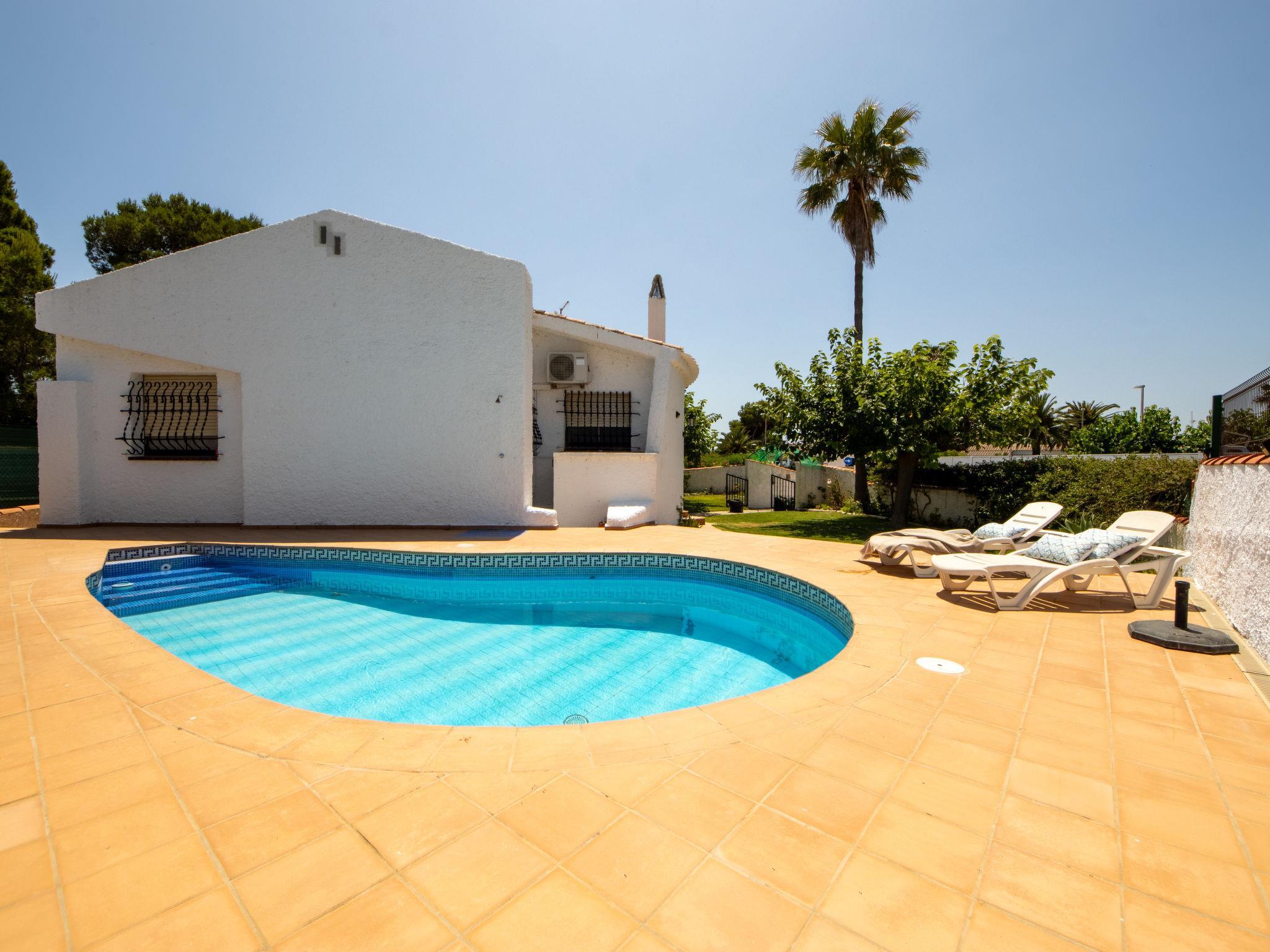 Riumar 10 km from Deltebre: Cosy, comfortable house "Ibicenca". In a quiet, sunny position, 250 m from the sea, 250 m from the beach. Private: property (fenced), garden with lawn, swimming pool kidney shaped (4 x 7 m, depth 160 cm, seasonal availability: 01.Jan. - 31.Dec.). Terrace, garden furniture, barbecue. In the house: WiFi, air conditioning, washing machine. Parking at the house. Shop 600 m, grocery, supermarket, restaurant, bar 300 m, bus stop "Riumar" 100 m, railway station "Aldea- Amposta" 25 km, sandy beach "Riumar" 100 m. Sports harbour 1 km. Nearby attractions: Parque natural Delta del Ebro 2 km, Tortosa 35 km, Playa el Trabucador 29 km, Barcelona 190 km, Port Aventura 70 km. Hiking paths: Parque natural Puerto Tortosa Beseit 52 km, GR 92 15 km. Please note: car recommended. Suitable for families. Groups of teenagers on request only.