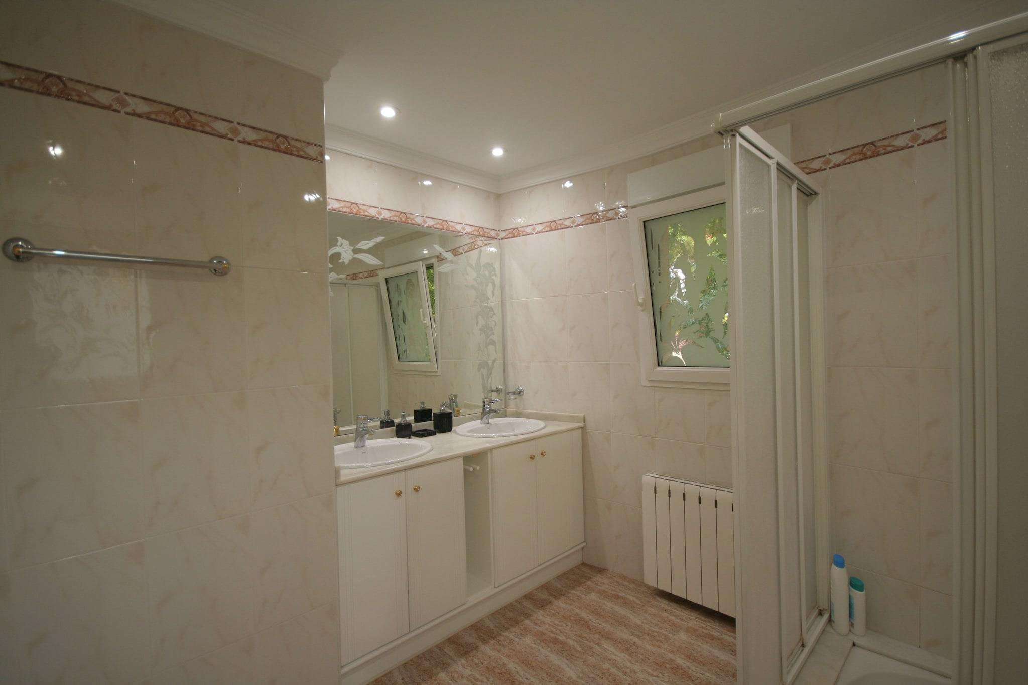 Stueetage: (entre, åbent køkken(ovn, mikrobølgeovn, opvaskemaskine , køle-fryseskab), stue / spisestue(Fjernsyn, DVD-afspiller, stereoanlæg), soveværelse(køjeseng), badeværelse(Bubble bath, bruser, 2x håndvask, bidet), toilet, bryggers(tørretumbler, vaskemaskine)) På 1. etage: (soveværelse(dobbeltseng, balkon), soveværelse(dobbeltseng, balkon), badeværelse(bruser, 2x håndvask, toilet)) bruser(udendørs), varme, klimaanlæg, terrasse(overdækket), have(privat), havemøbler, grill, swimmingpool(privat, 10 x 5 m.), bordtennisbord, cykler til rådighed, barneseng
