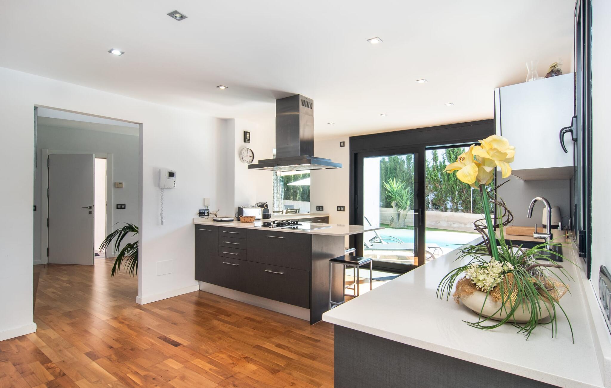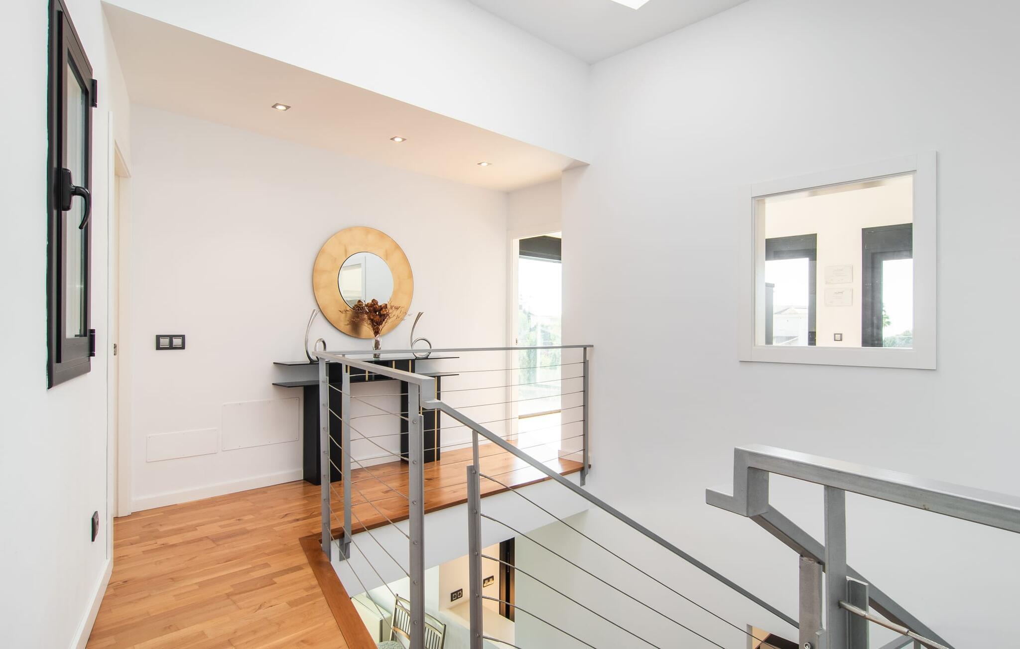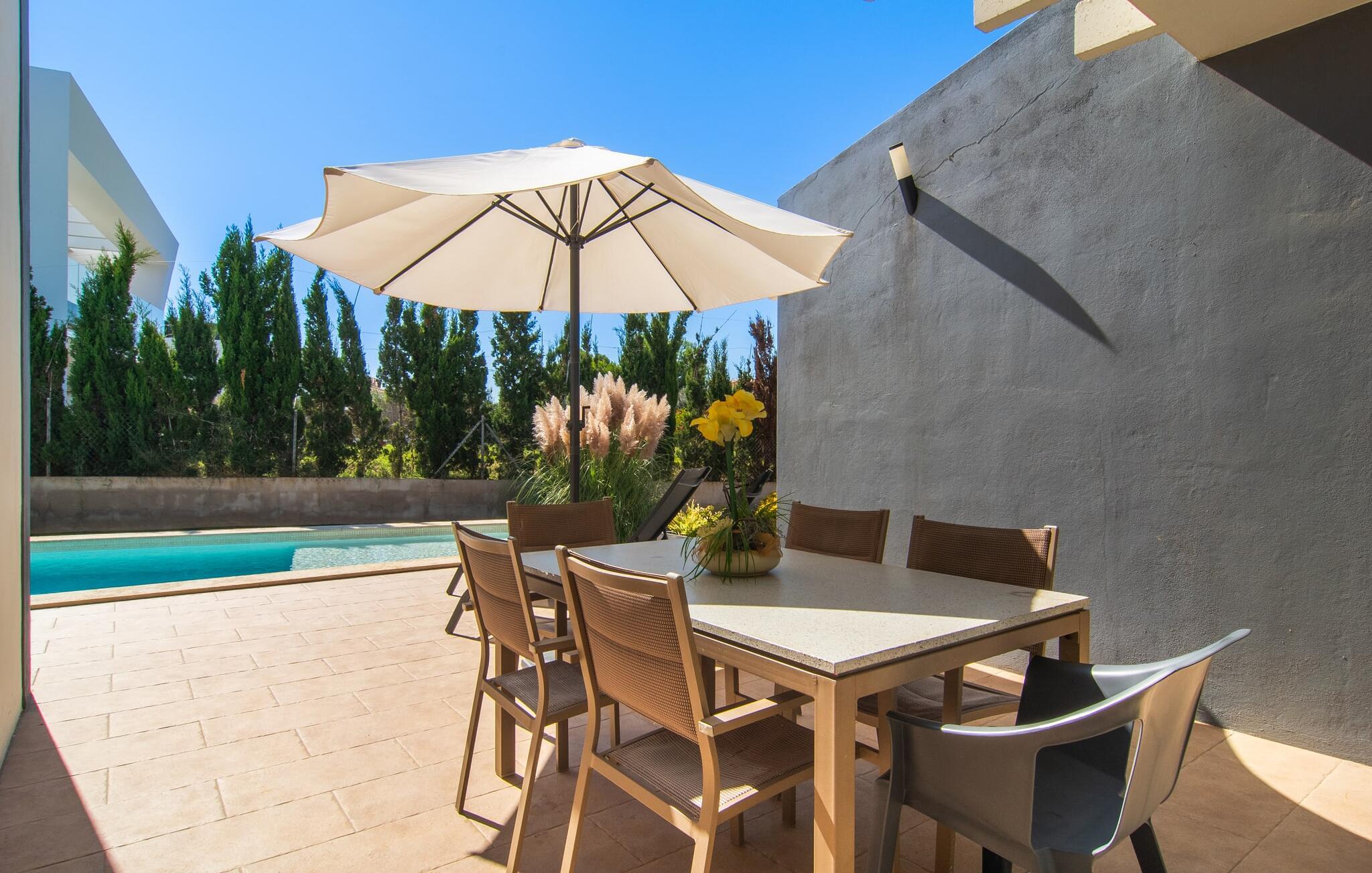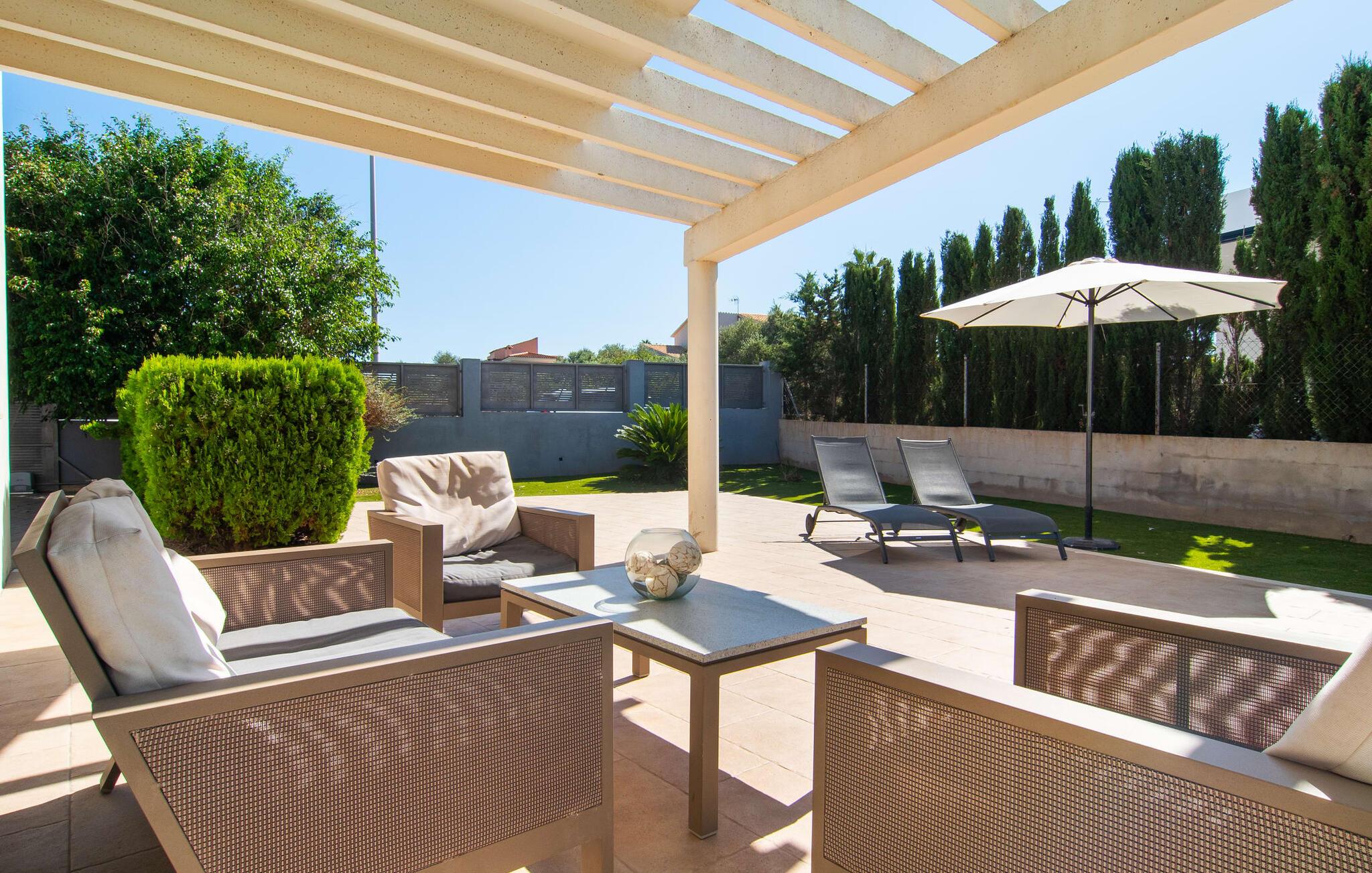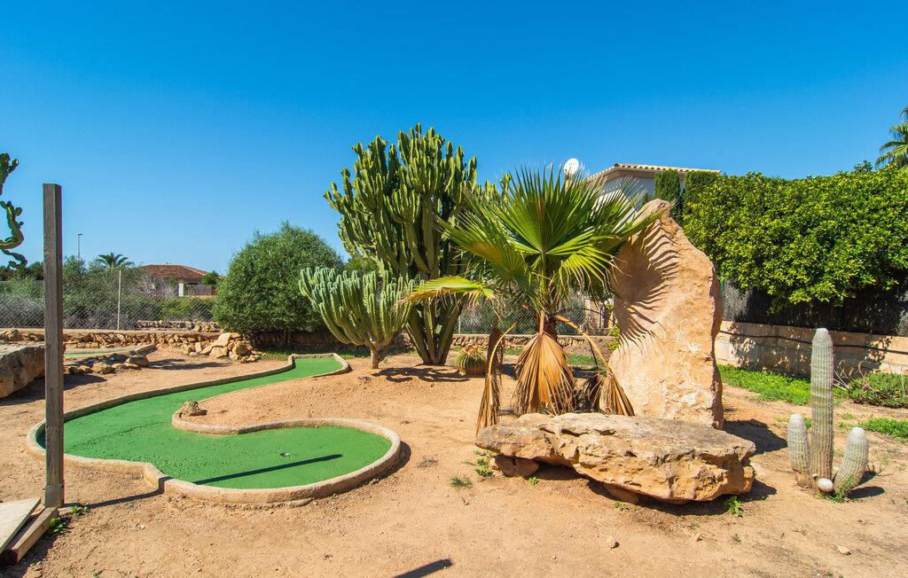 Den moderne, fremragende udstyrede villa "Dori" på Mallorcas sydkyst opfylder uden tvivl de højeste krav. Dets elegant designede udendørsområde byder på alt, hvad I kan ønske jer til en afslappende ferie ved Middelhavet: en klorfri, lavvandet pool, forskellige terrasser til solbadning, komfortable siddepladser og liggeområder i skyggen. Det har også sin egen lille minigolfbane. En muret grill til fest til langt ud på natten og en udendørs bruser er også en del af inventaret. Kan I forestille jer de ensomme sommernætter, I kan nyde her med et godt glas vin ved den oplyste pool? Takket være store vinduesfronter er hele boligarealet i to etager oversvømmet med masser af naturligt dagslys. I stueetagen har I direkte adgang til poolterrassen fra køkkenet, den komfortabelt indrettede stue og de to soveværelser. Høj kvalitet, gennemtænkt og meget komplet indretning sikrer en høj boligkomfort. Den øverste stueplan er også smagfuldt designet og rummer master soveværelset med badeværelse en suite og udgang til egen balkon. Derudover er der et stort kontor med smuk havudsigt. Kan I lide at arbejde hjemmefra eller dyrke yoga her? Både opholdsstuen og soveværelserne er udstyret med aircondition og kan komfortabelt mørklægges under siestatiden. Villaen er beliggende i det velholdte, rolige boligområde Badia Gran, 23 km sydøst for øens hovedstad Palma de Mallorca. Kystbebyggelsen har forskellige supermarkeder og restauranter. De smukke naturlige strande Sa Rápita og Es Trenc ligger kun 30 minutter væk i bil.