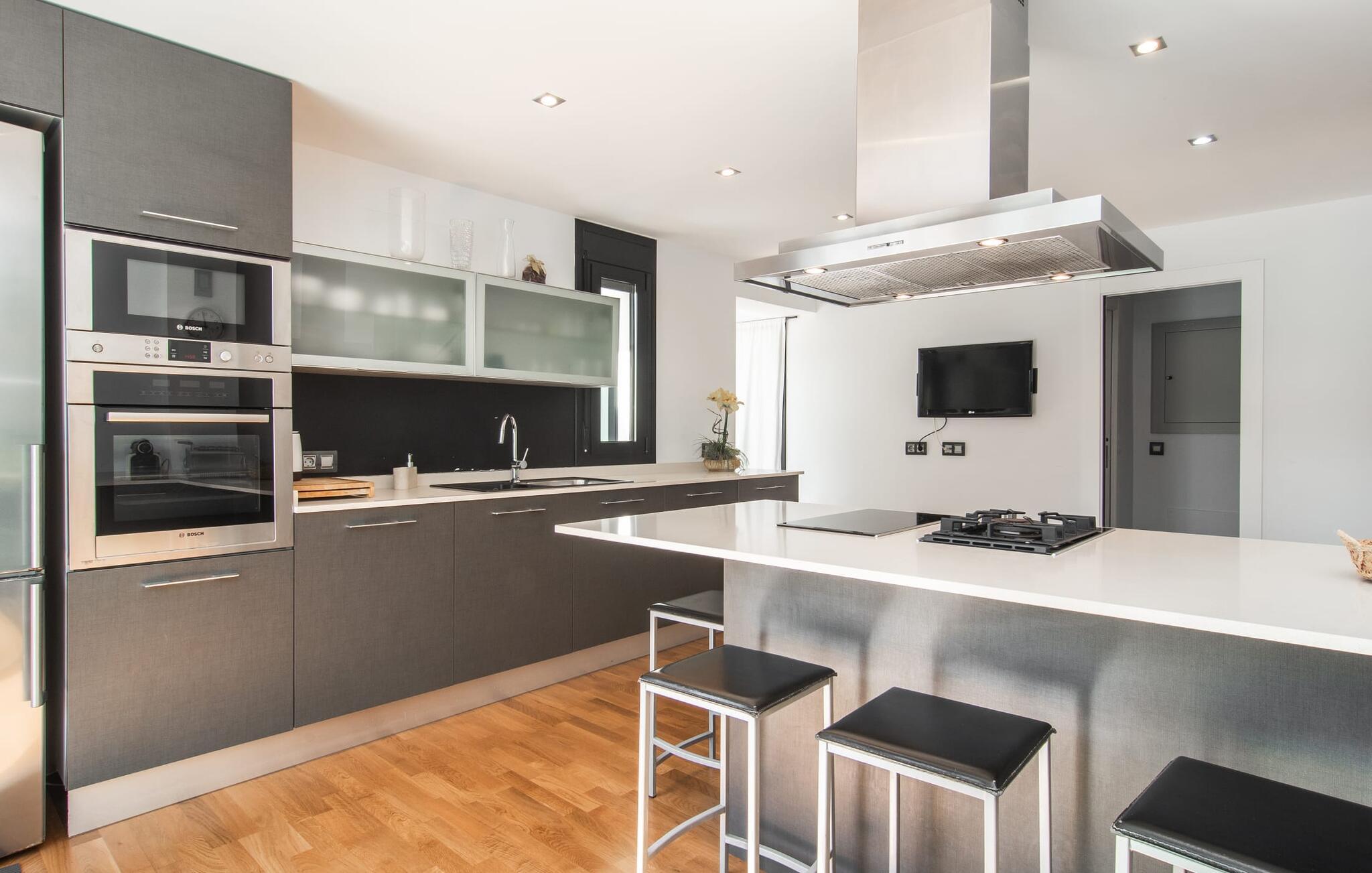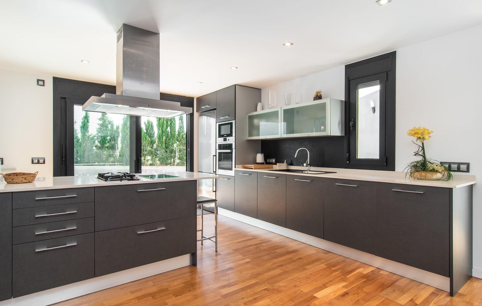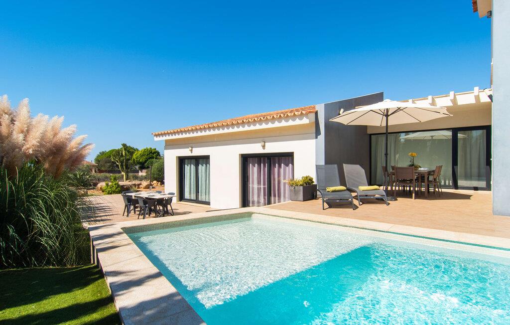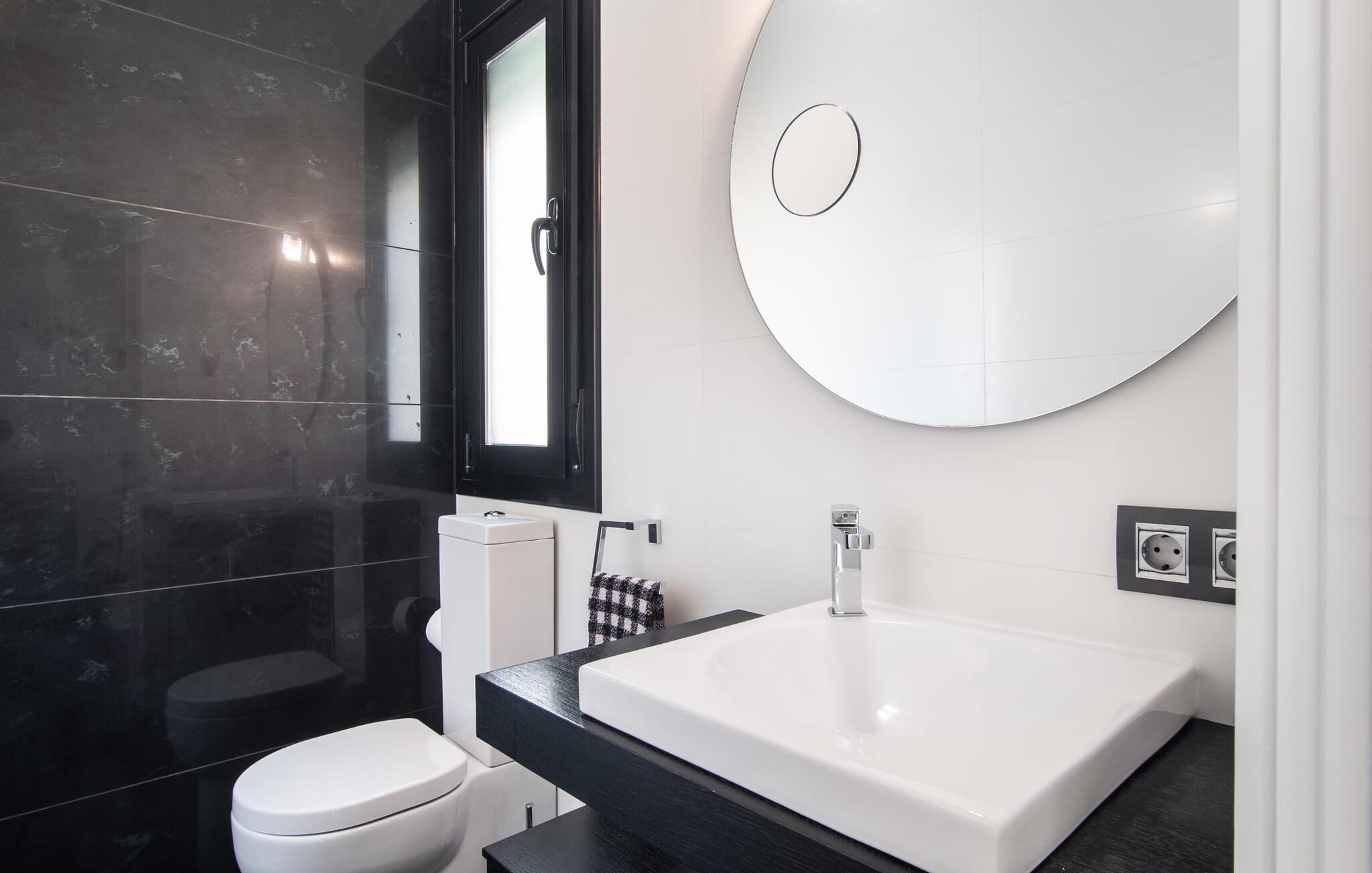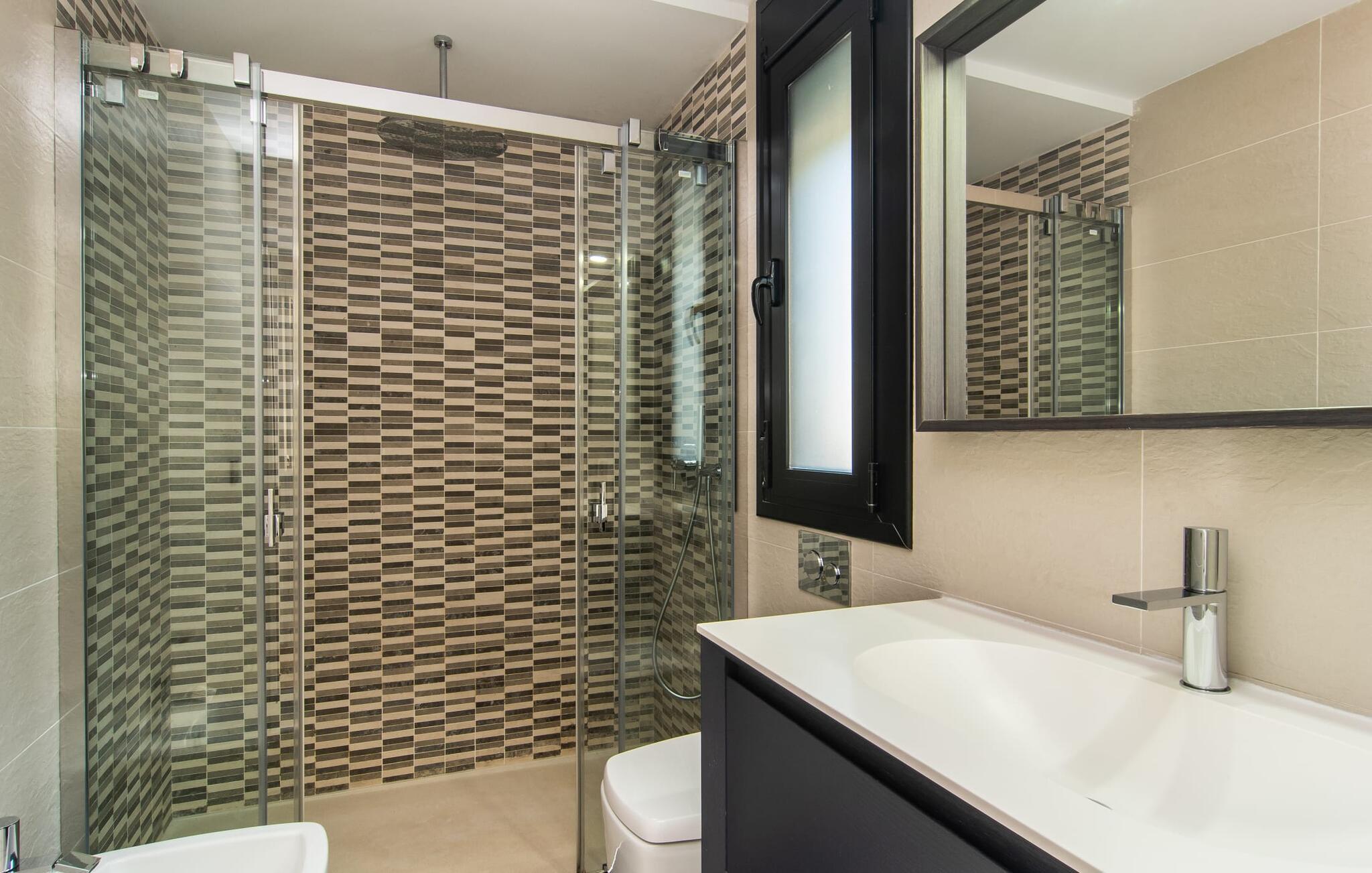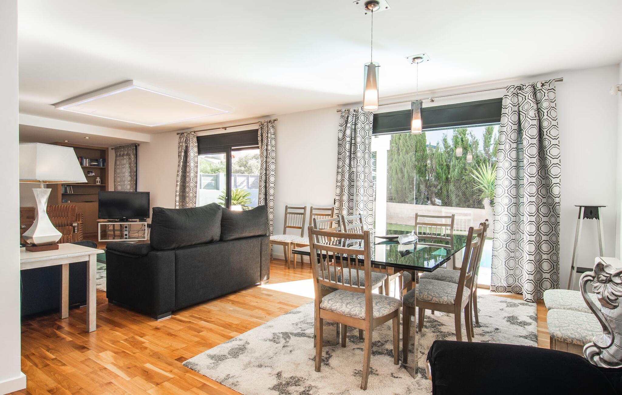 Den moderne, fremragende udstyrede villa "Dori" på Mallorcas sydkyst opfylder uden tvivl de højeste krav. Dets elegant designede udendørsområde byder på alt, hvad I kan ønske jer til en afslappende ferie ved Middelhavet: en klorfri, lavvandet pool, forskellige terrasser til solbadning, komfortable siddepladser og liggeområder i skyggen. Det har også sin egen lille minigolfbane. En muret grill til fest til langt ud på natten og en udendørs bruser er også en del af inventaret. Kan I forestille jer de ensomme sommernætter, I kan nyde her med et godt glas vin ved den oplyste pool? Takket være store vinduesfronter er hele boligarealet i to etager oversvømmet med masser af naturligt dagslys. I stueetagen har I direkte adgang til poolterrassen fra køkkenet, den komfortabelt indrettede stue og de to soveværelser. Høj kvalitet, gennemtænkt og meget komplet indretning sikrer en høj boligkomfort. Den øverste stueplan er også smagfuldt designet og rummer master soveværelset med badeværelse en suite og udgang til egen balkon. Derudover er der et stort kontor med smuk havudsigt. Kan I lide at arbejde hjemmefra eller dyrke yoga her? Både opholdsstuen og soveværelserne er udstyret med aircondition og kan komfortabelt mørklægges under siestatiden. Villaen er beliggende i det velholdte, rolige boligområde Badia Gran, 23 km sydøst for øens hovedstad Palma de Mallorca. Kystbebyggelsen har forskellige supermarkeder og restauranter. De smukke naturlige strande Sa Rápita og Es Trenc ligger kun 30 minutter væk i bil.