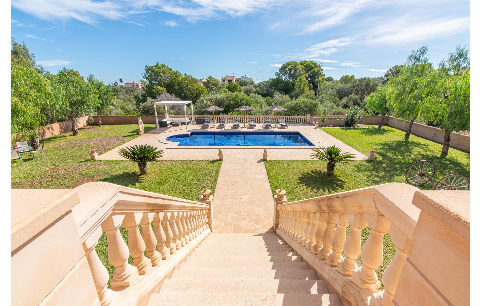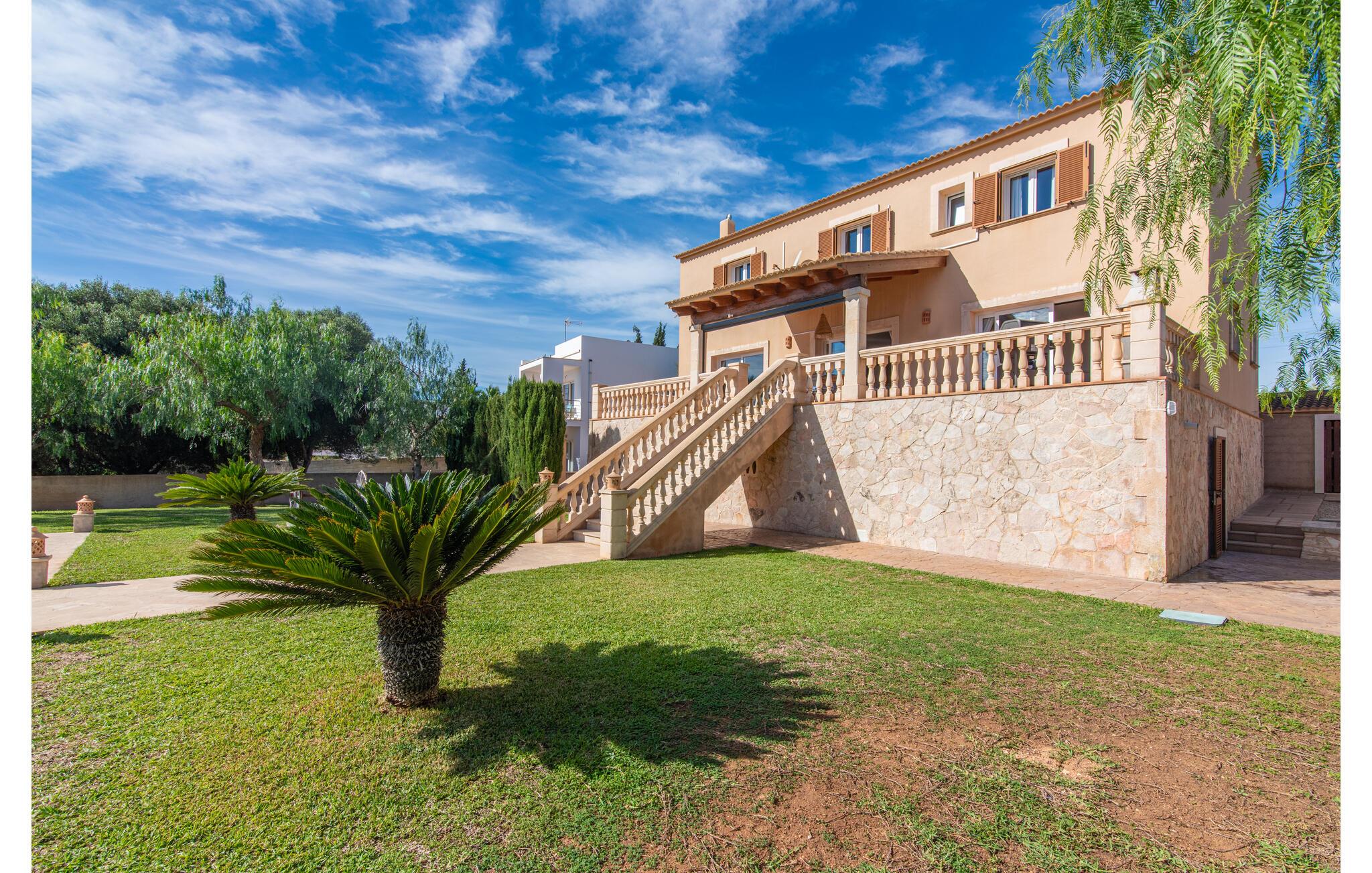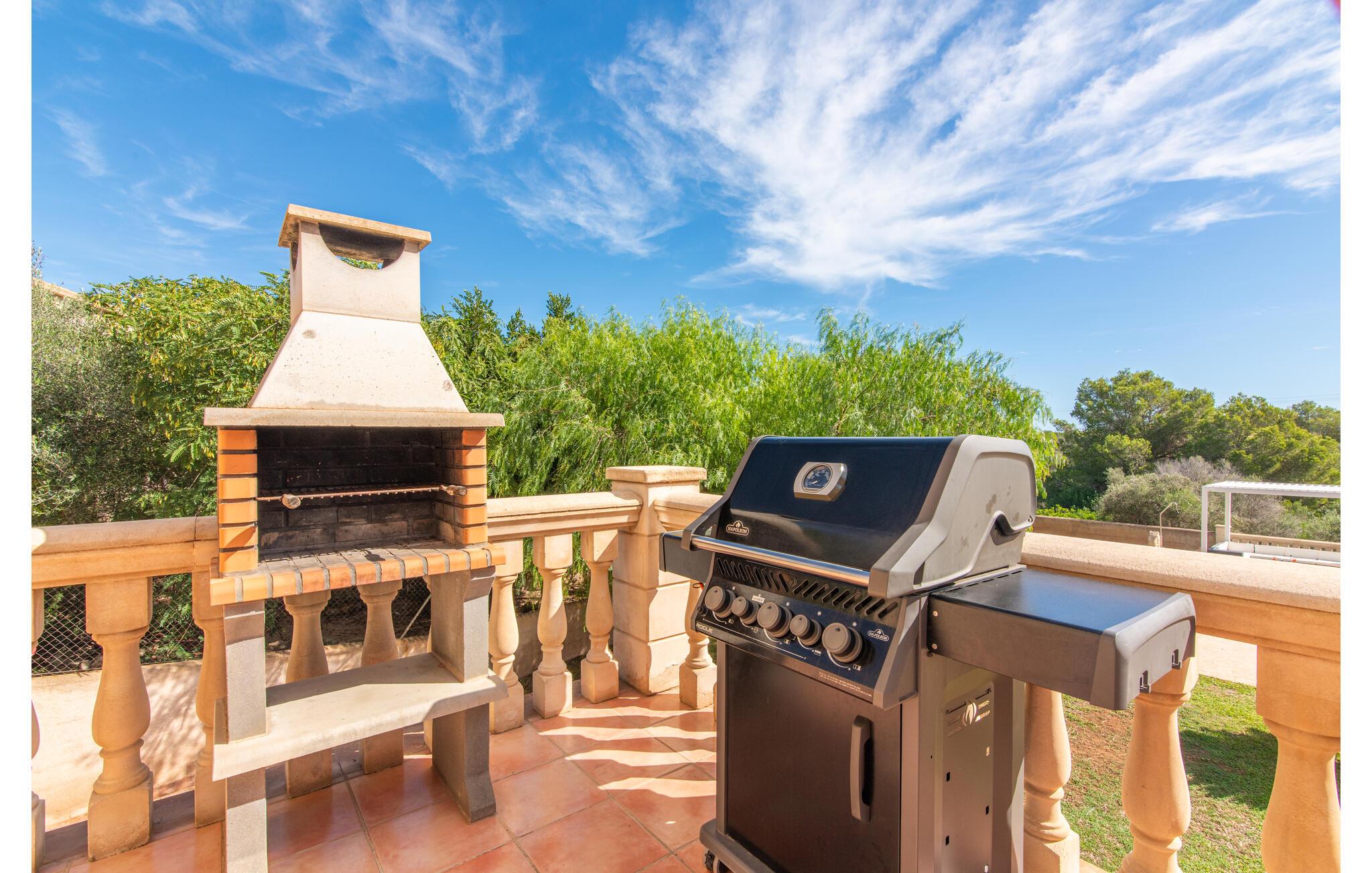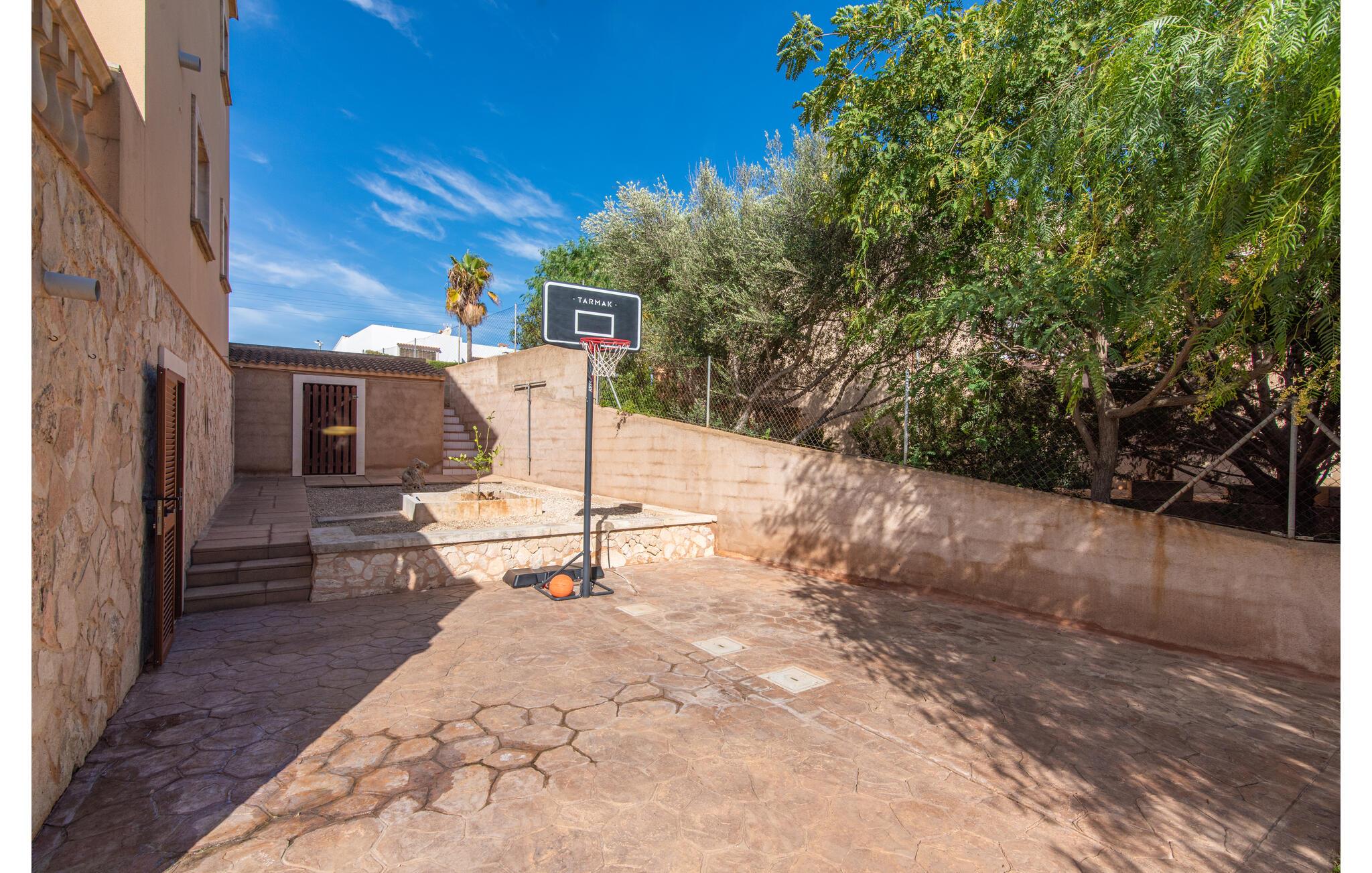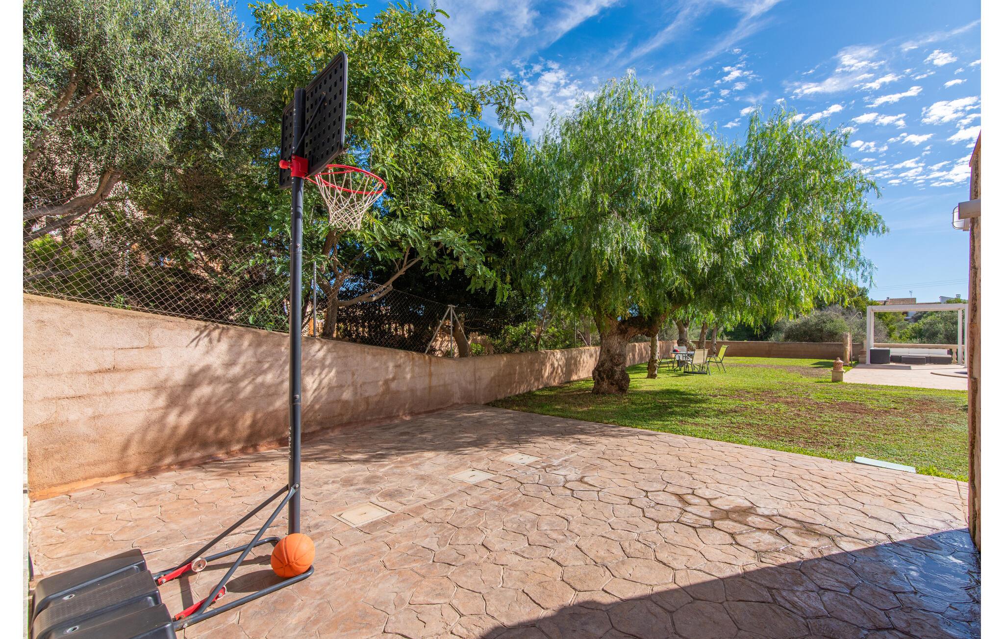 Den smukke "Dues Illes" ligger i udkanten af ??et boligområde. Fra det skønne feriehus kan I nå den særligt velholdte have via en trappe foran den overdækkede terrasse. Ud over græsplæner er der en stor bestand af træer, der giver naturlig skygge og en hyggelig atmosfære. Midtpunktet i komplekset er naturligvis den flisebelagte pool med liggestole, trendy halmparasoller og en hyggelig chill-out lounge. Et romantisk siddeområde under skyggefulde træer lægger op til at læse eller fungerer som et luftigt havekontor. Vil I være aktiv, kan I gøre det med bordtennis, vandpolo, basketball eller volleyball. Den store overdækkede terrasse med spisebord og to grillstationer - en murstensgrill med kul og en mobil gasgrill - byder på en vidunderlig udsigt til hyggelige måltider.