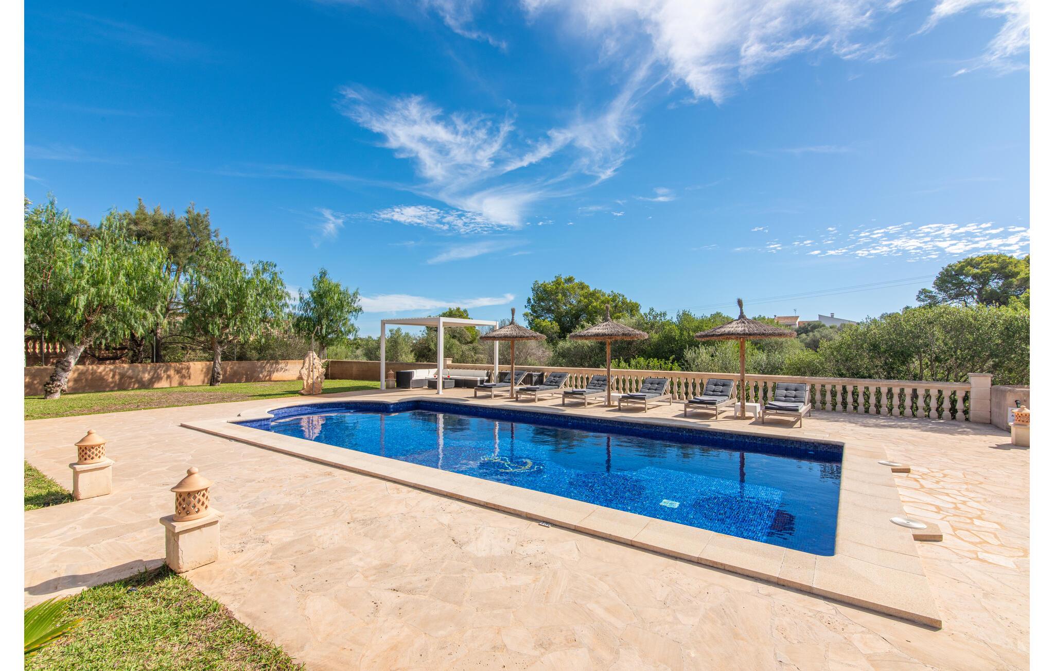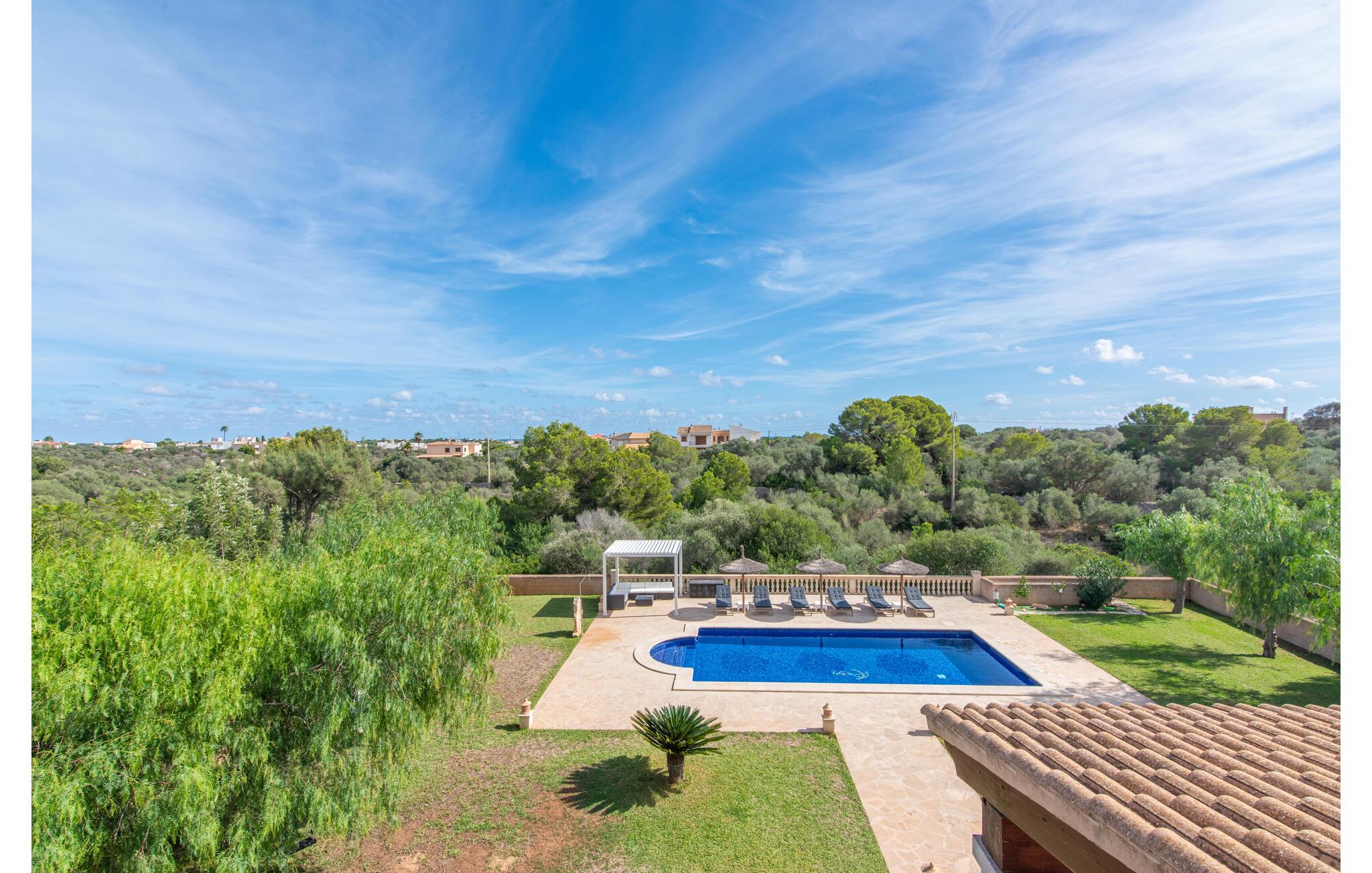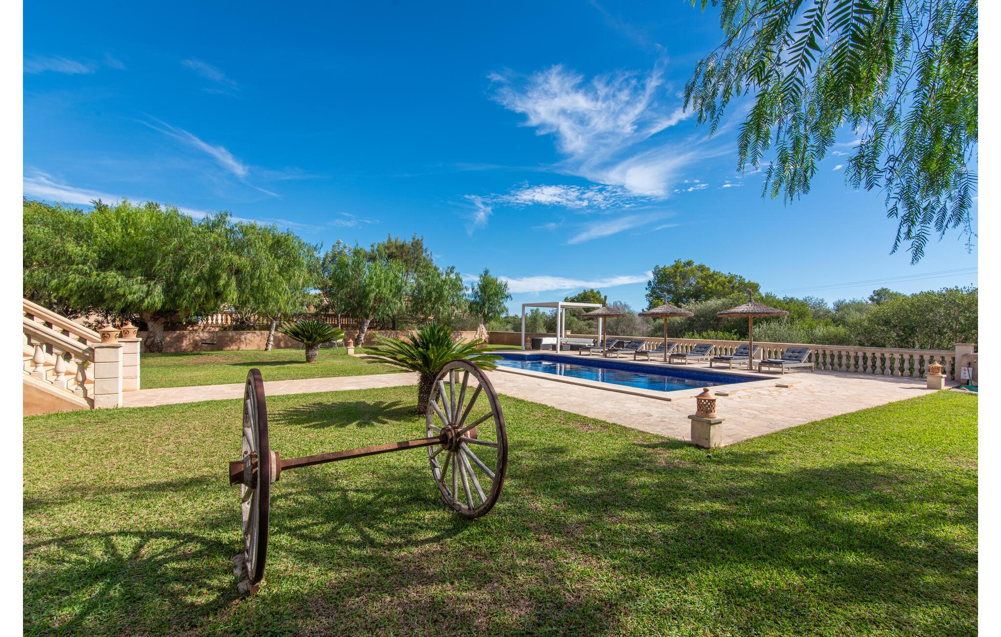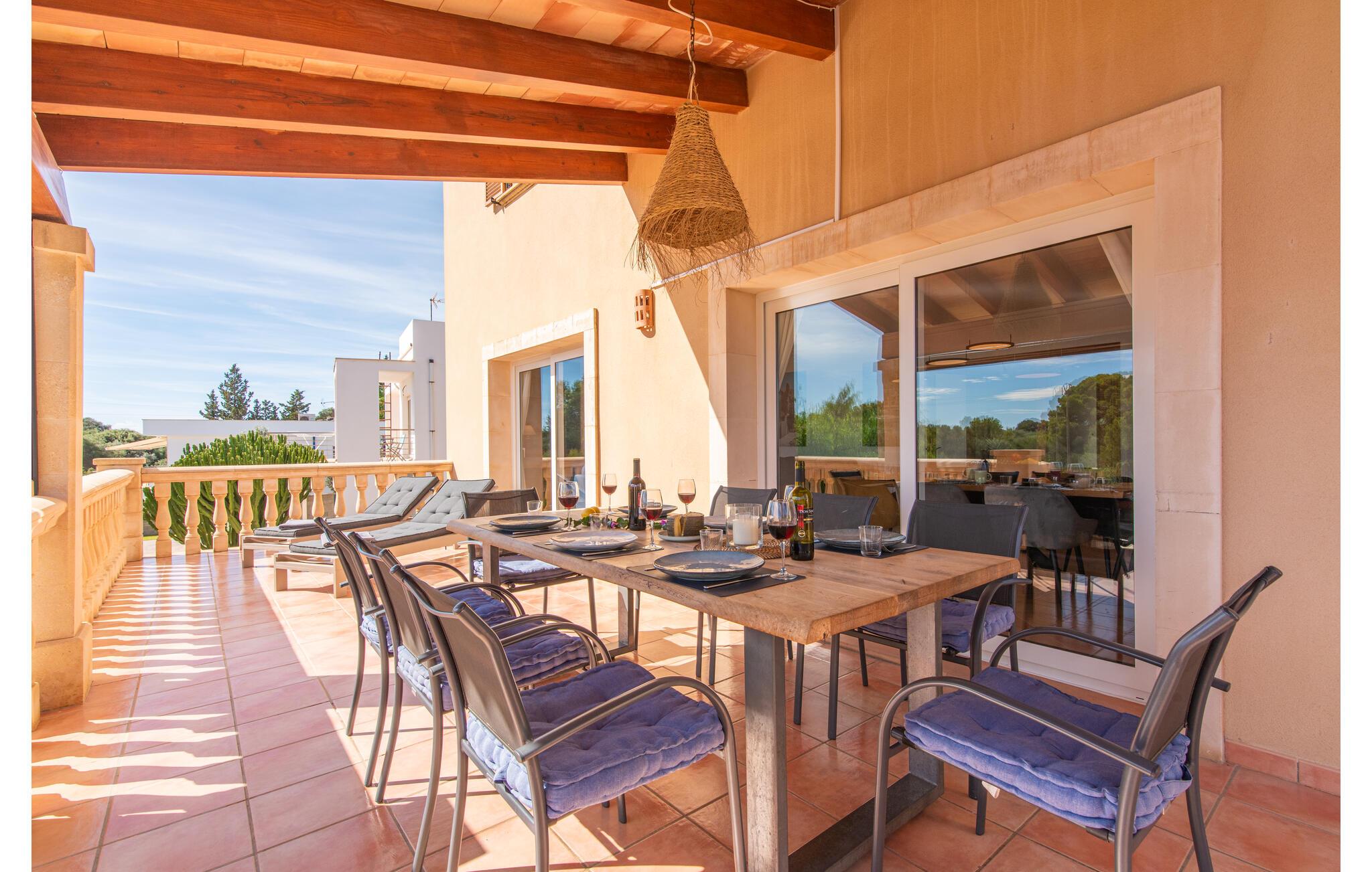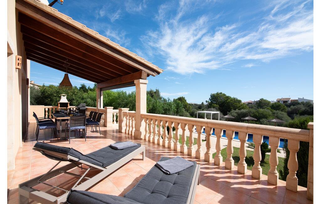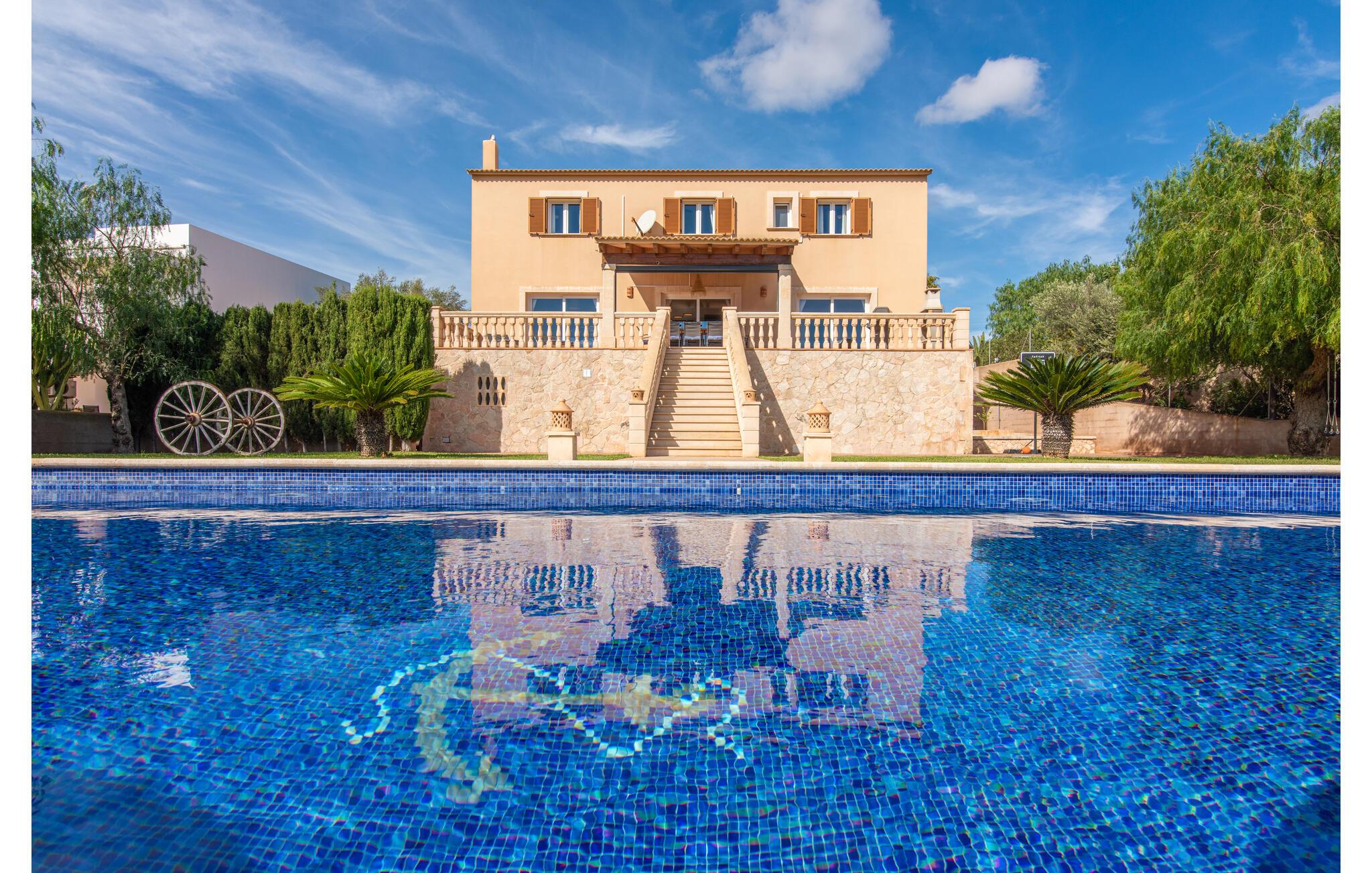 Den smukke "Dues Illes" ligger i udkanten af ??et boligområde. Fra det skønne feriehus kan I nå den særligt velholdte have via en trappe foran den overdækkede terrasse. Ud over græsplæner er der en stor bestand af træer, der giver naturlig skygge og en hyggelig atmosfære. Midtpunktet i komplekset er naturligvis den flisebelagte pool med liggestole, trendy halmparasoller og en hyggelig chill-out lounge. Et romantisk siddeområde under skyggefulde træer lægger op til at læse eller fungerer som et luftigt havekontor. Vil I være aktiv, kan I gøre det med bordtennis, vandpolo, basketball eller volleyball. Den store overdækkede terrasse med spisebord og to grillstationer - en murstensgrill med kul og en mobil gasgrill - byder på en vidunderlig udsigt til hyggelige måltider.