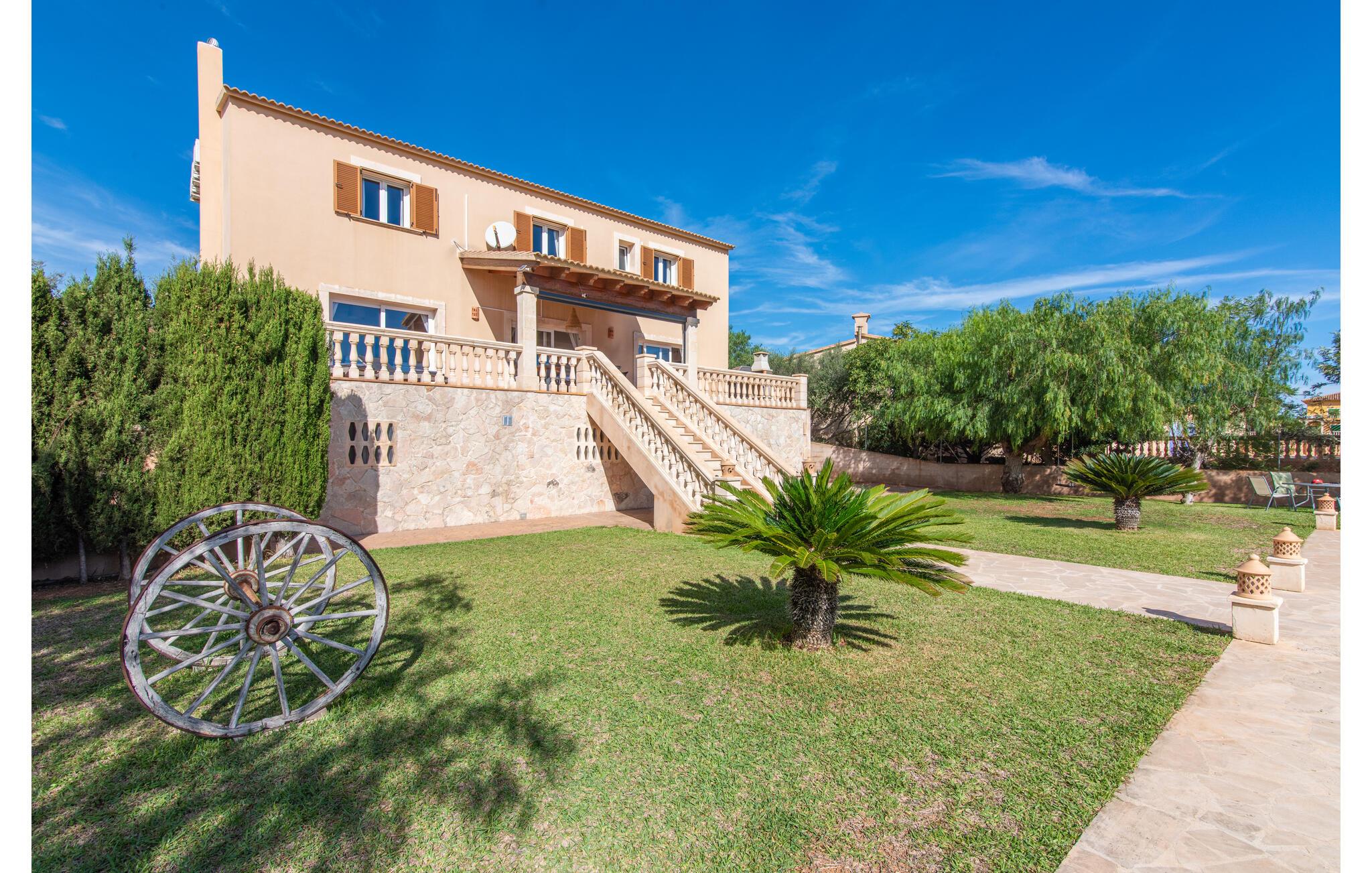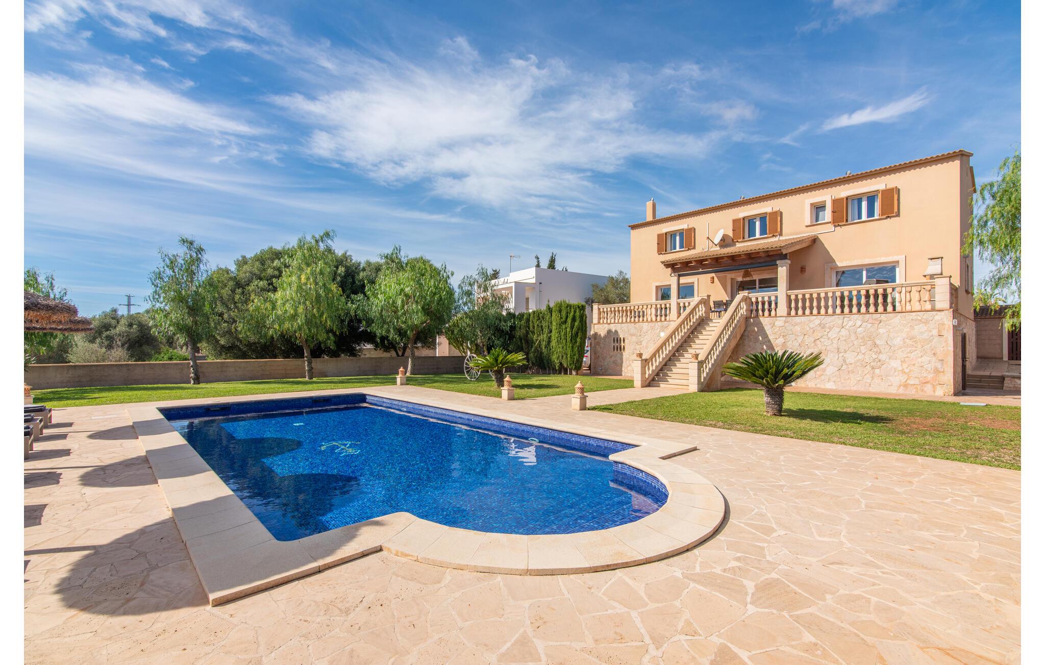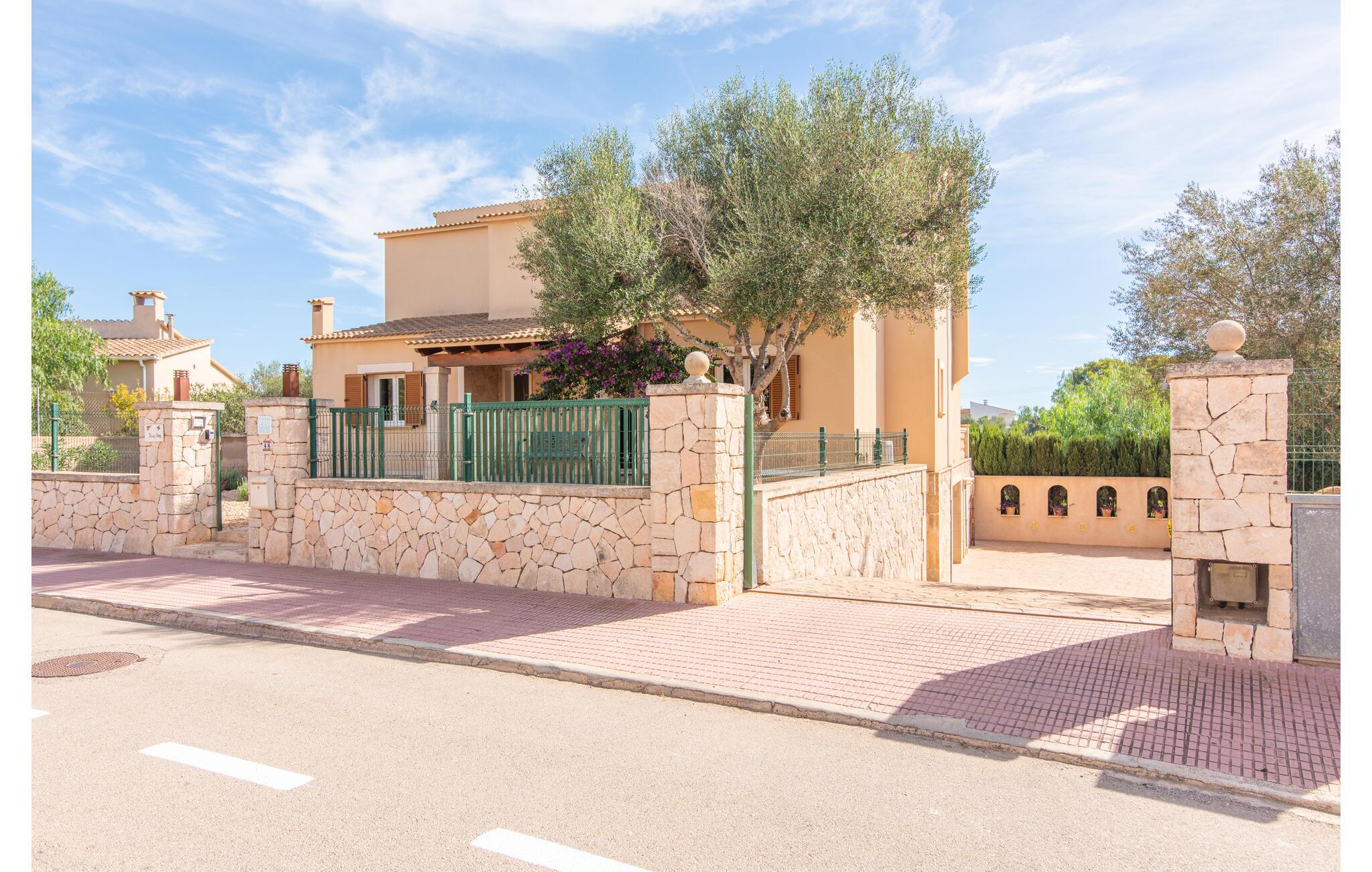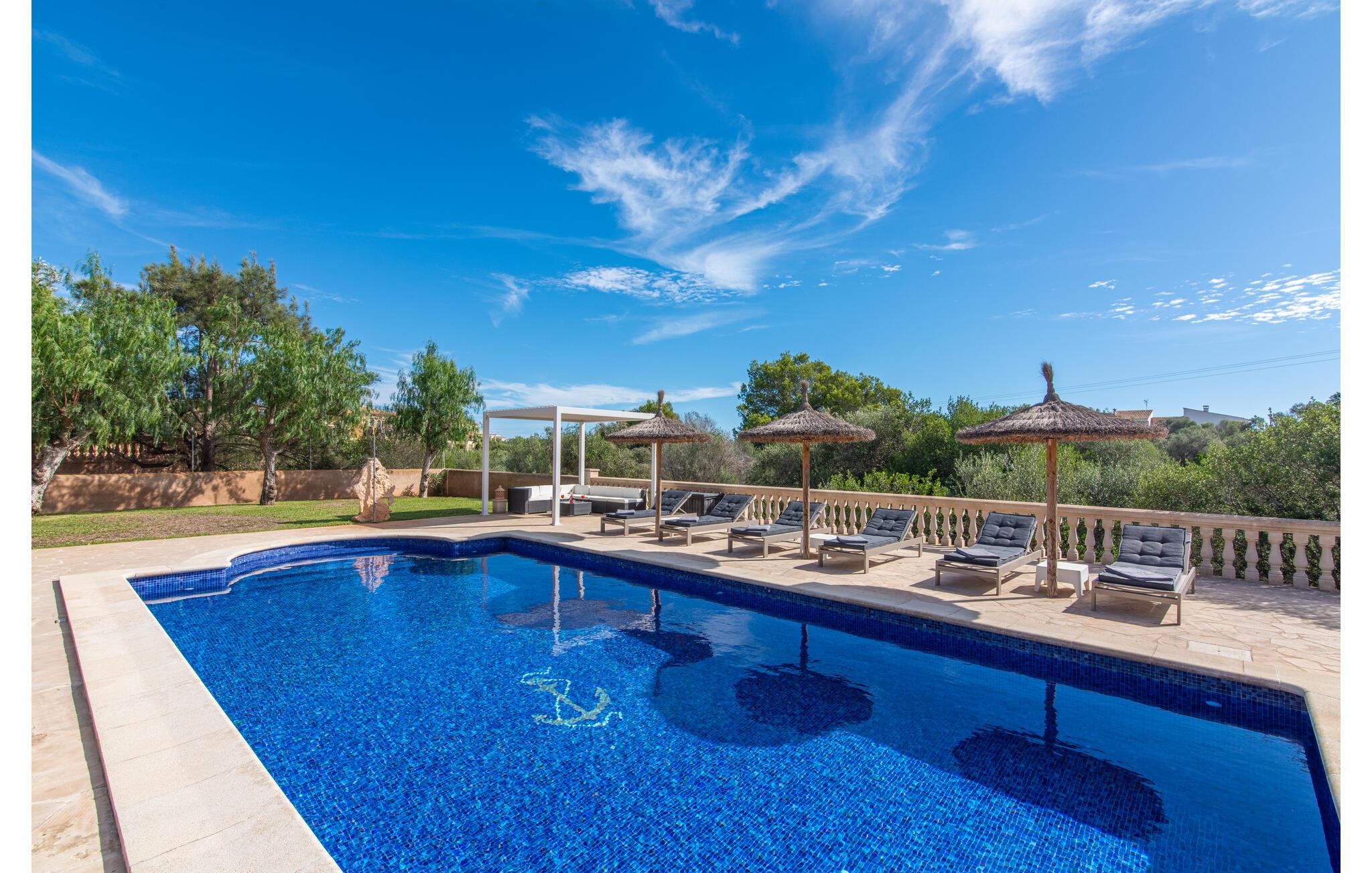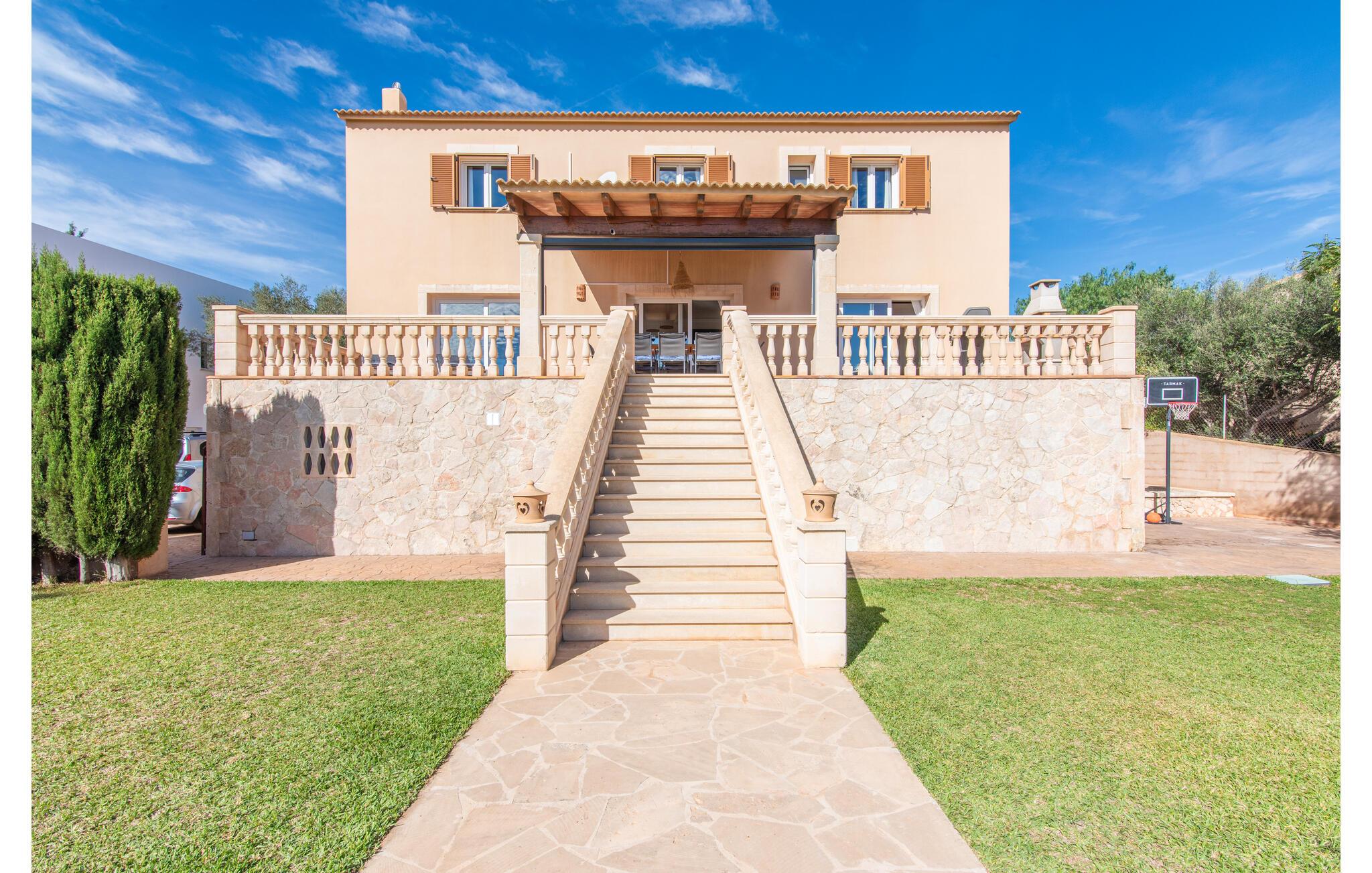 Den smukke "Dues Illes" ligger i udkanten af ??et boligområde. Fra det skønne feriehus kan I nå den særligt velholdte have via en trappe foran den overdækkede terrasse. Ud over græsplæner er der en stor bestand af træer, der giver naturlig skygge og en hyggelig atmosfære. Midtpunktet i komplekset er naturligvis den flisebelagte pool med liggestole, trendy halmparasoller og en hyggelig chill-out lounge. Et romantisk siddeområde under skyggefulde træer lægger op til at læse eller fungerer som et luftigt havekontor. Vil I være aktiv, kan I gøre det med bordtennis, vandpolo, basketball eller volleyball. Den store overdækkede terrasse med spisebord og to grillstationer - en murstensgrill med kul og en mobil gasgrill - byder på en vidunderlig udsigt til hyggelige måltider.