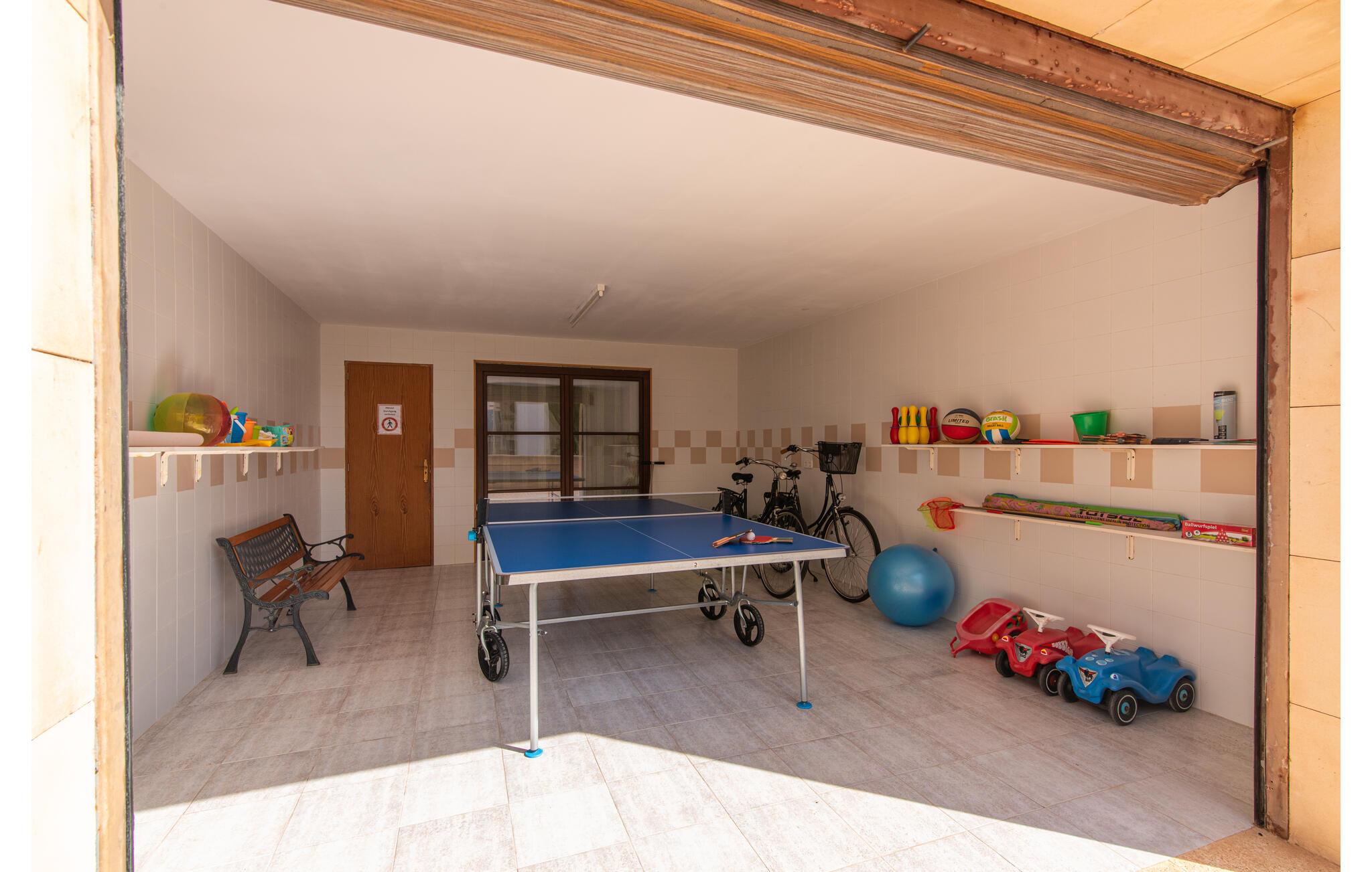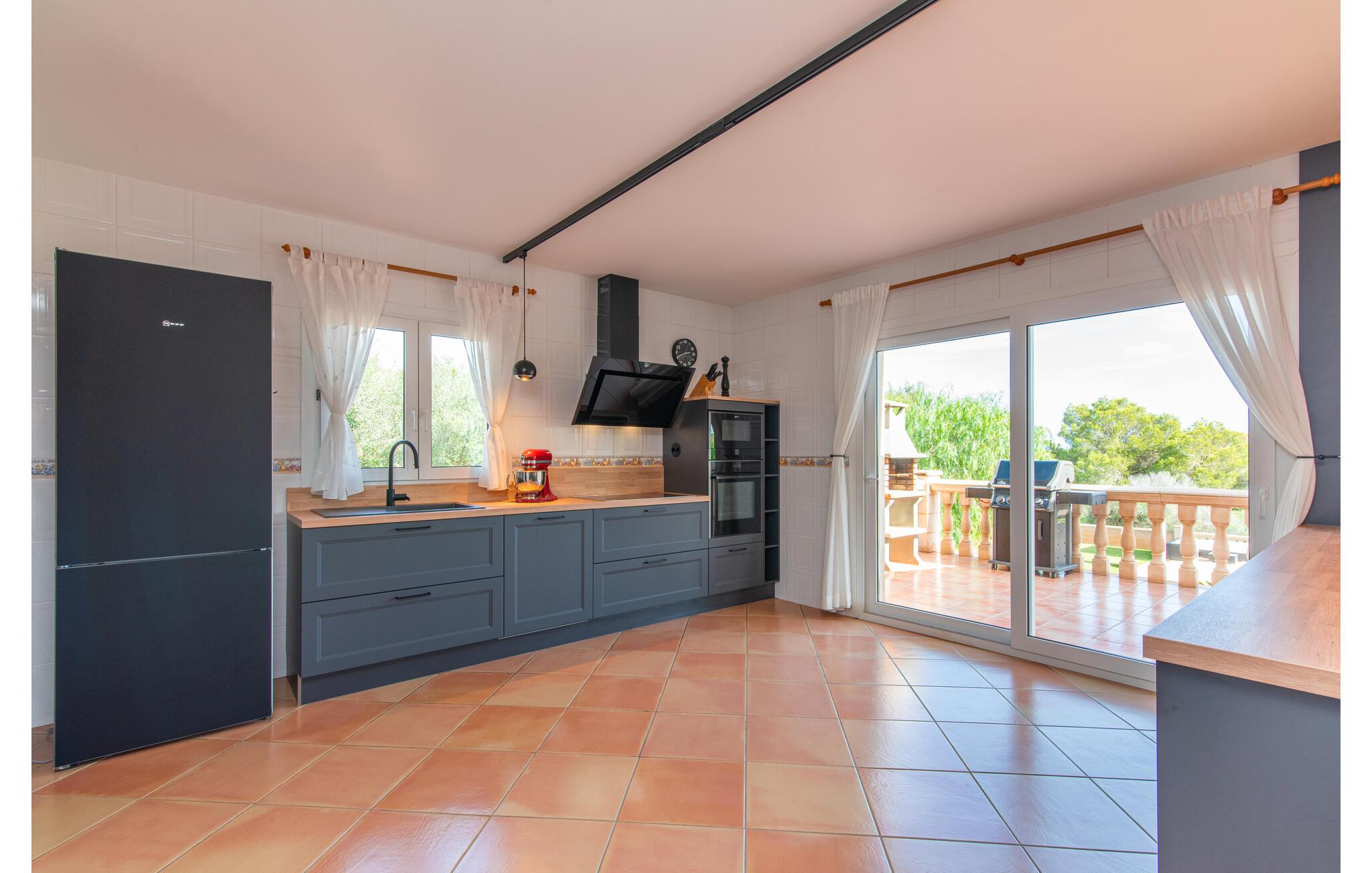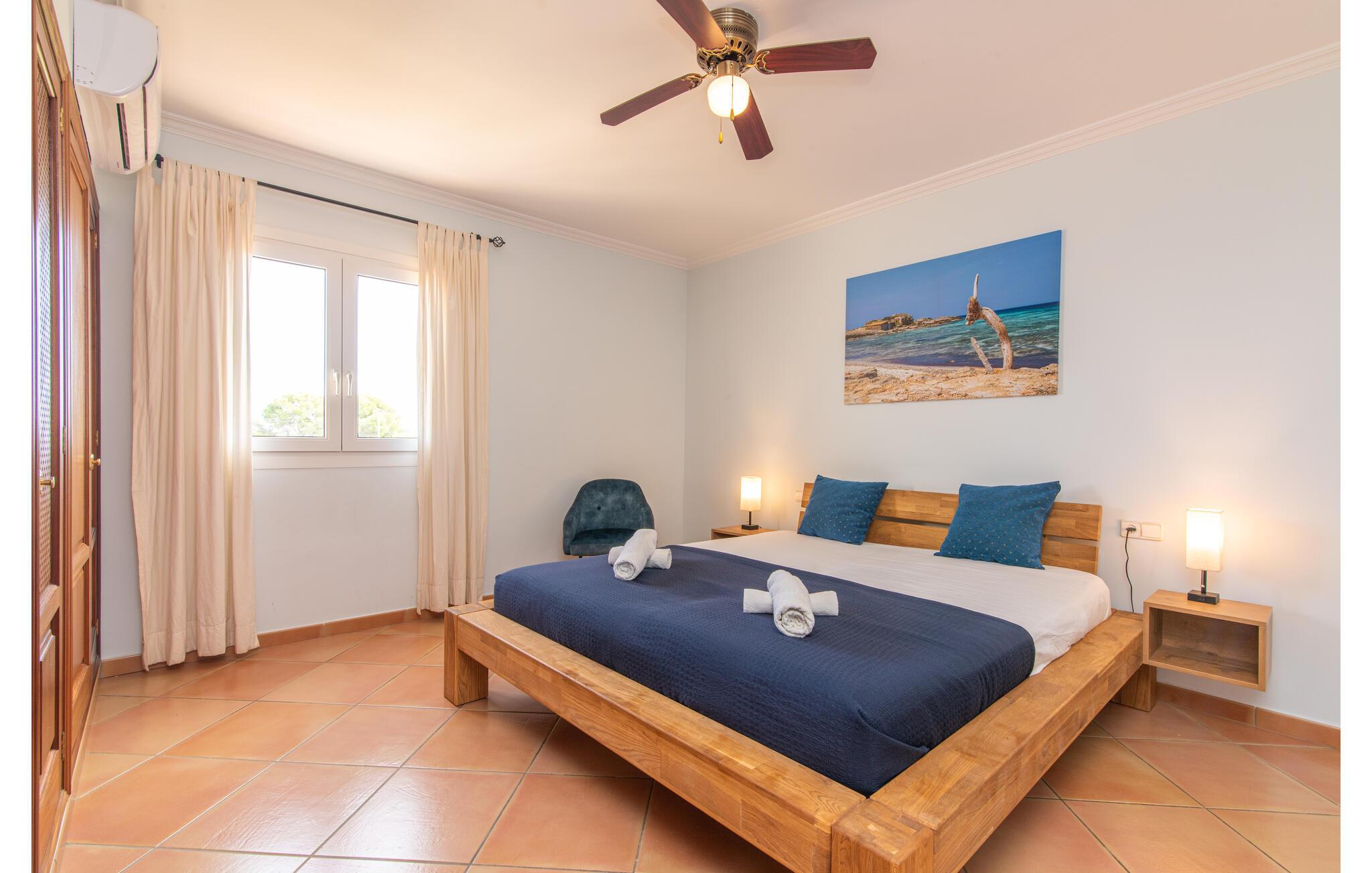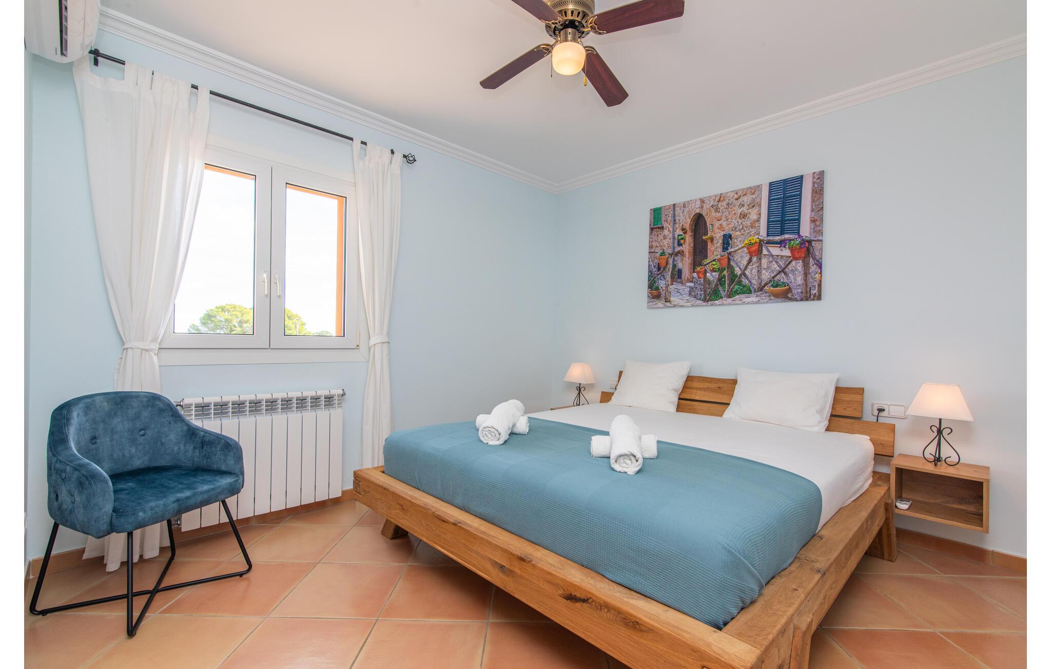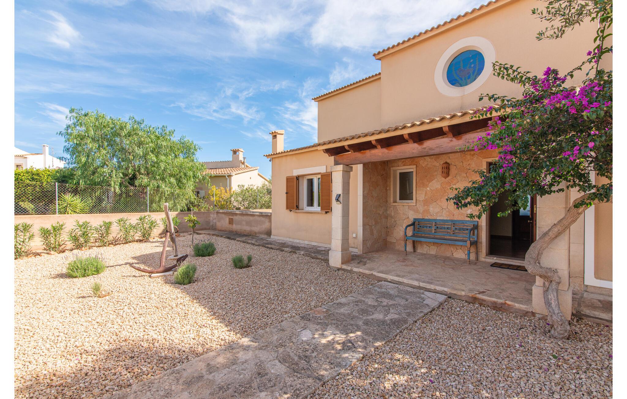 Den smukke "Dues Illes" ligger i udkanten af ??et boligområde. Fra det skønne feriehus kan I nå den særligt velholdte have via en trappe foran den overdækkede terrasse. Ud over græsplæner er der en stor bestand af træer, der giver naturlig skygge og en hyggelig atmosfære. Midtpunktet i komplekset er naturligvis den flisebelagte pool med liggestole, trendy halmparasoller og en hyggelig chill-out lounge. Et romantisk siddeområde under skyggefulde træer lægger op til at læse eller fungerer som et luftigt havekontor. Vil I være aktiv, kan I gøre det med bordtennis, vandpolo, basketball eller volleyball. Den store overdækkede terrasse med spisebord og to grillstationer - en murstensgrill med kul og en mobil gasgrill - byder på en vidunderlig udsigt til hyggelige måltider.