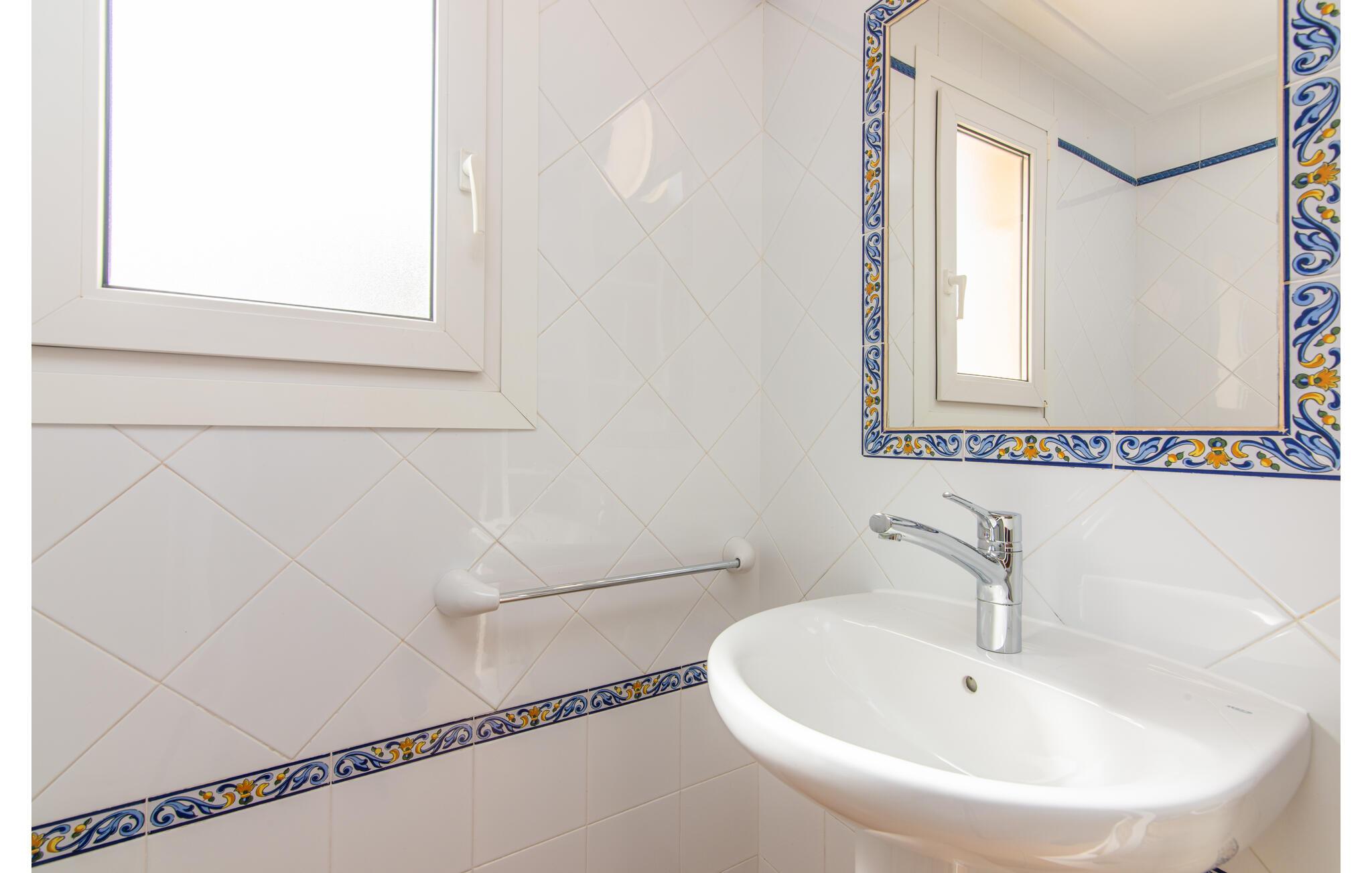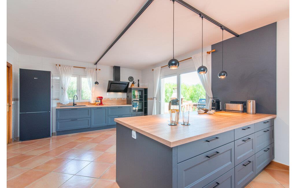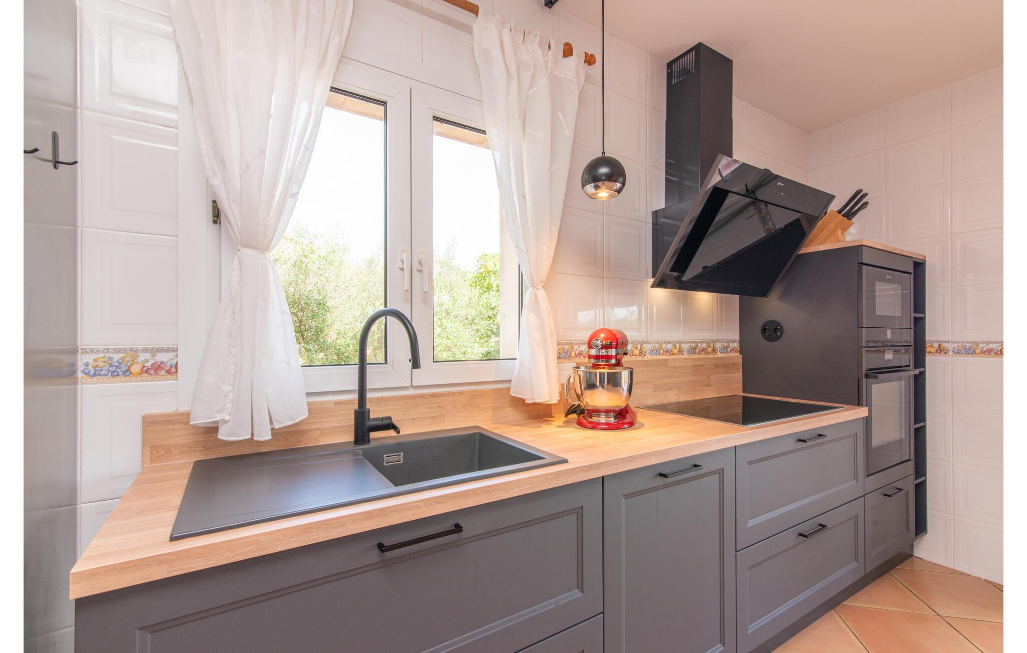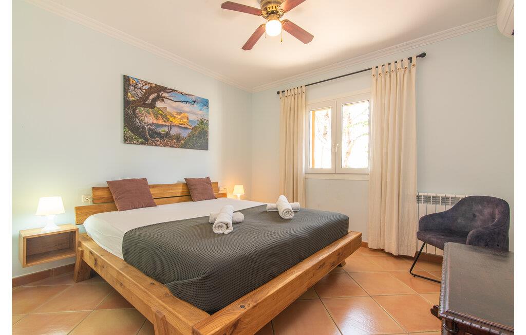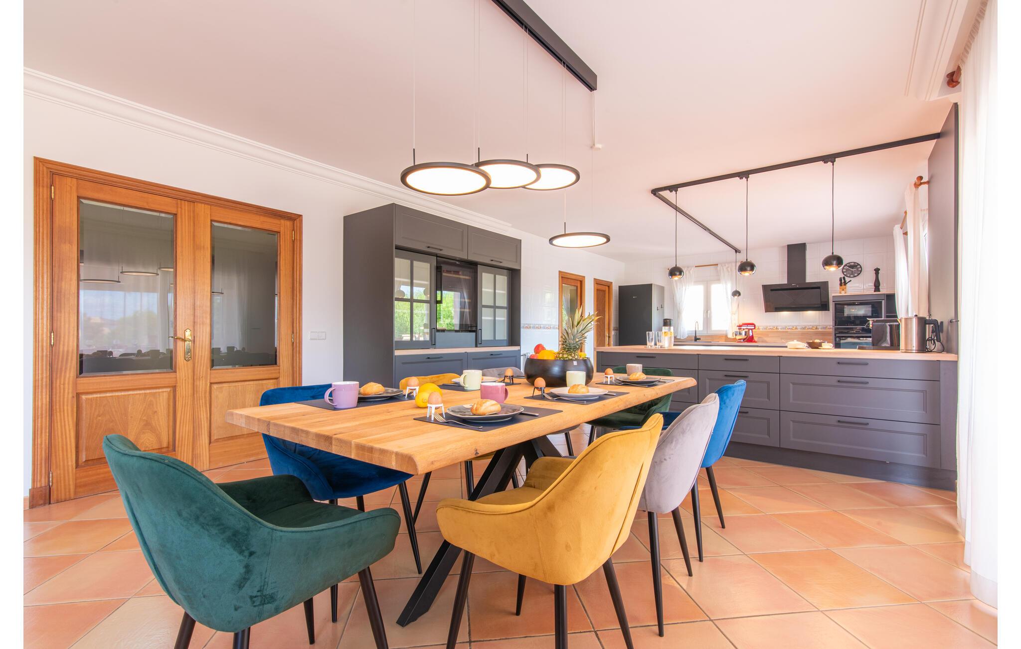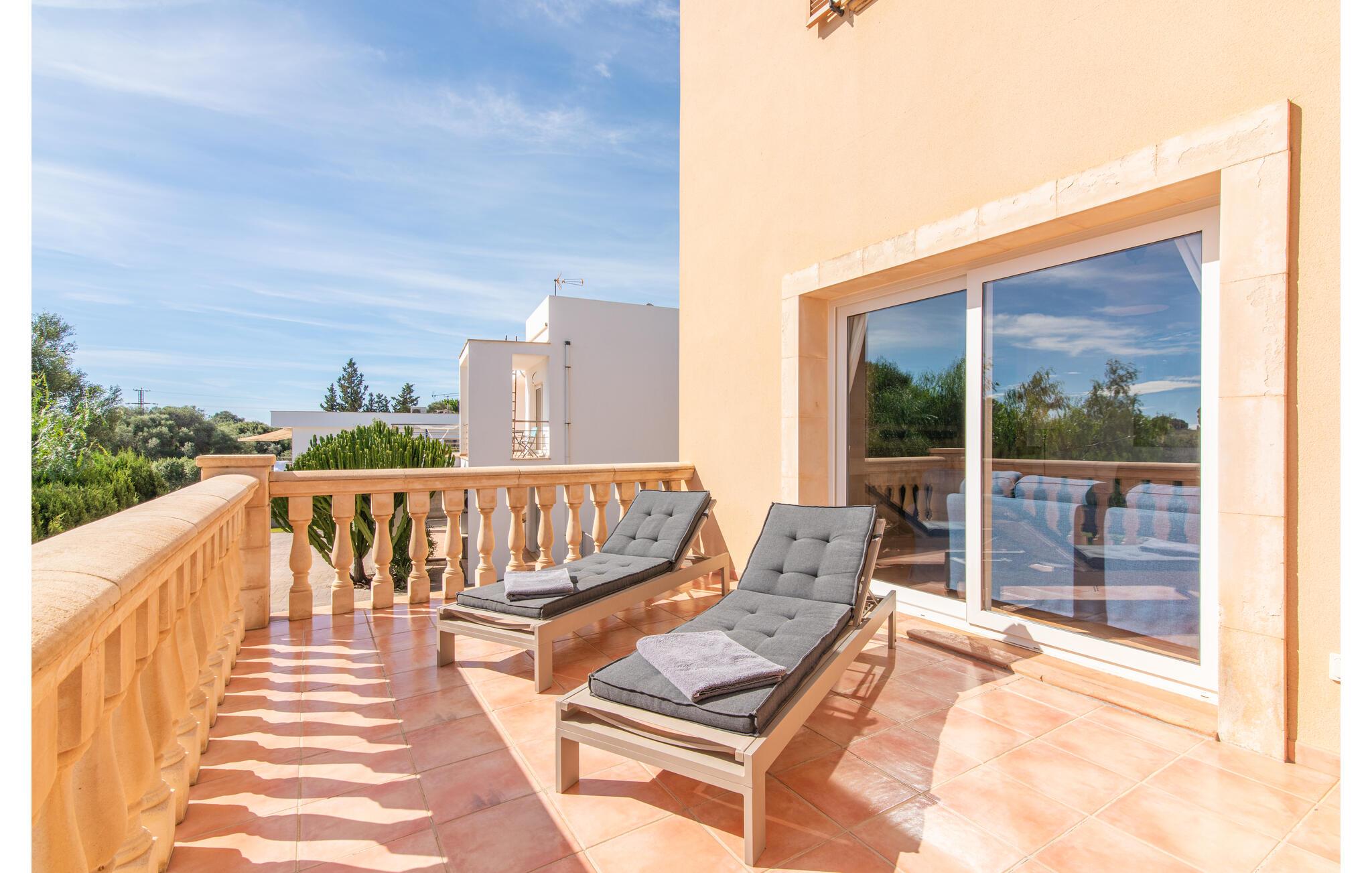 Den smukke "Dues Illes" ligger i udkanten af ??et boligområde. Fra det skønne feriehus kan I nå den særligt velholdte have via en trappe foran den overdækkede terrasse. Ud over græsplæner er der en stor bestand af træer, der giver naturlig skygge og en hyggelig atmosfære. Midtpunktet i komplekset er naturligvis den flisebelagte pool med liggestole, trendy halmparasoller og en hyggelig chill-out lounge. Et romantisk siddeområde under skyggefulde træer lægger op til at læse eller fungerer som et luftigt havekontor. Vil I være aktiv, kan I gøre det med bordtennis, vandpolo, basketball eller volleyball. Den store overdækkede terrasse med spisebord og to grillstationer - en murstensgrill med kul og en mobil gasgrill - byder på en vidunderlig udsigt til hyggelige måltider.
