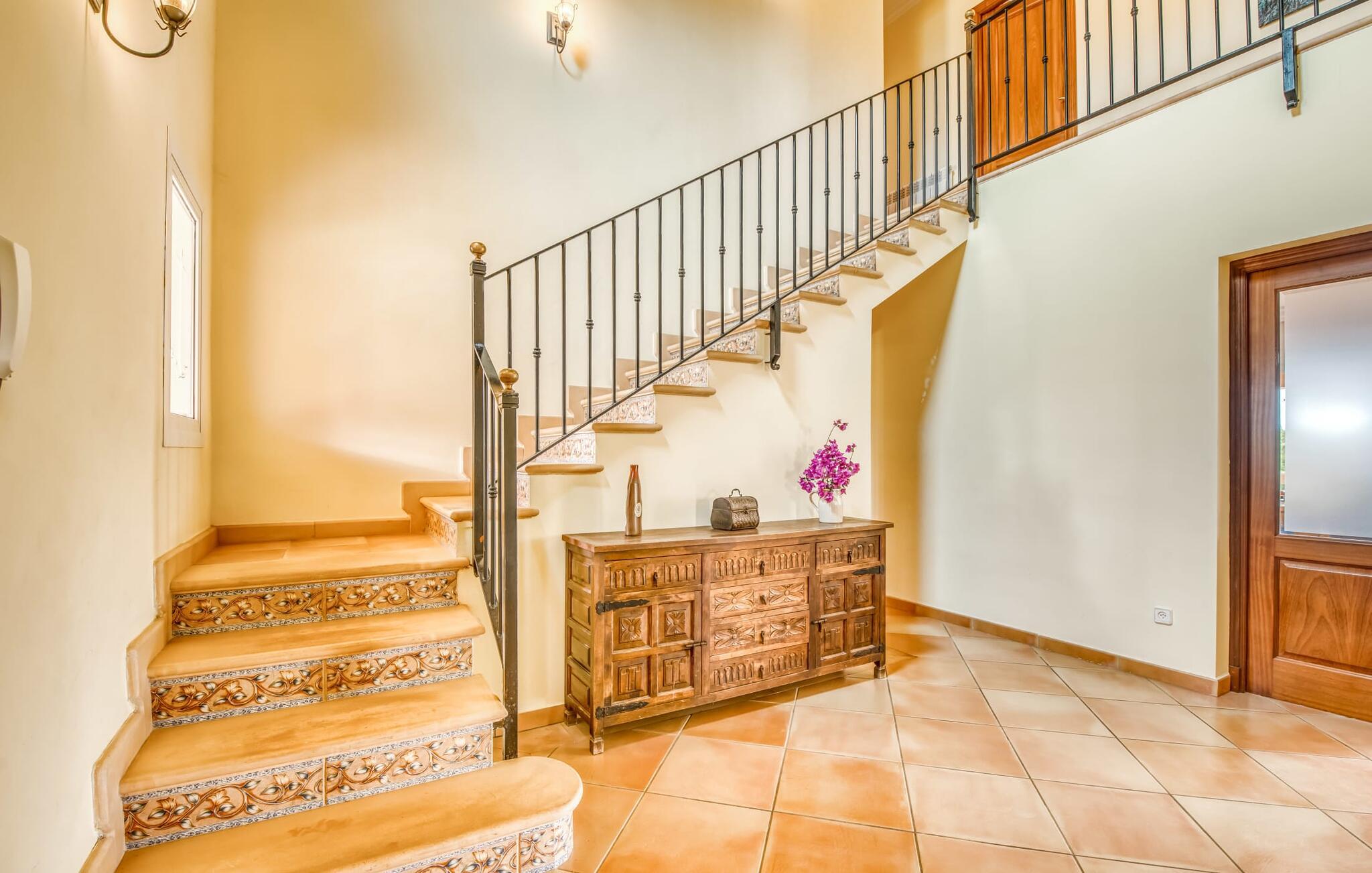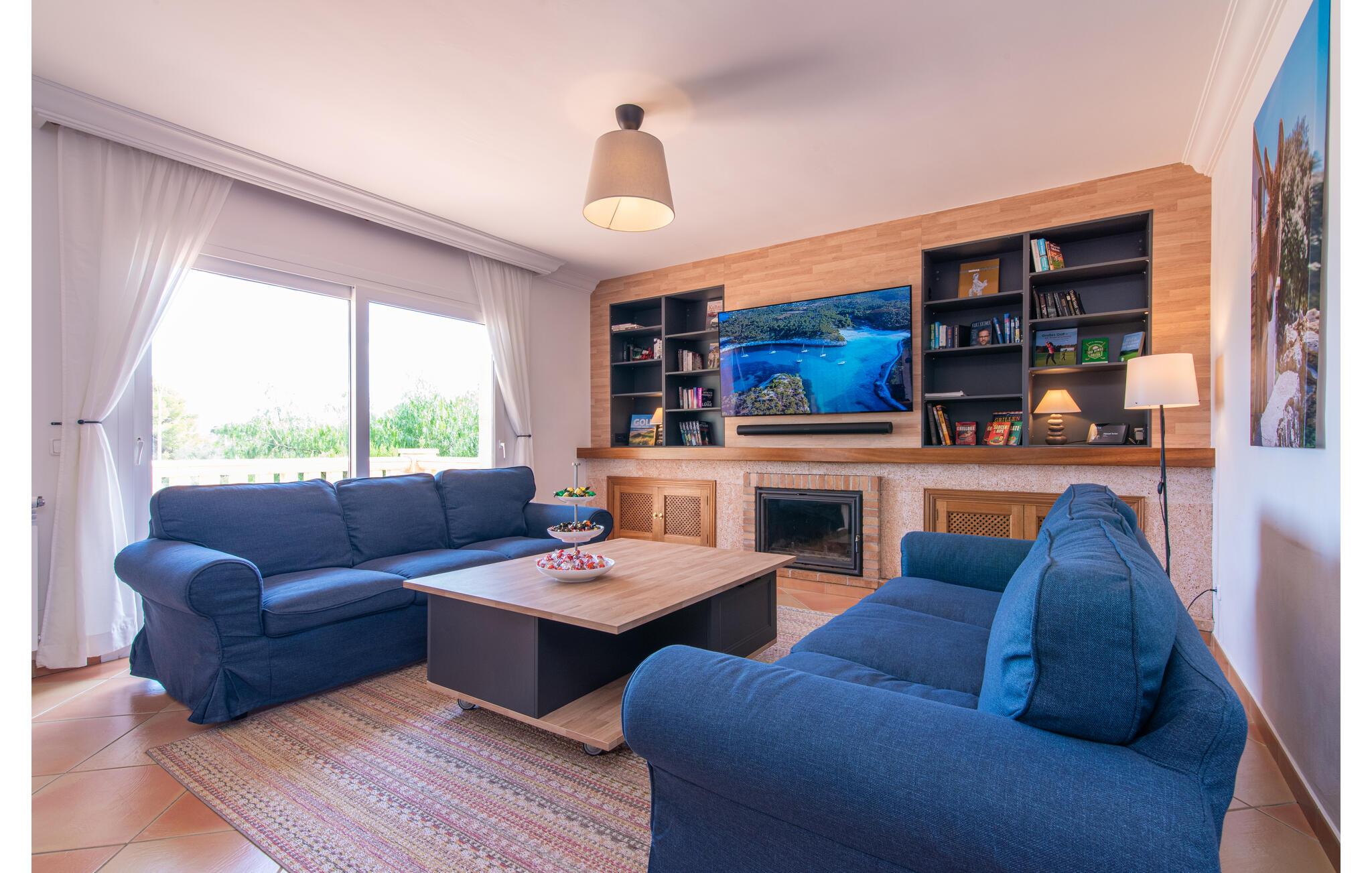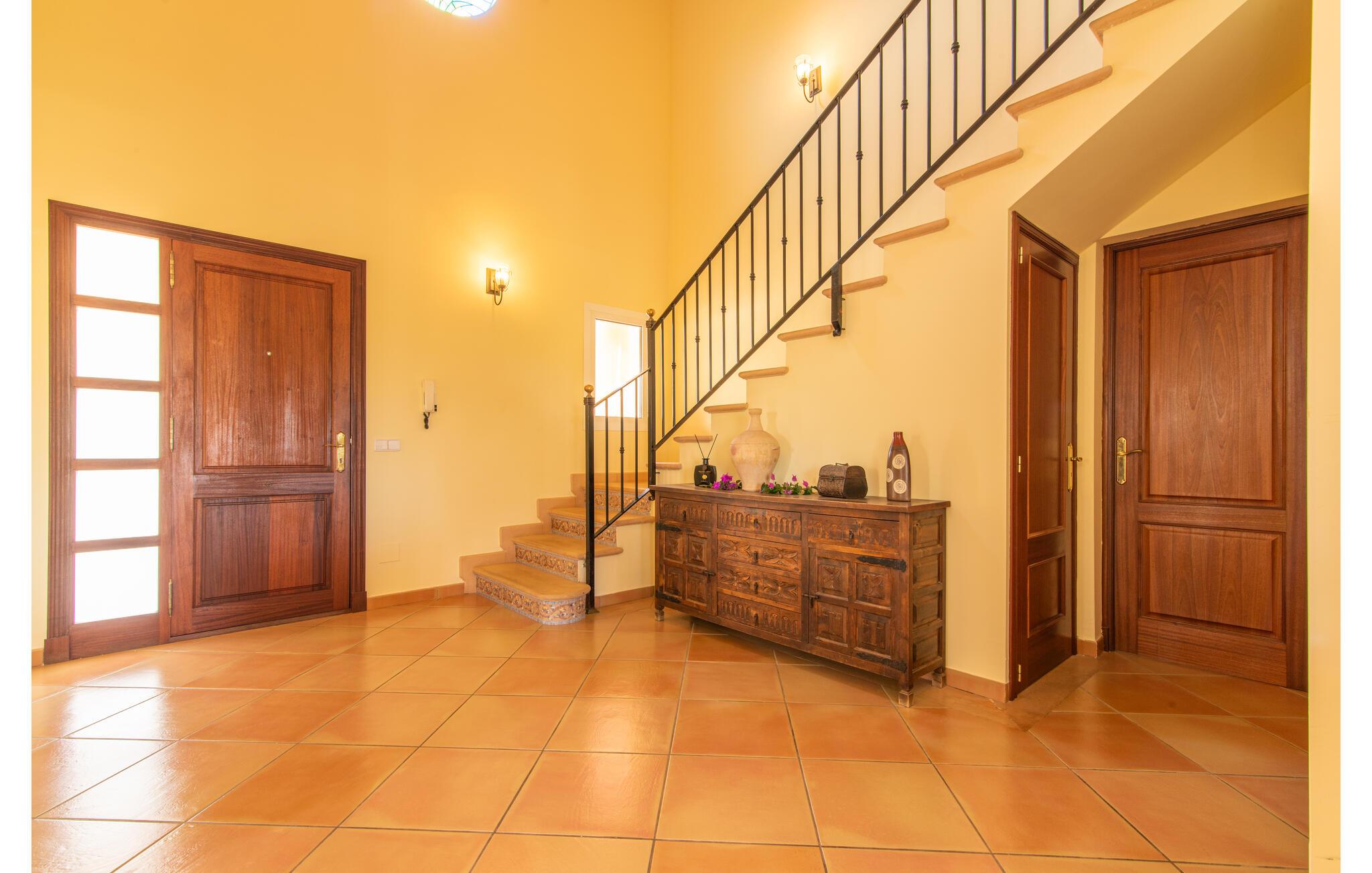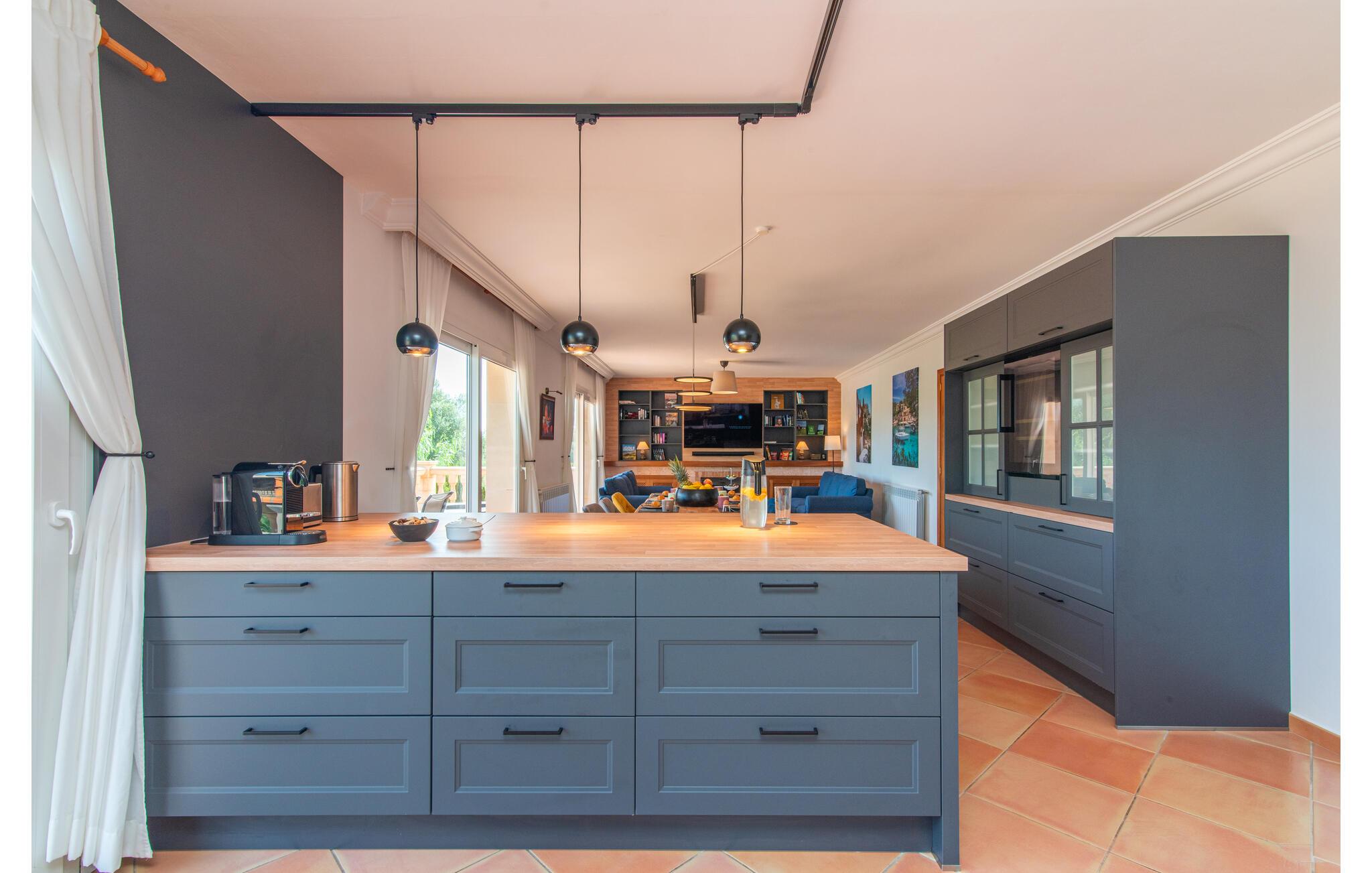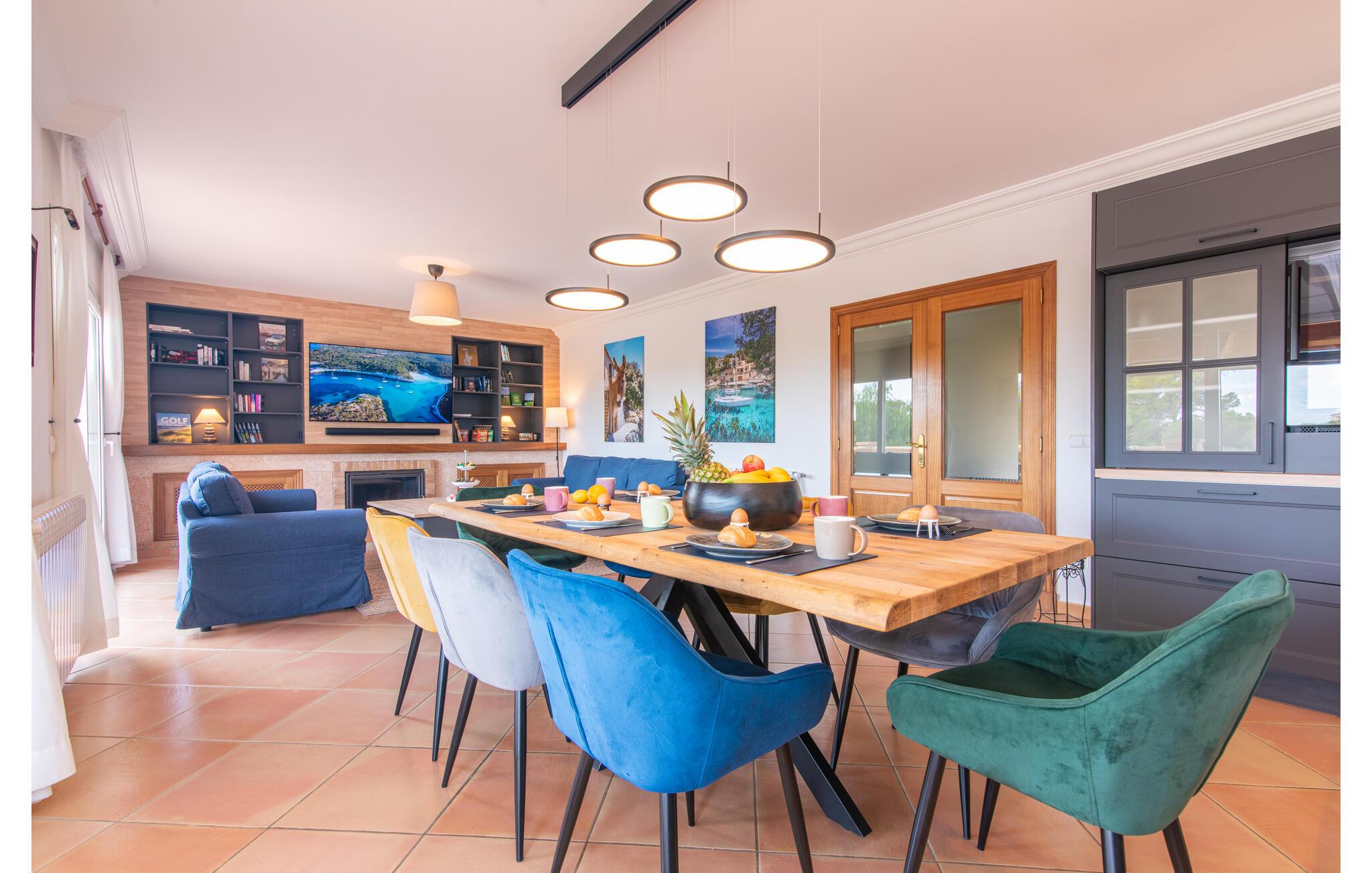 Terrassen leder direkte ind i den rummelige opholds- og spisestue, som er dejlig lys takket være de brede gulv-til-loft glasfronter. Det trendy sofaområde har en indbygget pejs og et stort LED-tv. Midt i rummet er spisepladsen med sit stilfulde bord, hvorfra man kan nyde udsigten udenfor. Det moderne åbne køkken med udstyr af høj kvalitet og mange ekstraudstyr som Thermomix, induktion, dampkoger og vinkøleskab har også direkte udgang til den store terrasse. En anden stue med TV samt et af de fire soveværelser og et brusebad er også i stueetagen. En trappe fører jer til øverste etage, hvor der er yderligere tre soveværelser, hver med eget badeværelse. E-dart, forskellige tysksprogede bøger, brætspil og en WII-spilkonsol afrunder underholdningsudstyret i denne villa på Mallorca. Og med den gratis lejecykel kan I nemt få morgensandwich om morgenen.
