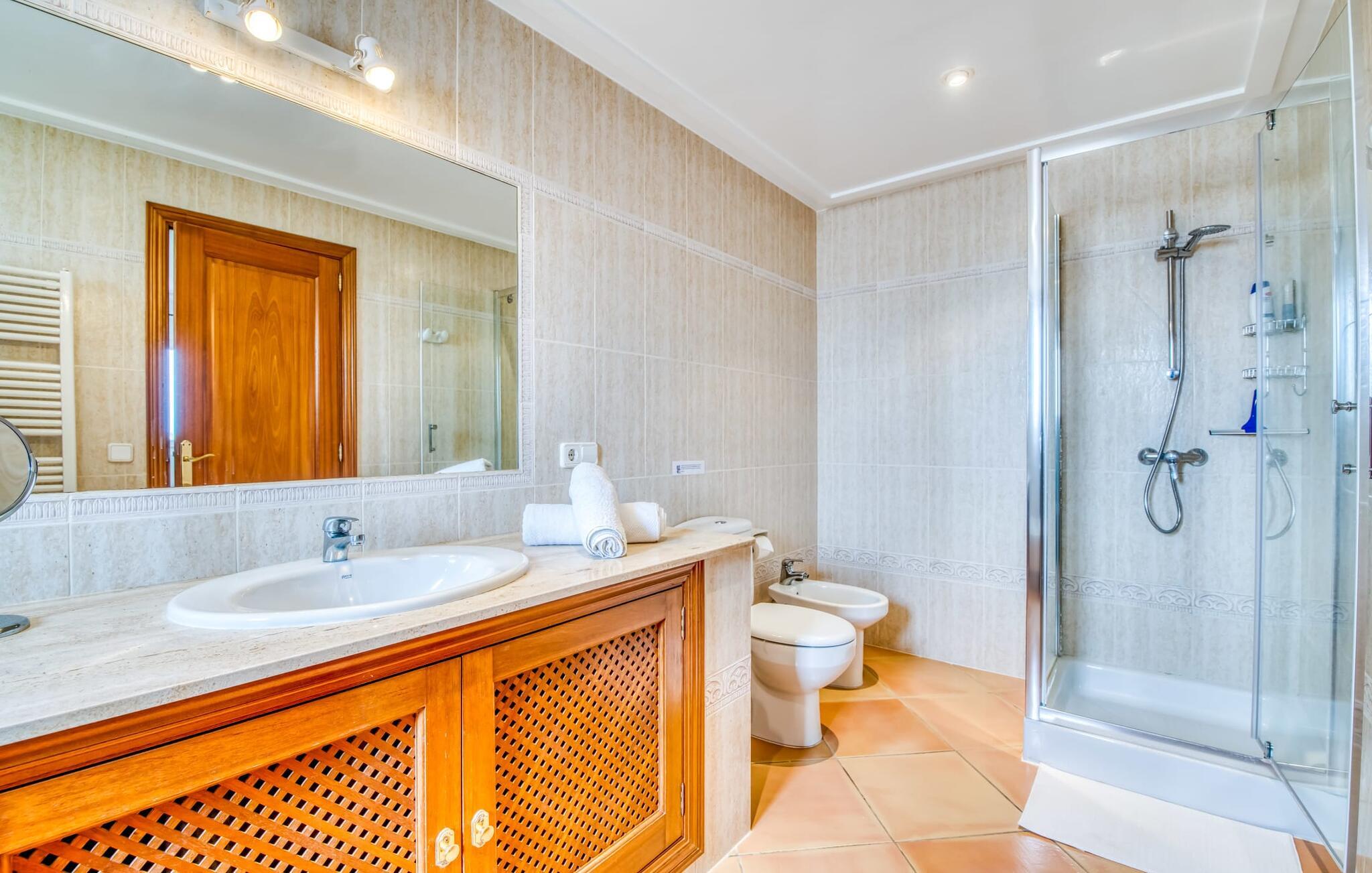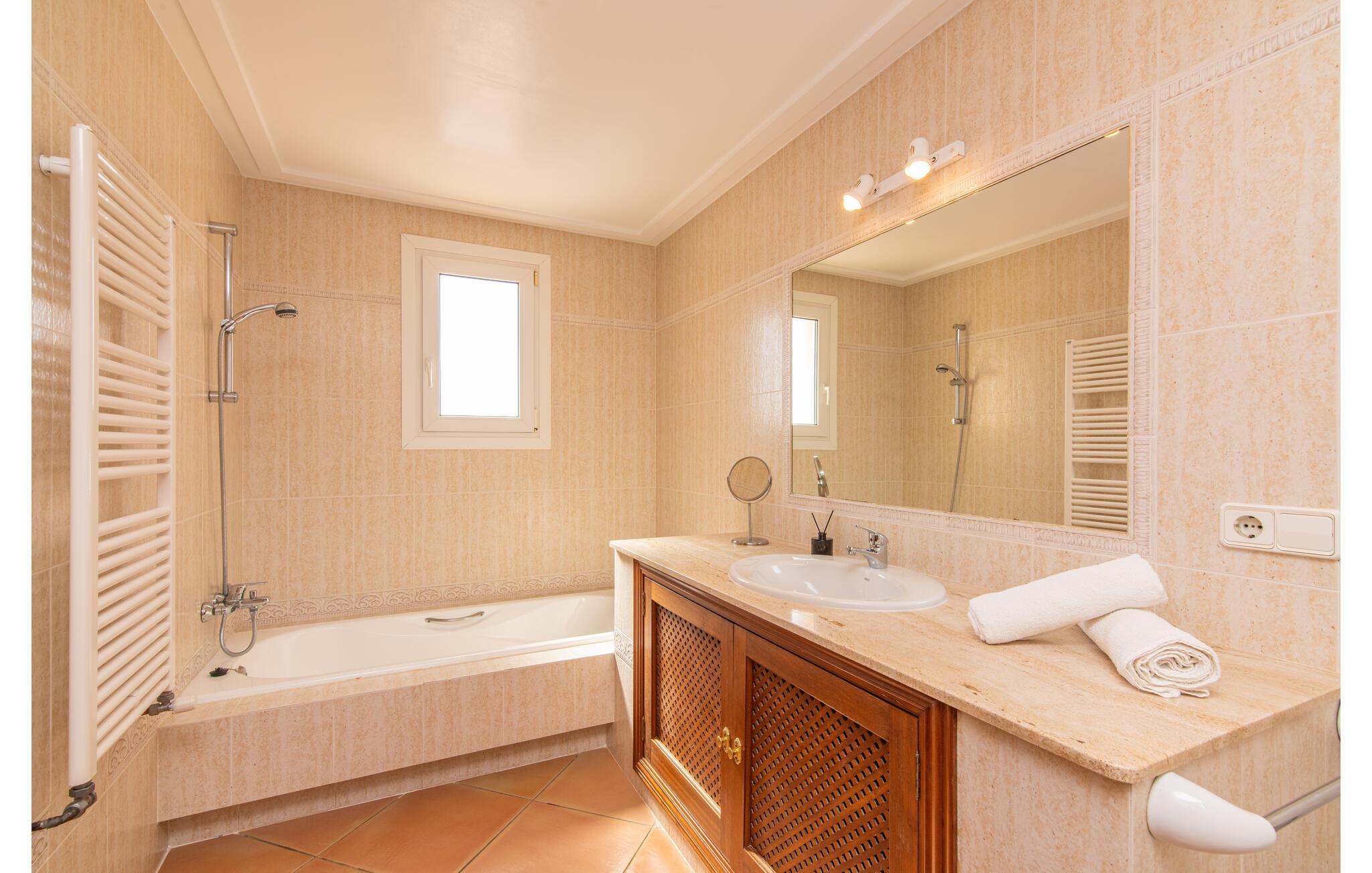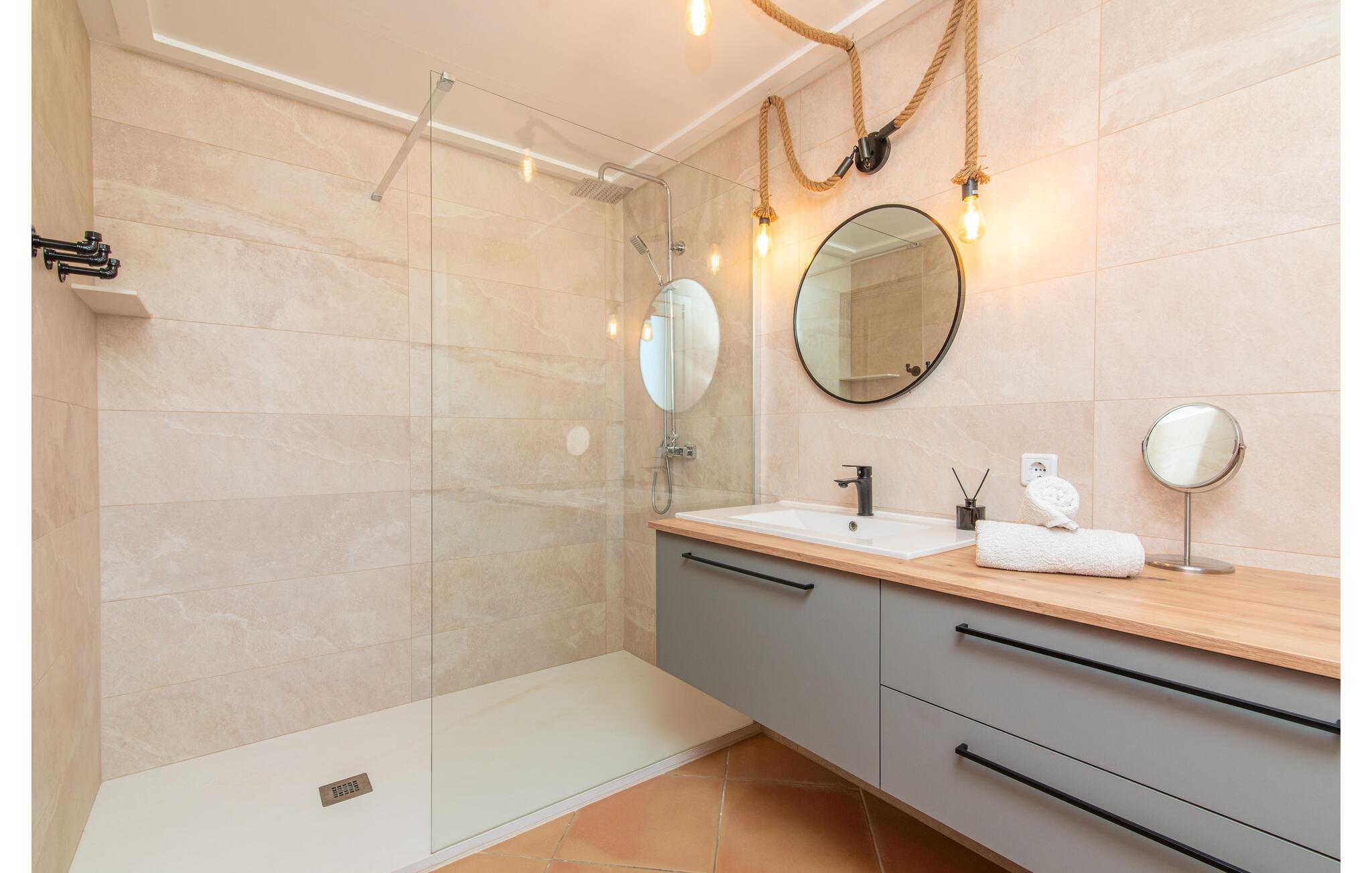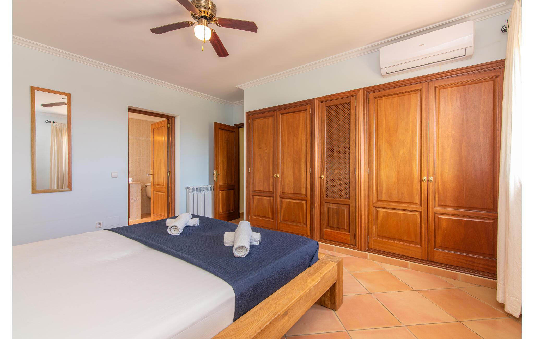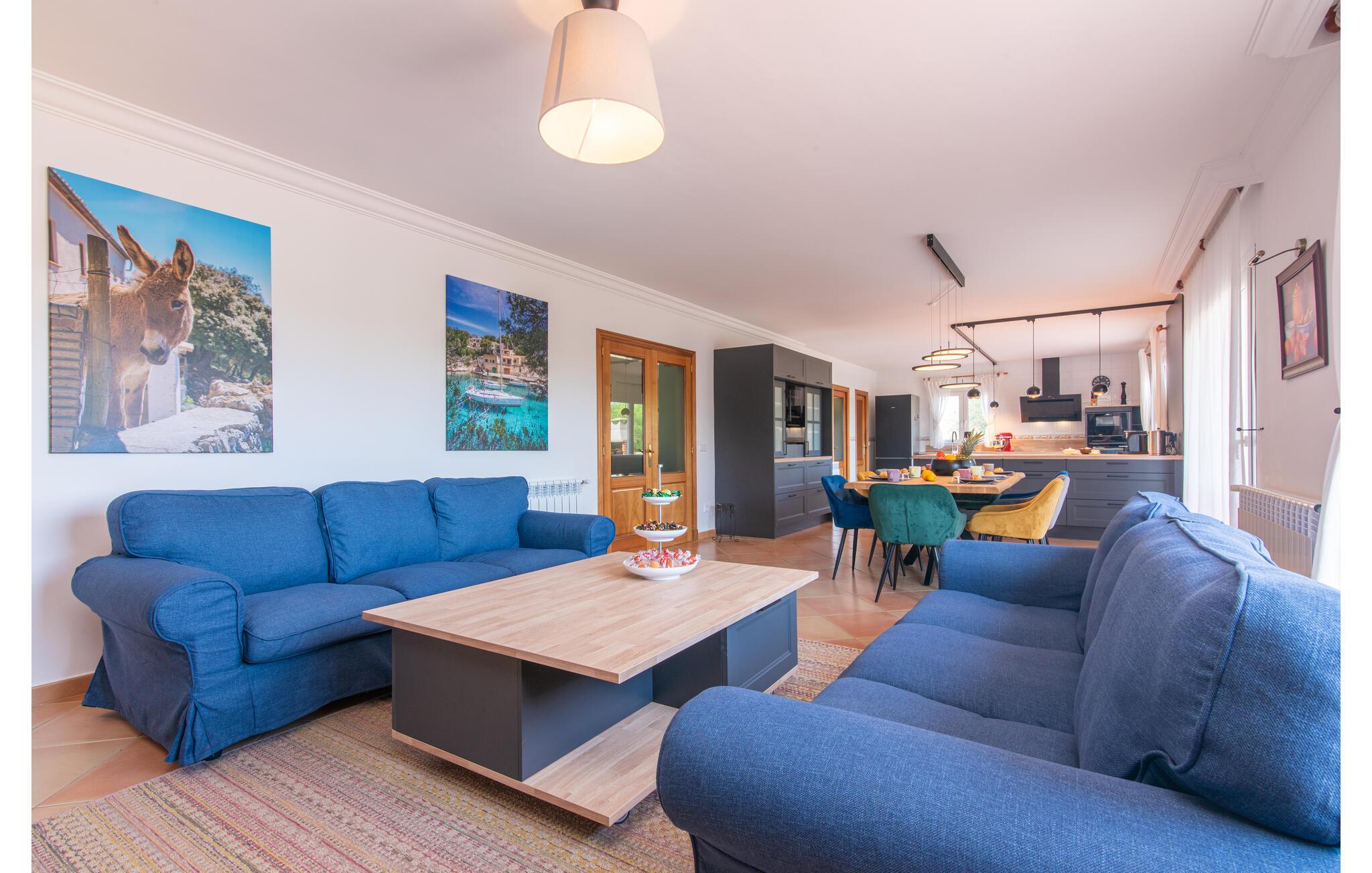 Terrassen leder direkte ind i den rummelige opholds- og spisestue, som er dejlig lys takket være de brede gulv-til-loft glasfronter. Det trendy sofaområde har en indbygget pejs og et stort LED-tv. Midt i rummet er spisepladsen med sit stilfulde bord, hvorfra man kan nyde udsigten udenfor. Det moderne åbne køkken med udstyr af høj kvalitet og mange ekstraudstyr som Thermomix, induktion, dampkoger og vinkøleskab har også direkte udgang til den store terrasse. En anden stue med TV samt et af de fire soveværelser og et brusebad er også i stueetagen. En trappe fører jer til øverste etage, hvor der er yderligere tre soveværelser, hver med eget badeværelse. E-dart, forskellige tysksprogede bøger, brætspil og en WII-spilkonsol afrunder underholdningsudstyret i denne villa på Mallorca. Og med den gratis lejecykel kan I nemt få morgensandwich om morgenen.