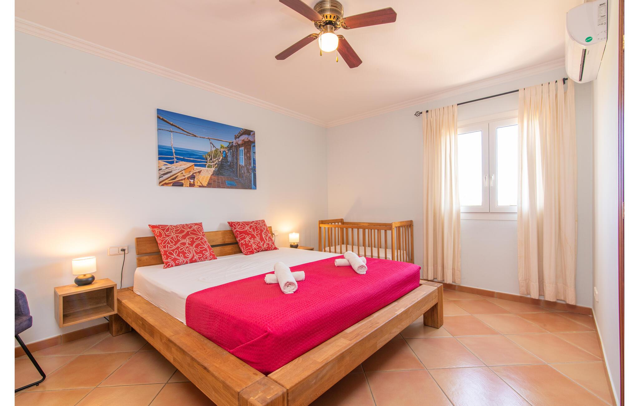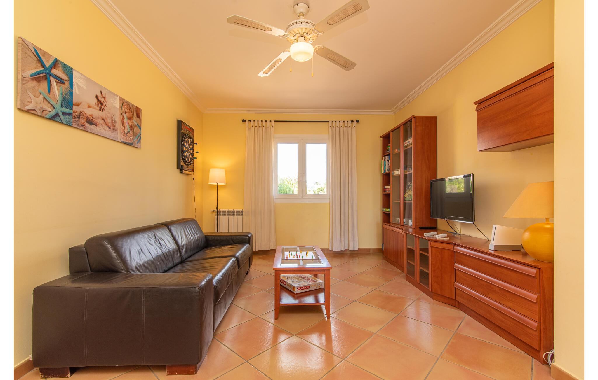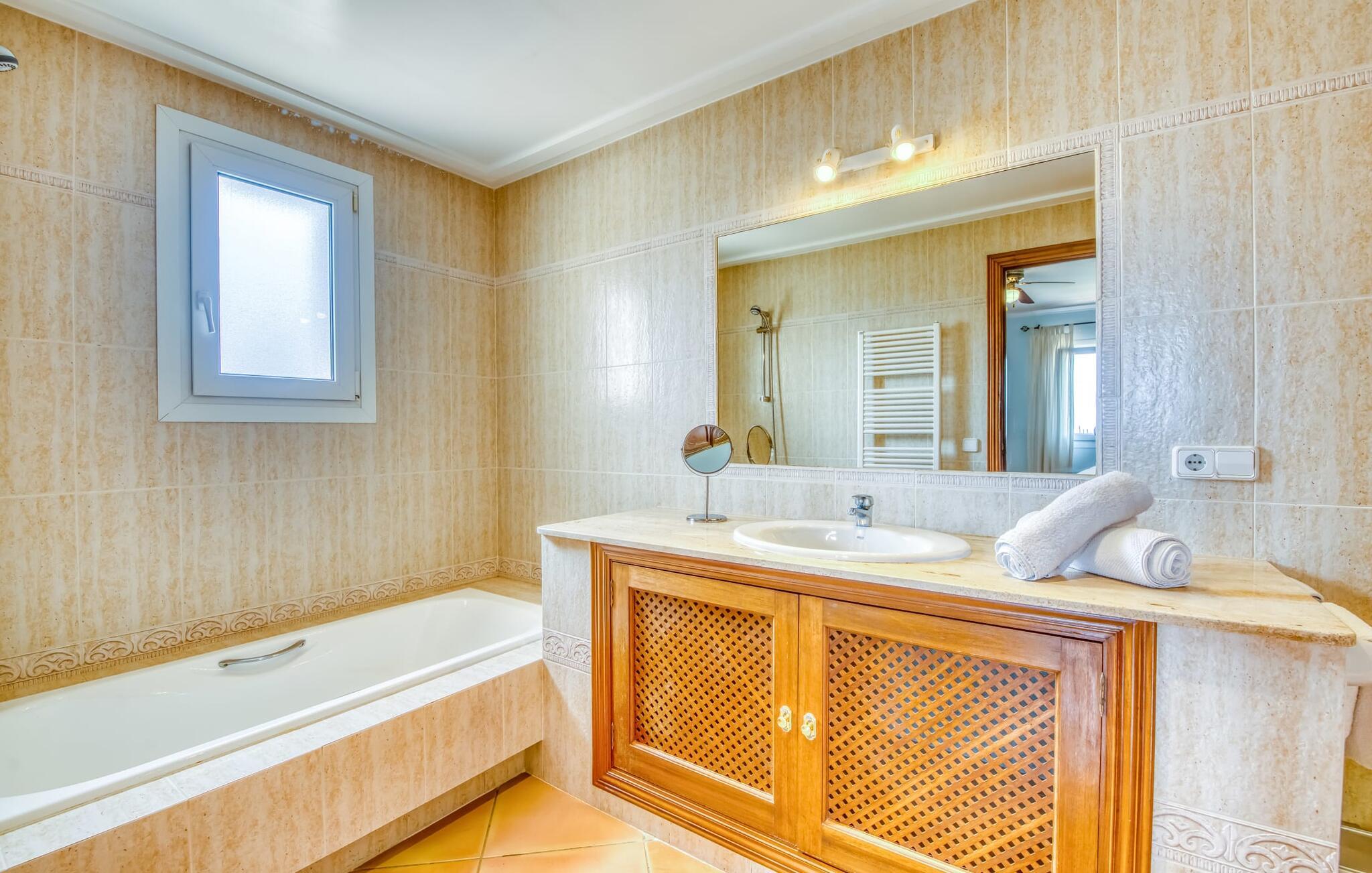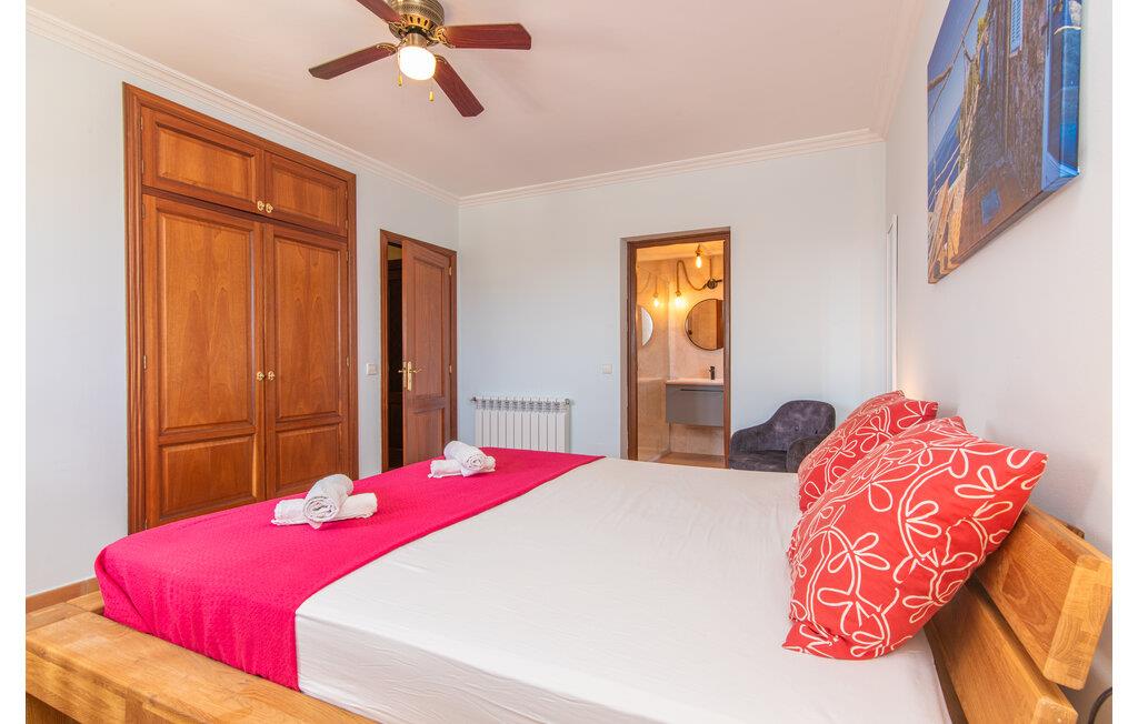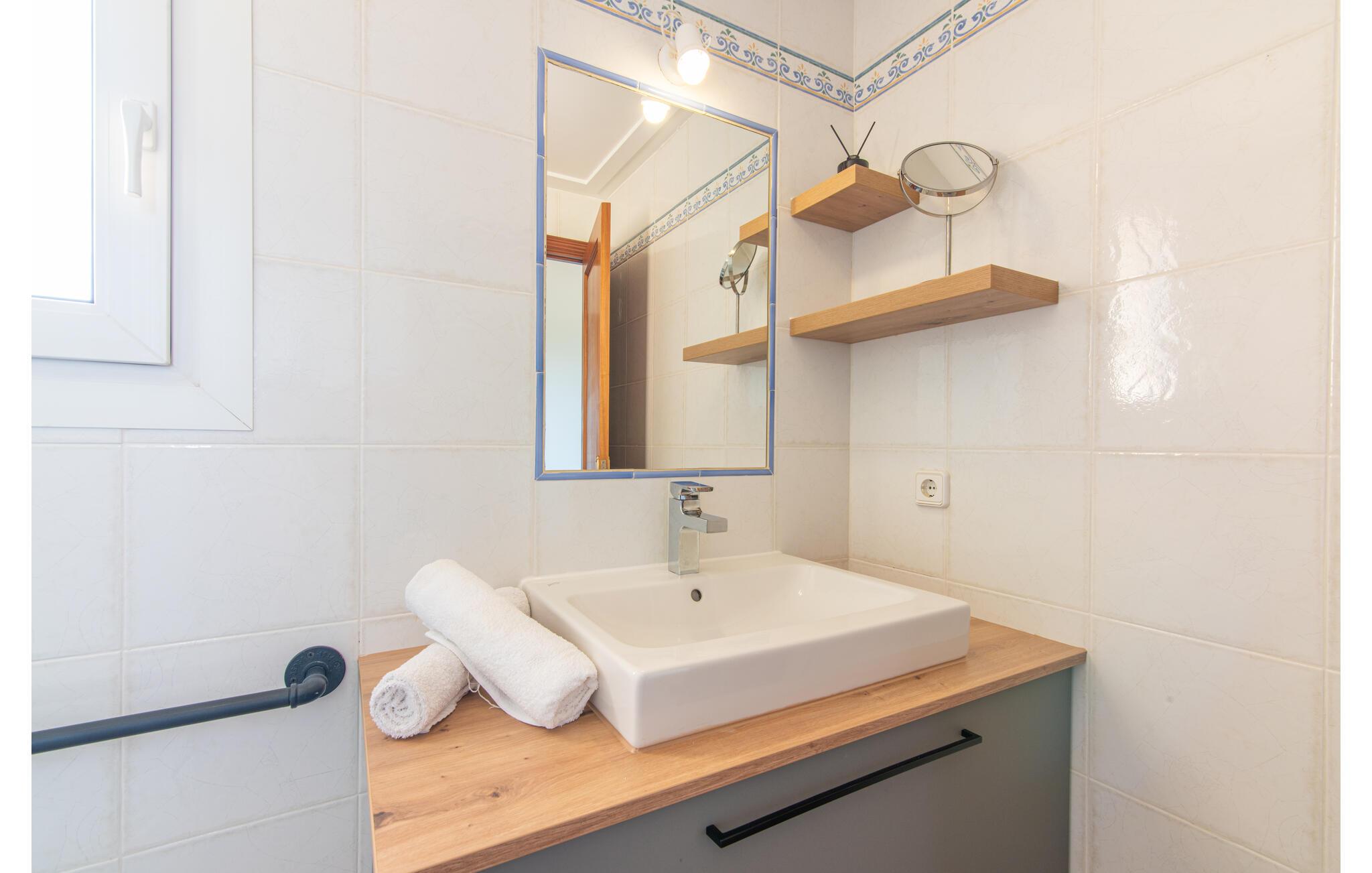 Terrassen leder direkte ind i den rummelige opholds- og spisestue, som er dejlig lys takket være de brede gulv-til-loft glasfronter. Det trendy sofaområde har en indbygget pejs og et stort LED-tv. Midt i rummet er spisepladsen med sit stilfulde bord, hvorfra man kan nyde udsigten udenfor. Det moderne åbne køkken med udstyr af høj kvalitet og mange ekstraudstyr som Thermomix, induktion, dampkoger og vinkøleskab har også direkte udgang til den store terrasse. En anden stue med TV samt et af de fire soveværelser og et brusebad er også i stueetagen. En trappe fører jer til øverste etage, hvor der er yderligere tre soveværelser, hver med eget badeværelse. E-dart, forskellige tysksprogede bøger, brætspil og en WII-spilkonsol afrunder underholdningsudstyret i denne villa på Mallorca. Og med den gratis lejecykel kan I nemt få morgensandwich om morgenen.